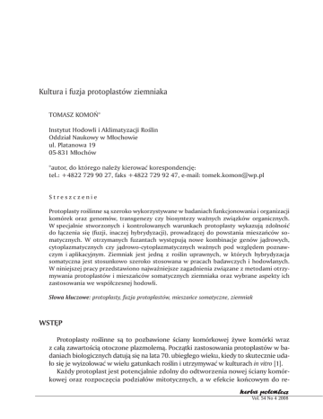 Kultura i fuzja protoplastów ziemniaka 187 Kultura i fuzja protoplastów ziemniaka TOMASZ KOMOŃ* Instytut Hodowli i Aklimatyzacji Roślin Oddział Naukowy w Młochowie ul. Platanowa 19 05-831 Młochów *autor, do którego należy kierować korespondencję: tel.: +4822 729 90 27, faks +4822 729 92 47, e-mail: [email protected] Streszczenie Protoplasty roślinne są szeroko wykorzystywane w badaniach funkcjonowania i organizacji komórek oraz genomów, transgenezy czy biosyntezy ważnych związków organicznych. W specjalnie stworzonych i kontrolowanych warunkach protoplasty wykazują zdolność do łączenia się (fuzji, inaczej hybrydyzacji), prowadzącej do powstania mieszańców somatycznych. W otrzymanych fuzantach występują nowe kombinacje genów jądrowych, cytoplazmatycznych czy jądrowo-cytoplazmatycznych ważnych pod względem poznawczym i aplikacyjnym. Ziemniak jest jedną z roślin uprawnych, w których hybrydyzacja somatyczna jest stosunkowo szeroko stosowana w pracach badawczych i hodowlanych. W niniejszej pracy przedstawiono najważniejsze zagadnienia związane z metodami otrzymywania protoplastów i mieszańców somatycznych ziemniaka oraz wybrane aspekty ich zastosowania we współczesnej hodowli. Słowa kluczowe: protoplasty, fuzja protoplastów, mieszańce somatyczne, ziemniak WSTĘP Protoplasty roślinne są to pozbawione ściany komórkowej żywe komórki wraz z całą zawartością otoczone plazmolemą. Początki zastosowania protoplastów w badaniach biologicznych datują się na lata 70. ubiegłego wieku, kiedy to skutecznie udało się je wyizolować w wielu gatunkach roślin i utrzymywać w kulturach in vitro [1]. Każdy protoplast jest potencjalnie zdolny do odtworzenia nowej ściany komórkowej oraz rozpoczęcia podziałów mitotycznych, a w efekcie końcowym do reVol. 54 No 4 2008 T. Komoń 188 generacji w funkcjonalną i płodną roślinę. Dzięki tym właściwościom protoplasty stały się ważnym narzędziem badań struktury i funkcjonowania komórki oraz genomu roślin. Obecnie protoplasty wykorzystuje się rutynowo w laboratoriach na całym świecie w pracach z zakresu genomiki, proteomiki, metabolomiki, a także w nowoczesnej hodowli roślin uprawnych [2]. Ziemniak (Solanum tuberosum L.) pochodzi z Ameryki Południowej. Stamtąd upowszechnił się na całej kuli ziemskiej i obecnie uprawiany jest w ponad 125 krajach na świecie. Ziemniak jest zdrowym pokarmem zawierającym skrobię, pełnowartościowe białka, witaminę C, witaminy z grupy B oraz wiele niezbędnych składników mineralnych. Ocenia się, że ziemniak stanowi podstawę diety ponad miliarda ludzi na całym świecie, a odsetek jego konsumentów wciąż rośnie, szczególnie w Azji (Chiny, Indie) oraz Afryce. Skrobia znajduje zastosowanie w produkcji dekstryn, hydrolizatów, syropów, glukozy oraz krochmalu modyfikowanego. Wraz z etanolem są obecnie dwoma najważniejszymi produktami przetwarzania ziemniaka stosowanymi w przemyśle spożywczym, papierniczym, włókienniczym, farmaceutycznym, kosmetycznym i chemicznym. Etanol jest również wykorzystywany jako dodatek do paliw [3]. Znaczenie gospodarcze ziemniaka ma wpływ na zainteresowanie nim przedstawicieli różnych dyscyplin naukowych, w tym szczególnie szeroko rozumianej biotechnologii. Zastosowanie technik molekularnych pozwoliło lepiej zrozumieć i poznać strukturę i funkcjonowanie komórki oraz genomu ziemniaka. Biotechnologia umożliwiła również postęp we wprowadzaniu interesujących genów z różnych gatunków w ogólną pulę genową S. tuberosum. Ziemniak był jedną z pierwszych roślin uprawnych, w której z powodzeniem wprowadzono do badań protoplasty. Protoplasty i ich hybrydyzacja pozwoliły na wykorzystanie w hodowli S. tuberosum zasobów genowych dzikich gatunków z rodzaju Solanum, spokrewnionych z ziemniakiem uprawnym, ale się z nim nie krzyżujących, z pominięciem naturalnych barier krzyżowalności [4]. IZOLACJA PROTOPLASTÓW Na początkowym etapie rozwoju kultur in vitro stosowano mechaniczną izolację protoplastów, polegającą na plazmolizie tkanki, a następnie na rozdrabnianiu jej skalpelem lub igłą preparacyjną pod mikroskopem. Obecnie technika ta praktycznie nie jest stosowana, ponieważ jest mało wydajna i powoduje liczne uszkodzenia komórek [5]. Mechaniczna izolacja protoplastów zastąpiona została metodą enzymatyczną, którą opracował Cocking [6], i która z małymi modyfikacjami, zależnymi od badanego gatunku rośliny, stosowana jest do dziś. Polega ona na wytrawieniu odpowiednimi enzymami ściany komórkowej bez naruszenia plazmolemy oraz cytoplazmy i jej zawartości. Cały proces enzymatycznej izolacji protoplastów odbywa się w kolejno następujących po sobie etapach: (i) przygotowania roślin rodzicielskich, (ii) przygotowania tkanki roślinnej, (iii) trawienia en- Kultura i fuzja protoplastów ziemniaka 189 zymatycznego, (iv) właściwej izolacji oraz (v) określenia żywotności otrzymanych protoplastów. Materiał wyjściowy do izolacji protoplastów stanowią aseptyczne rośliny wyprowadzone z kultur in vitro [7]. Protoplasty można również izolować z roślin rosnących w szklarni lub w polu. Jednak nie jest to wskazane, ponieważ zmienne czynniki zewnętrzne oraz sterylizacja roślin silnie obniżają jakość otrzymywanych z nich protoplastów [8]. Protoplasty ziemniaka są najczęściej izolowane z mezofilu liści, rzadziej natomiast z hypokotyli, liścieni, siewek, zielonych części pędów, korzeni lub z zawiesiny komórkowej [9,10]. Przygotowanie tkanki roślinnej do izolacji protoplastów polega na stabilizacji komórek w procesach plazmolizy oraz na eliminacji skrobi syntetyzowanej w warunkach świetlnych. W tym celu stosowane są następujące metody: (i) dwudniowa inkubacja liści w roztworach flotujących i kondycjonujących w warunkach ciemności [11], (ii) pozostawienie całych roślin w ciemności na 1–2 doby, a następnie dwu- lub trzygodzinna i