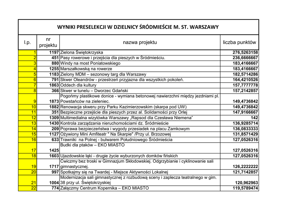 wyniki preselekcji w dzielnicy śródmieście m. st. warszawy