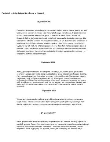 Pamiętnik ze świąt Bożego Narodzenia w Hiszpanii 21 grudzień 2007 Z samego rana mama obudziła mnie na samolot, byłem bardzo śpiący, lecz to był mój ważny dzień, bo mam lecieć do cioci na święta Bożego Narodzenia. O godzinie ósmej siostra zawiozła mnie na lotnisko, gdzie za piętnaście minut mam samolot do Hiszpanii. Bałem się lecieć, ponieważ to był mój pierwszy lot tak dużą maszyną. Gdy ujrzałem na lotnisku samolot nie mogłem uwierzyć, że tak duża maszyna uniesie się w powietrze. Podróż była ciekawa, mogłem oglądać z lotu ptaka ziemię i ludzi, którzy wydawali się tak mali. Po czterech godzinach lotu dotarłem na lotniska gdzie czekała na mnie ciocia. Serdecznie mnie przywitała, po czym pojechaliśmy do domu który mi się bardzo spodobał.. Kuzyni od razu pokazali mój pokuj, wypakowałem ubrania i ze zmęczenia podróżą poszedłem spać. 22 grudzień 2007 Rano, gdy się obudziłem, nie mogłem uwierzyć, że jestem poza granicami ojczyzny. Ciocia zawołała mnie na śniadanie, które okazało się bardzo pyszne. Gdy nadeszła godzina dziewiąta wszyscy pojechaliśmy do Madrytu na loterię. Kupiliśmy losy, dzięki którym można się wzbogacić. Po kilku minutach wygrywające numery są wyśpiewywane przez dzieci z madryckiej szkoły dla sierot. Były duże emocje, lecz nie udało nam się nic wygrać, ale to była tylko zabawa. Do domu wróciliśmy późnym wieczorem, bo rodzina pokazywała mi piękne zakątki Hiszpanii. 23 grudzień 2007 Wczesnym rankiem pojechaliśmy na wielkie zakupy potrzebne do przygotowania wigilii. Ciocia wraz z nami sprzątała dom i przygotowywała potrawy czas mijał nam bardzo szybko, lecz wszyscy dobrze wypełnili swoje zadanie i byli z tego dumni. 24 grudzień 2007 Rano, gdy wstałem wszystkie potrawy znajdowały się już na stole. Różniły się one od polskich potraw. Zobaczyłem tam: owoce morza, karczochy, migdałową, ryby, indyka i pieczone jagnię oraz szampan, marcepan i słodycze bożonarodzeniowe z miodu i migdałów, które wyglądały tak pysznie, ale najsmaczniejszy był złocisty indyk. Wieczorem przy szopce i choince śpiewaliśmy kolędy, a gdy na niebie pojawiła się pierwsza gwiazda zaczęliśmy świąteczną wigilię. Pod choinką nie było prezentów, zdziwiło mnie to, ale były one rozdawane szóstego grudnia. O północy całą rodziną poszliśmy na pasterkę, która także jest tak piękna jak w Polsce. 25 grudzień 2007 Popołudniu musiałem się pożegnać z rodziną i wracać do polski, z tego powodu stanęły mi łzy w oczach. Ciocia odwiozła mnie na samolot, lecz trudno było rozstać się z bliskimi mi ludźmi.