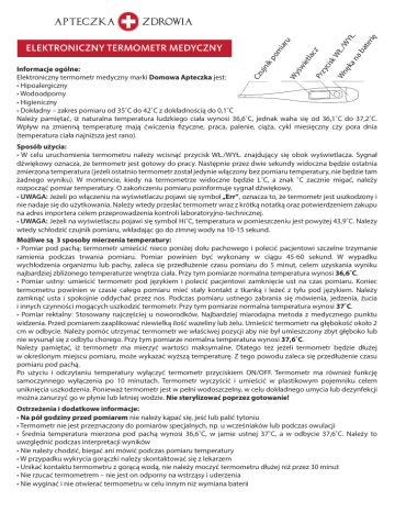 W z Ł./ ię na ka kW iet la c Pr zy cis ujn ik po m ELEKTRONICZNY TERMOMETR MEDYCZNY ba ter YŁ . ZDROWIA iar u apteczka Wn ę W yś w Cz Informacje ogólne: Elektroniczny termometr medyczny marki Domowa Apteczka jest: • Hipoalergiczny • Wodoodporny • Higieniczny • Dokładny – zakres pomiaru od 35˚C do 42˚C z dokładnością do 0,1˚C Należy pamiętać, iż naturalna temperatura ludzkiego ciała wynosi 36,6˚C, jednak waha się od 36,1˚C do 37,2˚C. Wpływ na zmienną temperaturę mają ćwiczenia fizyczne, praca, palenie, ciąża, cykl miesięczny czy pora dnia (temperatura ciała najniższa jest rano). Sposób użycia: • W celu uruchomienia termometru należy wcisnąć przycisk WŁ./WYŁ. znajdujący się obok wyświetlacza. Sygnał dźwiękowy oznacza, że termometr jest gotowy do pracy. Następnie przez dwie sekundy widoczna będzie ostatnia zmierzona temperatura (jeżeli ostatnio termometr został jedynie włączony bez pomiaru temperatury, nie będzie tam żadnego wyniku). W momencie, kiedy na termometrze widoczne będzie L˚C, a znak ˚C zacznie migać, należy rozpocząć pomiar temperatury. O zakończeniu pomiaru poinformuje sygnał dźwiękowy. • UWAGA: Jeżeli po włączeniu na wyświetlaczu pojawi się symbol „Err”, oznacza to, że termometr jest uszkodzony i nie nadaje się do użytkowania. Należy wtedy przesłać termometr wraz z krótką notatką oraz potwierdzeniem zakupu na adres importera celem przeprowadzenia kontroli laboratoryjno-technicznej. • UWAGA: Jeżeli na wyświetlaczu pojawi się symbol Hi˚C, temperatura w pomieszczeniu jest powyżej 43,9˚C. Należy wtedy schłodzić czujnik pomiaru, wkładając go do zimnej wody na 10-15 sekund. Możliwe są 3 sposoby mierzenia temperatury: • Pomiar pod pachą: termometr umieścić nieco poniżej dołu pachowego i polecić pacjentowi szczelne trzymanie ramienia podczas trwania pomiaru. Pomiar powinien być wykonany w ciągu 45-60 sekund. W wypadku wychłodzenia organizmu lub pachy, zaleca się przedłużenie czasu pomiaru do 5 minut, celem uzyskania wyniku najbardziej zbliżonego temperaturze wnętrza ciała. Przy tym pomiarze normalna temperatura wynosi 36,6˚C. • Pomiar ustny: umieścić termometr pod językiem i polecić pacjentowi zamknięcie ust na czas pomiaru. Koniec termometru powinien w czasie całego pomiaru mieć stały kontakt z tkanką i leżeć z tyłu pod językiem. Należy zamknąć usta i spokojnie oddychać przez nos. Podczas pomiaru ustnego zabrania się mówienia, jedzenia, żucia i innych czynności mogących uszkodzić termometr. Przy tym pomiarze normalna temperatura wynosi 37˚C. • Pomiar rektalny: Stosowany najczęściej u noworodków. Najbardziej miarodajna metoda z medycznego punktu widzenia. Przed pomiarem zaaplikować niewielką ilość wazeliny lub żelu. Umieścić termometr na głębokość około 2 cm w odbycie. Należy pomóc utrzymać termometr we właściwej pozycji aby nie był umieszczony zbyt głęboko lub nie wysunął się z odbytu chorego. Przy tym pomiarze normalna temperatura wynosi 37,6˚C. Należy pamiętać, iż termometr ma mierzyć wartości maksymalne. Dlatego też jeżeli termometr będzie dłużej w określonym miejscu pomiaru, może wykazać wyższą temperaturę. Z tego powodu zaleca się przedłużenie czasu pomiaru pod pachą. Po użyciu i odczytaniu temperatury wyłączyć termometr przyciskiem ON/OFF. Termometr ma również funkcję samoczynnego wyłączenia po 10 minutach. Termometr wyczyścić i umieścić w plastikowym pojemniku celem uniknięcia uszkodzenia. Ponieważ termometr jest w pełni wodoszczelny, w celu dokładnego umycia lub dezynfekcji można zanurzyć go w płynie lub letniej wodzie. Nie sterylizować poprzez gotowanie! Ostrzeżenia i dodatkowe informacje: • Na pół godziny przed pomiarem nie należy kąpać się, jeść lub palić tytoniu • Termometr nie jest przeznaczony do pomiarów specjalnych, np. u wcześniaków lub podczas owulacji • Średnia temperatura mierzona pod pachą wynosi 36,6˚C, w jamie ustnej 37˚C, a w odbycie 37,6˚C. Należy to uwzględnić podczas interpretacji wyników • Nie należy chodzić, biegać ani mówić podczas pomiaru temperatury • W przypadku wykrycia gorączki należy skontaktować się z lekarzem • Unikać kontaktu termometru z gorącą wodą, nie należy moczyć termometru dłużej niż przez 30 minut • Nie rzucać termometrem – nie jest on odporny na wstrząsy i uderzenia • Nie wyginać i nie otwierać termometru w celu innym niż wymiana baterii • UWAGA! Do czyszczenia nie używać rozcieńczalników, benzyny ani benzolu! Do czyszczenia należy użyć wody lub środków dezynfekujących. • UWAGA! Termometr należy przechowywać w futerale, z dala od dzieci i zwierząt. Termometr zawiera małe części (bateria, pokrywka baterii, pokrywka opakowania) które mogą zostać połknięte • Jeżeli temperatura otoczenia jest wyższa niż 35 stopni, należy czubek pomiarowy zanurzyć w wodzie na 5-10 sekund celem jego schłodzenia • Nie używać w pobliżu silnych pól elektromagnetycznych, np. radio, telefon komórkowy. Mogą one negatywnie wpływać na wynik pomiaru i jego funkcjonowanie. Warunki użytkowania i przechowywania: Temperatura otoczenia powinna wynosić od 20˚C do 30˚C. Zakres temperatury pomiaru powinien zawierać się między 35˚C a 42˚C. Bateria użyta w termometrze to LR41, 1,5V, pozwalająca na funkcjonowanie przynajmniej 100 godzin. Waga: 10 g Wymiana baterii: Jeżeli na wyświetlaczu pojawią się symbole lub bateria ma zbyt mało energii do prawidłowego funkcjonowania termometru i musi zostać wymieniona. Należy odciągnąć pokrywę baterii i włożyć bezrtęciową baterię tego samego typu. WAŻNE: symbol „+” na baterii musi być skierowany w dół. Następnie należy nasunąć zasłonę i dokładnie ją zamknąć. Termometr elektroniczny Domowa Apteczka odpowiada wszelkim wytycznym dotyczącym produktów medycznych 93/42/EEC 