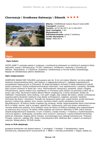 SKARPA TRAVEL tel. +(48) 12 619 48 00, [email protected] Chorwacja \ Środkowa Dalmacja \ Śibenik Oferta: CHORWACJA Solaris Resort hotel JURE Transport: Autokar Termin: od 02.06.2017 do 11.06.2017 Ilość noclegów 7 dni Wyżywienie: HB Zakwaterowanie: pokój 2 osobowy Liczba dorosłych: 2 Cena: 3960,00 zł Opis Opis hotelu HOTEL JURE*** posiada pokoje 2 osobowe z możliwością dostawek (w niektórych pokojach łóżka piętrowe), każdy z klimatyzacją, TV-SAT, telefonem, minibarem i łazienką z suszarką do włosów. Wyżywienie 2 x dziennie: śniadania i biadokolacje w formie bufetu szwedzkiego. Napoje do obiadokolacji płatne dodatkowo. Opis miejscowości KOMPLEKS WAKACYJNY SOLARIS usytuowany jest ok. 6 km od miasta Sibenik, tuż przy pięknej, świetnie zorganizowanej plaży. Jest jednym z najpopularniejszych i najlepiej wyposażonych kompleksów wakacyjnych w Chorwacji. W skład kompleksu wchodzi 5 hoteli położonych wśród lasów sosnowych i bujnej śródziemnomorskiej roślinności, oraz apartamenty i camping. Ośrodek tętni życiem zarówno w dzień jak i nocy. Różnorodność restauracji, dyskotek, plaże z bogatą infrastrukturą, sporty wodne oraz największy w Chorwacji park wodny nie pozwolą nudzić się tu przez cały urlop. Na terenie Solaris Beach Resort znajdują się: 4 korty tenisowe, boiska do siatkówki i koszykówki, tenis stołowy, mini golf, kręgle, plac zabaw dla dzieci, szkoła nurkowania, wypożyczalnia skuterów wodnych oraz desek surfingowych, kajaków, parasoli i leżaków. Animacje dla dzieci i dorosłych. Ponadto do dyspozycji gości jest: supermarket, punkt pierwszej pomocy medycznej, apteka, kino, kantor wymiany walut, punkt sprzedaży wycieczek fakultatywnych. W każym hotelu znajduje się recepcja, winda, bezprzewodowe łącze internetowe Wi-Fi w lobby, kantor, sejf w recepcji, aperitif bar, restauracja, grill oraz basen zewnętrzny z morską wodą oraz parking. Przy hotelach taras do tańca na którym każdego dnia organizowane są wieczory przy muzyce. W hotelu IVAN znajduje się Centrum Wellness & SPA, które stanowi zespół podgrzewanych basenów, w tym 2 baseny z wodą morską + 4 baseny z hydromasażami, sztuczne gejzery, wodospady, kompleks saun suchych i parowych z grotą śródziemnomorską, pokój do relaksacji, bogata oferta masaży, aromaterapia oraz zabiegi kosmetyczne, Thalasso Terapia, solarium, zabiegi SPA, sklep z kosmetykami SPA, Wellness Bar z sokami ze świeżych owoców. Wstęp płatny 10 EUR /osoba. Cena w PLN obejmuje przejazd autokarem lub dojazd własny, 7 noclegów, 7 śniadań, 7 obiadokolacji, taksę klimatyczną, ubezpieczenie rozszerzone KL + NNW + choroby przewlekłe + bagaż, opłatę na Strona 1/6 SKARPA TRAVEL tel. +(48) 12 619 48 00, [email protected] turystyczny fundusz gwarancyjny, promocję. Dopłaty 1. Pokoje 1 osobowe na zapytanie. 2. Do łóżeczka dziecięcego 200 zł / 7 dni 3. Wejście do Center Wellness & SPA płatne dodatkowo 10 EUR 4. Parking dodatkowo płatny 7 EUR /doba od 01.07 do 31.08, w pozostałych terminach 4 EUR/doba 5. Wejście do Aquaparku płatne dodatkowo: dzieci 0-3 lat gratis, dzieci 3-5 lat ok.10 EUR / dzień osoby powyżej 5 lat ok. 15 EUR / dzień 6. Serwis plażowy płatny dodatkowo: leżaki ok. 7 EUR / dzień parasol typu baldachim ok. 18 EUR / dzień Zniżki W cenie uwzględniona PROMOCJĘ FIRST MINUTE: przy dojeździe autokarem – 100 zł / osoba przy dojeździe własnym – 50 zł / osoba 1. Dziecko do 2 lat jako 3 osoba w pokoju bez świadczeń płaci 360 zł. 2. Jedna osoba dorosła + dziecko od 2 do 12 lat jako 2 osoba w pokoju zniżka 30%, 3. Dwoje dzieci od 2 do 12 lat jako 3 i 4 osoba w pokoju, żniżka 50% za każde dziecko 4. STAŁY KLIENT: obejmuje osoby korzystające trzeci kolejny rok z naszej oferty ! Uwagi organizatora 1. Wycieczki fakultatywne organizowane są przez lokalne biura podróży. 2.W dniu wykupienia imprezy/ wpłaty zaliczki klient ma możliwość wykupienia dodatkowego ubezpieczenia od kosztów rezygnacji z imprezy zgodnie z Ogólnymi Warunkmi Ubezpieczenia KOSZTÓW IMPREZY TURYSTYCZNEJ w wysokości 3,3% jednak nie później niż 5 dni od dnia podpisania umowy. 3. Doba hotelowa rozpoczyna się o godz 15 i kończy o godz 11. Strona 2/6 SKARPA TRAVEL tel. +(48) 12 619 48 00, [email protected] 4. Miejsca i godziny odjazdów autokarów podano w rozkładzie jazdy 5. Potrzebny DOWÓD OSOBISTY lub PASZPORT ! Prosze pamiętać również o dokumencie dla dzieci. 6. Dla osób dojeżdżających do Krakowa możemy zarezerwować przednocleg w cenie od 100 zł. Uwagi przewoźnika 1.Transport na trasach antenowych w Polsce możliwy jest mikrobusem, autokarem klasy turystycznej, samochodem osobowym lub innym przewoźnikiem np. Polskim Busem, Luxbusem, PKP, PKS itp. Ewentualną zmianę godzin odjazdów podamy najpóźniej na 24 godziny przed odjazdem. Trasa połączeń na terenie kraju zależy od zgłoszeń z poszczególnych miast, co może spowodować, ze przejazd nie będzie realizowany najkrótszą z możliwych tras. 2. Na trasach poza granicami Polski transport odbywa się autokarami wyposażonymi w siedzenia uchylne, klimatyzację, toalety, video i nagłośnienie. Przy małej ilości osób, możliwość przewozu uczestników małym autobusem bez WC i mini baru, wtedy toalety na postojach płatne przez przewoźnika. 3. Podane godziny wyjazdów i przyjazdów mogą ulec zmianie z różnych przyczyn np. złe warunki drogowe, atmosferyczne, zwiększanie ruchu na drogach szczególnie w szczycie sezonu letniego i inne. 4. Prosimy o przybycie na miejsce zbiórki najpóźniej 15 minut przed planowaną godziną odjazdu. Miejsca w autokarze są przydzielane w kolejności podpisania umowy, a klienci o miejscach informowani są przez obsługę na miejscu zbiórki. W autokarze obowiązuje całkowity zakaz palenia papierosów oraz spożywania alkoholu. Osoby korzystające z samego przejazdu, powinny obowiązkowo ubezpieczyć się na czas pobytu. Przewoźnik gwarantuje tylk