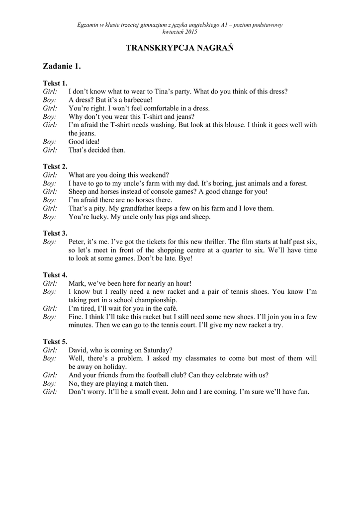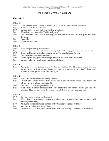 Egzamin w klasie trzeciej gimnazjum z języka angielskiego A1 – poziom podstawowy kwiecień 2015 TRANSKRYPCJA NAGRAŃ Zadanie 1. Tekst 1. Girl: I don’t know what to wear to Tina’s party. What do you think of this dress? Boy: A dress? But it’s a barbecue! Girl: You’re right. I won’t feel comfortable in a dress. Boy: Why don’t you wear this T-shirt and jeans? Girl: I’m afraid the T-shirt needs washing. But look at this blouse. I think it goes well with the jeans. Boy: Good idea! Girl: That’s decided then. Tekst 2. Girl: What are you doing this weekend? Boy: I have to go to my uncle’s farm with my dad. It’s boring, just animals and a forest. Girl: Sheep and horses instead of console games? A good change for you! Boy: I’m afraid there are no horses there. Girl: That’s a pity. My grandfather keeps a few on his farm and I love them. Boy: You’re lucky. My uncle only has pigs and sheep. Tekst 3. Boy: Peter, it’s me. I’ve got the tickets for this new thriller. The film starts at half past six, so let’s meet in front of the shopping centre at a quarter to six. We’ll have time to look at some games. Don’t be late. Bye! Tekst 4. Girl: Mark, we’ve been here for nearly an hour! Boy: I know but I really need a new racket and a pair of tennis shoes. You know I’m taking part in a school championship. Girl: I’m tired, I’ll wait for you in the café. Boy: Fine. I think I’ll take this racket but I still need some new shoes. I’ll join you in a few minutes. Then we can go to the tennis court. I’ll give my new racket a try. Tekst 5. Girl: David, who is coming on Saturday? Boy: Well, there’s a problem. I asked my classmates to come but most of them will be away on holiday. Girl: And your friends from the football club? Can they celebrate with us? Boy: No, they are playing a match then. Girl: Don’t worry. It’ll be a small event. John and I are coming. I’m sure we’ll have fun. Egzamin w klasie trzeciej gimnazjum z języka angielskiego A1 – poziom podstawowy kwiecień 2015 Zadanie 2. Boy: Girl: Boy: Girl: Boy: Girl: Boy: Girl: Boy: Girl: Boy: Girl: Boy: Hello Alice! So you are back from your holidays! Did you have a good time? Yes, it was fantastic! We went to the seaside. But my brother Matt wasn’t so happy at first. Why not? My parents didn’t let him take his laptop so he couldn’t surf the Internet. Poor Matt. So what did he do? He swam a lot and he even learned to windsurf. He’s quite good at it now. What about you, Alice? I wanted to test my new camera. Actually, I spent most of my time on the beach photographing ships and surfers. If you want, you can see the photos on the Internet. I will. And Philip? Did he sunbathe a lot? Oh, no! He hates that! Instead, he saw all the famous monuments in the area. He visited the places with my mum. And how about Patricia? I saw her in the picture she sent me yesterday. She looks so brown! Yes, she only wanted to lie in the sun. She relaxed a lot. Sounds like you’ve all had a great holiday! Zadanie 3. Woman: Do you have a talent for magic? Would you like to take part in our new talent show on Channel Four called Wannabe Wizard? We’re looking for young people who are good at performing tricks. During the show TV viewers will choose the best young magician of the month. If you are interested, film yourselves doing a few different tricks. Make sure that each trick is no longer than 90 seconds. And remember: do not add any sound effects or music. Please send us your video material by the 31st of May together with your name and address. We’ll invite some of you to perform your tricks in our studio. But before that, you’ll have to write an e-mail to us and explain the method used in your tricks. Zadanie 4. Wypowiedź 1. I can’t believe I’ve passed the exam! Wypowiedź 2. Good luck with the test! Wypowiedź 3. This concert is so boring. Wypowiedź 4. Where did you get the CD?