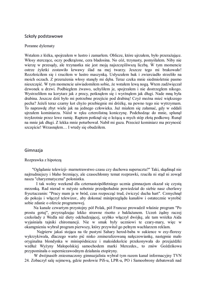 Szkoły podstawowe Poranne dylematy Wstałem z łóżka, spojrzałem w lustro i zamarłem. Oblicze, które ujrzałem, było przerażające. Włosy sterczące, oczy podkrążone, cera bladosina. No cóż, trzynasty, pomyślałem. Niby nie wierzę w przesądy, ale trzynastka nie jest moją najszczęśliwszą liczbą. W tym momencie ostrze żyletki zostawiło krwawy ślad na mej twarzy. Jeszcze tego mi brakowało! Rozzłościłem się i rzuciłem w lustro maszynką. Usłyszałem huk i zwierciadło strzeliło na moich oczach. Z przerażenia włosy stanęły mi dęba. Teraz czeka mnie siedmioletnie pasmo nieszczęść. W tym momencie uświadomiłem sobie, że wstałem lewą nogą. Wtem zadźwięczał dzwonek u drzwi. Podbiegłem żwawo, uchyliłem je, spojrzałem i nie dostrzegłem nikogo. Wystrzeliłem na korytarz jak z procy, potknąłem się i wyrżnąłem jak długi. Nade mną była drabina. Jeszcze dziś było mi potrzebne przejście pod drabiną! Czyż można mieć większego pecha? Jeżeli teraz czarny kot chyżo przebiegnie mi dróżkę, na pewno tego nie wytrzymam. To naprawdę zbyt wiele jak na jednego człowieka. Już miałem się załamać, gdy w oddali ujrzałem kominiarza. Niósł w ręku czterolistną koniczynę. Podchodząc do mnie, splunął trzykrotnie przez lewe ramię. Raptem potknął się o leżącą u mych stóp złotą podkowę. Runął na mnie jak długi. Z lekka mnie poturbował. Nabił mi guza. Przecież kominiarz ma przynosić szczęście! Wrzasnąłem… I wtedy się obudziłem. Gimnazja Rozprawka z hipotezą "Oglądanie telewizji- marnotrawstwo czasu czy duchowa superuczta?" Taki, skądinąd nie najtrudniejszy i błaho brzmiący, ale czasochłonny temat rozprawki, rzuciła ni stąd ni zowąd nasza "charyzmatyczna" polonistka. I tak wolny weekend dla czternastoipółletniego ucznia gimnazjum okazał się czystą mrzonką. Rad nierad w mżyste sobotnie przedpołudnie powiedział do siebie nasz cherlawy frysztaczanin: "Pracy mam ja w bród, czas rozpocząć trud, ćwiczyć ducha hart". Czmychnął do pokoju i włączył telewizor., aby dokonać miniprzeglądu kanałów i ostatecznie wyrobić sobie zdanie o ofercie programowej. Na kanale czwartym przystojny pół Polak, pół Francuz prowadził właśnie program "Po prostu gotuj", przyrządzając lekko strawne risotto z bakłażanem. Uczeń żądny raczej czekolady z Wedla niż diety odchudzającej, szybko włączył dwójkę, ale tam wróżka Aida wyjaśniała tajniki chiromancji. Nie w smak były uczniowi te czary-mary, więc w okamgnieniu wybrał program pierwszy, który przywitał go pełnym wachlarzem reklam. Najpierw jakaś stojąca na tle pustyni Sahary herod-baba w sukience w esy-floresy wykrzykiwała, dlaczego warto pić nisko zmineralizowaną nałęczowiankę, następnie mało oryginalna blondynka w minispódniczce i maksidekolcie przekonywała do przejażdżki wzdłuż Wyżyny Małopolskiej samochodem marki Mercedes., to znów Goździkowa przypominała o superniezawodnym działaniu etopiryny. W dwójnasób zniesmaczony gimnazjalista wybrał tym razem kanał informacyjny TVN 24. Zobaczył salę sejmową, gdzie posłowie PiS-u, LPR-u, PO i Samoobrony debatowali nad poprawką do Konstytucji Rzeczypospolitej Polskiej. Przypomniał sobie przy okazji, że na najbliższą lekcję historii należy wykuć wszystko o Sejmie Czteroletnim, Konstytucji 3 maja i konfederacji targowickiej. Szkoły ponadgimnazjalne Klechda o chełpliwym puchaczu ku ostrzeżeniu próżnych samochwał sporządzona Pewien hardy puchacz chwacko pohukiwał, że jest najmądrzejszy w lesie. Czyniąc zamęt i ferment, na całego bajdurzył, jak to w Bibliotece Kórnickiej przejrzał książczyn huk, w tym habilitacji i zaplombowanych herbarzy chmarę. Mówił, jakoby świat przemierzył wszerz i wzdłuż dzięki kursom hipologii, ichtiologii, chronometrażu i pilotażu. Rzekomo w hydroplanie mknął przez morze Bałtyk i mimo ostrzeżeń hydrologów bez wahania sunął nad duńskim Bornholmem. Na Półwyspie Apenińskim grzał się w żarze słonecznym, a w towarzystwie hipochondrycznej Habsburżanki kąpał się w Morzu Żółtym i oceanie Pacyfik. Przez przylądek Horn zdążał dyliżansem powożonym przez chojrackiego kopenhażanina w strażackim hełmie. Z kolei na rynku w Chełmie chimerycznym hipokrytom i rzeźwym rzekotkom użyczał instrukcji savoir-vivre'u. Ecie-pecie, baju, baju, baj, tak plótł bez sensu rozfanatyzowany mirażami i mrzonkami. Wachlował się tyci uprzężą i huśtał się w hamaku zahaczonym o przytachaną nie wiadomo skąd duhę. Chrupał smażone, nieocukrzone łodyżki anyżku i katarzynki z grylażem, a dla kurażu chłeptał herbatkę jeżynową. Na dobitek obcesową autoreklamę do świeżo okorowanej dębiny żółtaworyżą pinezką z ostentacją przypiął: "Pojutrze na wrzosowisku zarządzam filharmoniczną muzykoterapię i nie na żarty żądam, byście bez żenady przybyli. Wiedzcie, że jestem charyzmatycznym obieżyświatem, hojnie obdarzonym talentem. Harmonijnie wystukuję ciżemkami każde tempo o tępo zaokrąglone podmurówki. Nie raz i nie dwa wtórowały mi kląskające w burzanach rdzawopióre słowiki, chrobotliwe kszyki i chędożące skrzydła charakterne hajstry". Gdy zwierzęta jaśniepański inserat odczytały, w dąbrowie zawrzało. Poniewczasie wyszło na jaw, że hochsztapler ni razu spoza lasu dzióbka nie wyściubił. Zhańbiony pierzchnął więc do obrzeżonej trzebieżami wieży zmurszałego zamku, gdzie nieustającą chandrą znużony niechlubnie żyje, bo nikt już ani na jotę ważniakowi nie wierzy. *duha: drewniany, łukowaty przedmiot służący do przymocowania rzemieni przy chomącie do dyszli zaprzęgu; dyszle w trojce; duga, drewniany kabłąk w jednokonnym zaprzęgu - łączy hołoble; drewniany kabłąk w zaprzęgu konnym