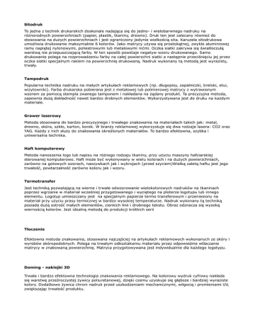 Sitodruk To jedna z technik drukarskich doskonale nadająca się do jedno- i wielobarwnego nadruku na różnorodnych powierzchniach (papier, plastik, tkaniny, drewno). Druk ten jest zalecany również do stosowania na dużych powierzchniach i jest ograniczony jedynie wielkością sita. Karuzela sitodrukowa umożliwia drukowanie maksymalnie 6 kolorów. Jako matrycy używa się prostokątnej, zwykle aluminiowej ramy napiętej nylonowymi, poliestrowymi lub metalowymi nićmi. Oczka siatki zakrywa się światłoczułą warstwą nie przepuszczającą farby. W ten sposób powstaje negatyw wzoru drukowanego. Samo drukowanie polega na rozprowadzeniu farby na całej powierzchni siatki a następnie przeciśnięciu jej przez oczka siatki specjalnym raklem na powierzchnię drukowaną. Nadruk wykonany tą metodą jest wyrazisty, trwały. Tampodruk Popularna technika nadruku na małych artykułach reklamowych (np. długopisy, zapalniczki, breloki, etui, wizytowniki). Farba drukarska pobierana jest z metalowej lub polimerowej matrycy z wytrawionym wzorem za pomocą stempla zwanego tamponem i nakładana na żądany produkt. Ta precyzyjna metoda, zapewnia dużą dokładność nawet bardzo drobnych elementów. Wykorzystywana jest do druku na każdym materiale. Grawer laserowy Metoda stosowana do bardzo precyzyjnego i trwałego znakowania na materiałach takich jak: metal, drewno, skóra, szkło, karton, korek. W branży reklamowej wykorzystuje się dwa rodzaje lasera: CO2 oraz YAG. Każdy z nich służy do znakowania określonych materiałów. To bardzo efektowna, szybka i uniwersalna technika. Haft komputerowy Metoda nanoszenia logo lub napisu na różnego rodzaju tkaniny, przy użyciu maszyny hafciarskiej sterowanej komputerowo. Haft może być wykonywany w wielu kolorach i na dużych powierzchniach, zarówno na gotowych wzorach, naszywkach jak i wykrojach (przed szyciem)Wielką zaletą haftu jest jego trwałość, powtarzalność zarówno koloru jak i wzoru. Termotransfer Jest techniką pozwalającą na wierne i trwałe odwzorowanie wielokolorowych nadruków na tkaninach poprzez wgrzanie w materiał wcześniej przygotowanego i wyciętego na ploterze logotypu lub innego elementu. Logotyp umieszczany jest na specjalnym papierze termo transferowym i przeniesiony na materiał przy użyciu prasy termicznej w bardzo wysokiej temperaturze. Nadruk wykonany tą techniką posiada dużą ostrość małych elementów, cienkich linii i drobnego tekstu. Obraz odznacza się wysoką wiernością kolorów. Jest idealną metodą do produkcji krótkich serii Tłoczenie Efektowna metoda znakowania, stosowana najczęściej na artykułach reklamowych wykonanych ze skóry i wyrobów skóropodobnych. Polega na trwałym odkształceniu materiału przez odpowiednie wtłaczanie matrycy w znakowaną powierzchnię. Matryca przygotowywana jest indywidualnie dla każdego logotypu. Doming - naklejki 3D Trwała i bardzo efektowna technologia znakowania reklamowego. Na kolorowy wydruk cyfrowy nakłada się warstwę przeźroczystej żywicy poliuretanowej, dzięki czemu uzyskuje się głębsze i bardziej wyraziste kolory. Dodatkowo żywica chroni nadruk przed uszkodzeniami mechanicznymi, wilgocią i promieniami UV, zwiększając trwałość produktu.