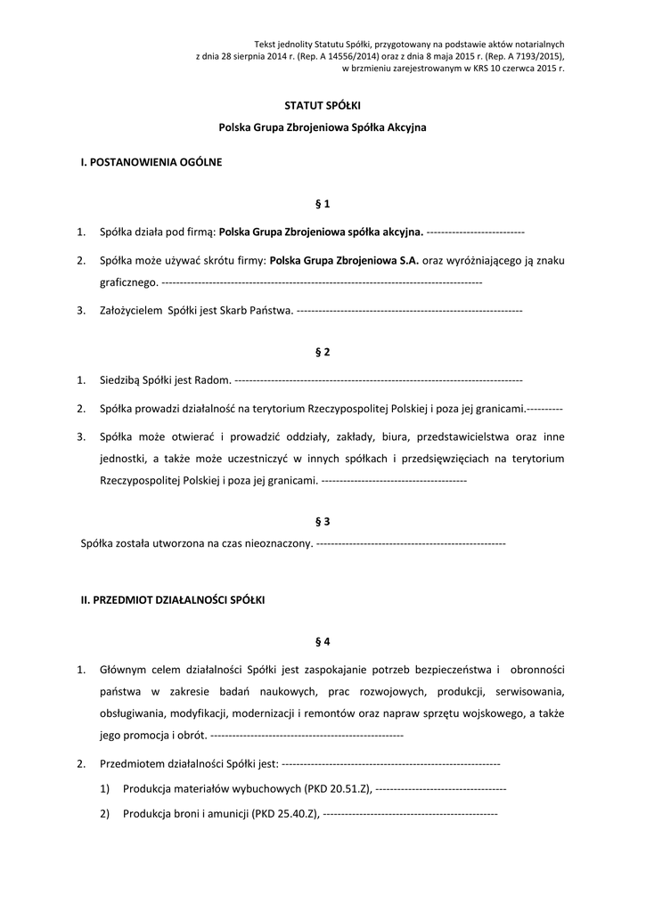 Tekst jednolity Statutu Spółki, przygotowany na podstawie aktów notarialnych z dnia 28 sierpnia 2014 r. (Rep. A 14556/2014) oraz z dnia 8 maja 2015 r. (Rep. A 7193/2015), w brzmieniu zarejestrowanym w KRS 10 czerwca 2015 r. STATUT SPÓŁKI Polska Grupa Zbrojeniowa Spółka Akcyjna I. POSTANOWIENIA OGÓLNE §1 1. Spółka działa pod firmą: Polska Grupa Zbrojeniowa spółka akcyjna. --------------------------- 2. Spółka może używać skrótu firmy: Polska Grupa Zbrojeniowa S.A. oraz wyróżniającego ją znaku graficznego. ---------------------------------------------------------------------------------------- 3. Założycielem Spółki jest Skarb Państwa. -------------------------------------------------------------§2 1. Siedzibą Spółki jest Radom. ------------------------------------------------------------------------------- 2. Spółka prowadzi działalność na terytorium Rzeczypospolitej Polskiej i poza jej granicami.---------- 3. Spółka może otwierać i prowadzić oddziały, zakłady, biura, przedstawicielstwa oraz inne jednostki, a także może uczestniczyć w innych spółkach i przedsięwzięciach na terytorium Rzeczypospolitej Polskiej i poza jej granicami. ---------------------------------------§3 Spółka została utworzona na czas nieoznaczony. ---------------------------------------------------- II. PRZEDMIOT DZIAŁALNOŚCI SPÓŁKI §4 1. Głównym celem działalności Spółki jest zaspokajanie potrzeb bezpieczeństwa i obronności państwa w zakresie badań naukowych, prac rozwojowych, produkcji, serwisowania, obsługiwania, modyfikacji, modernizacji i remontów oraz napraw sprzętu wojskowego, a także jego promocja i obrót. ----------------------------------------------------- 2. Przedmiotem działalności Spółki jest: -----------------------------------------------------------1) Produkcja materiałów wybuchowych (PKD 20.51.Z), ------------------------------------ 2) Produkcja broni i amunicji (PKD 25.40.Z), ------------------------------------------------ Tekst jednolity Statutu Spółki, przygotowany na podstawie aktów notarialnych z dnia 28 sierpnia 2014 r. (Rep. A 14556/2014) oraz z dnia 8 maja 2015 r. (Rep. A 7193/2015), w brzmieniu zarejestrowanym w KRS 10 czerwca 2015 r. 3) Produkcja elektrycznych silników, prądnic i transformatorów (PKD 27.11.Z), ------- 4) Produkcja aparatury rozdzielczej i sterowniczej energii elektrycznej (PKD 27.12.Z), 5) Produkcja silników do pojazdów samochodowych (z wyłączeniem motocykli) oraz do ciągników rolniczych (PKD 29.10.A), ---------------------------------------------------- 6) Produkcja statków powietrznych, statków kosmicznych i podobnych maszyn (PKD 30.30.Z), - 7) Produkcja wojskowych pojazdów bojowych (PKD 30.40.Z), ---------------------------- 8) Naprawa i konserwacja metalowych wyrobów gotowych (PKD 33.11.Z), ------------- 9) Naprawa i konserwacja maszyn (PKD 33.12.Z), ------------------------------------------- 10) Naprawa i konserwacja urządzeń elektronicznych i optycznych (PKD 33.13.Z), ----11) Naprawa i konserwacja urządzeń elektrycznych (PKD 33.14.Z), -----------------------12) Naprawa i konserwacja statków i łodzi (PKD 33. 15.Z), ---------------------------------13) Naprawa i konserwacja statków powietrznych i statków kosmicznych (PKD 33.16.Z), 14) Instalowanie maszyn przemysłowych, sprzętu i wyposażenia (PKD 33.20.Z), -------15) Sprzedaż hurtowa i detaliczna pozostałych pojazdów samochodowych, z wyłączeniem motocykli (PKD 45.19.Z), -------------------------------------------------16) Konserwacja i naprawa pojazdów samochodowych, z wyłączeniem motocykli (PKD 45.20.Z), 17) Sprzedaż hurtowa części i akcesoriów do pojazdów samochodowych, z wyłączeniem motocykli (PKD 45.31.Z), ---------------------------------------------------------------------18) Działalność agentów zajmujących się sprzedażą maszyn, urządzeń przemysłowych, statków i samolotów (PKD 46.14.Z), --------------------------------------------------------19) Działalność agentów specjalizujących się w sprzedaży pozostałych określonych towarów (PKD 46.18.Z), -----------------------------------------------------------------------20) Działalność agentów zajmujących się sprzedażą towarów różnego rodzaju (PKD 46.19.Z), 21) Sprzedaż hurtowa sprzętu elektronicznego i telekomunikacyjnego oraz części do niego (PKD 46.52.Z), ----------------------------------------------------------------------------------22) Sprzedaż hurtowa pozostałych maszyn i urządzeń (PKD 46.69.Z), ---------------------23) Sprzedaż hurtowa odpadów i złomu (PKD 46.77.Z), --------------------------------------24) Sprzedaż hurtowa niewyspecjalizowana (PKD 46.90.Z), ---------------------------------25) Transport drogowy towarów (PKD 49.41.Z), -------------------------------------------------26) Magazynowanie i przechowywanie pozostałych towarów (PKD 52.10.B), ------------- 2 Tekst jednolity Statutu Spółki, przygotowany na podstawie aktów notarialnych z dnia 28 sierpnia 2014 r. (Rep. A 14556/2014) oraz z dnia 8 maja 2015 r. (Rep. A 7193/2015), w brzmieniu zarejestrowanym w KRS 10 czerwca 2015 r. 27) Przeładunek towarów w pozostałych punktach przeładunkowych (PKD 52.24.C), ---28) Pozostała działalność usługowa w zakresie technologii informatycznych i komputerowych (PKD 62.09.Z), ---------------------------------------------------------------29) Pozostałe pośrednictwo pieniężne (PKD 64.19.Z), -------------------------------------------30) Działalność holdingów finansowych (PKD 64.20.Z), -----------------------------------------31) Leasing finansowy (PKD 64.91.Z), ----------------------------------------------------------------32) Pozostałe formy udzielania kredytów (PKD 64.92.Z), ----------------------------------------33) Pozostała finansowa działalność usługowa, gdzie indziej niesklasyfikowana, z wyłączeniem ubezpieczeń i funduszów emerytalnych (PKD 64.99.Z), --------