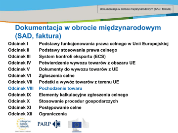 Dokumentacja w obrocie faktura) Title ofmiędzynarodowym the presentation | (SAD, Date |‹#› Dokumentacja w obrocie międzynarodowym (SAD, faktura) Odcinek I Odcinek II Odcinek III Odcinek IV Odcinek V Odcinek VI Odcinek VII Odcinek VIII Odcinek IX Odcinek X Odcinek XI Odcinek XII Podstawy funkcjonowania prawa celnego w Unii Europejskiej Podstawy stosowania prawa celnego System kontroli eksportu (ECS) Potwierdzenie wywozu towarów z obszaru UE Dokumenty do wywozu towarów z UE Zgłoszenia celne Podatki a wywóz towarów z terenu UE Pochodzenie towaru Elementy kalkulacyjne zgłoszenia celnego Stosowanie procedur gospodarczych Postępowanie celne Ograniczenia Dokumentacja w obrocie międzynarodowym (SAD, faktura) | Odcinek Title of the presentation | Date |‹#› VIII | 1 Część VIII Pochodzenie towaru • Pochodzenie towarów z terenu EU • Preferencyjne pochodzenie towaru z UE • Sposoby dokumentowania pochodzenia towarów Dokumentacja w obrocie międzynarodowym (SAD, faktura) | Odcinek Title of the presentation | Date |‹#› VIII | 2 Pochodzenie towaru Układ Ogólny w Sprawie Taryf Celnych i Handlu (GATT) Światowa Organizacja Handlu (WTO) 1994 Porozumienie w Sprawie Reguł Pochodzenia Towarów Klauzula Największego Uprzywilejowania KNU Dokumentacja w obrocie międzynarodowym (SAD, faktura) | Odcinek Title of the presentation | Date |‹#› VIII | 3 KLAUZULA NAJWIĘKSZEGO UPRZYWILEJOWANIA KNU Reguły pochodzenia pochodzenie preferencyjne pochodzenie niepreferencyjne ekonomiczny rodowód produktów Dokumentacja w obrocie międzynarodowym (SAD, faktura) | Odcinek Title of the presentation | Date |‹#› VIII | 4 Najważniejsze przepisy dotyczące pochodzenia towarów • art. 22-27 Wspólnotowego Kodeksu Celnego (WKC) • art. 35-135 Rozporządzenia Komisji 2454/93z dnia 2 lipca 1993 roku ustanawiające przepisy w celu wykonania rozporządzenia Rady(EWG) nr 2913/92 ustanawiającego Wspólnotowy Kodeks Celny (RWKC). • Rozporządzenie Rady (WE) nr 980/2005 z dnia 27 czerwca 2005 r. Wprowadzające plan ogólnych preferencji taryfowych. • postanowienia umów międzynarodowych z pojedynczymi krajami lub grupami krajów. • art. 10 Prawa celnego (Dz. U nr 68, poz. 622 z 2004 roku z późniejszymi zmianami.) • Załącznikach 9-22 RWKC • Innych (rozporządzeniach i decyzjach) Dokumentacja w obrocie międzynarodowym (SAD, faktura) | Odcinek Title of the presentation | Date |‹#› VIII | 5 Niepreferencyjne pochodzenie towaru • Reguły niepreferencyjnego pochodzenia towarów ustanowione są w: • art. 22 – 26 KC • 35–65 RWKC • załącznikach 9-13 RWKC. • Załączniku nr 7 do Rozporządzenia Ministra Finansów z dnia 22 kwietnia 2004r. w sprawie szczegółowych wymogów jakie powinno spełniać zgłoszenie celne DZ U nr 94 poz. 902 z 2004 z późn zm. Dokumentacja w obrocie międzynarodowym (SAD, faktura) | Odcinek Title of the presentation | Date |‹#› VIII | 6 Ogólne zasady ustalanie pochodzenia towarów Towary „wytworzone” w jednym kraju Towary „wytworzone” przy współudziale kilku krajów Dokumentacja w obrocie międzynarodowym (SAD, faktura) | Odcinek Title of the presentation | Date |‹#› VIII | 7 ORGAN CELNY DOWÓD POCHODZENIA NIEPREFERENCYJNE POCHODZENIE TOWARU Dokumentacja w obrocie międzynarodowym (SAD, faktura) | Odcinek Title of the presentation | Date |‹#› VIII | 8 CZĘŚCI ZAPASOWE ŁĄCZNIE WARUNKI: • stanowią elementy, bez których nie może być zapewnione właściwe funkcjonowanie sprzętu, maszyn, aparatów lub pojazdów wcześniej dopuszczonych do obrotu lub wywiezionych, • są charakterystyczne dla sprzętu, maszyn, aparatów lub pojazdów, • są przeznaczone do konserwacji sprzętu, maszyn, aparatów lub pojazdów albo do zastąpienia części tego samego rodzaju, uszkodzonych lub nie nadających się do użytku. Dokumentacja w obrocie międzynarodowym (SAD, faktura) | Odcinek Title of the presentation | Date |‹#› VIII | 9 DOKUMENTOWANIE POCHODZENIA trwałe oznaczenie kraju pochodzenia na towarze świadectwo pochodzenia specyfikację fakturę świadectwo jakości inny dokument urzędowy kontrakt Dokumentacja w obrocie międzynarodowym (SAD, faktura) | Title of the presentation Odcinek | Date |‹#›VIII | 10 Świadectwo pochodzenia towaru Dokumentacja w obrocie międzynarodowym (SAD, faktura) | Title of the presentation Odcinek | Date |‹#›VIII | 11 • Świadectwo pochodzenia wystawiane są na pisemny wniosek osoby zainteresowanej i składa się z 3 następujących kart: • karta nr 1 formularza, stanowi oryginał świadectwa pochodzenia i po potwierdzeniu przez organ celny, jest wydawana wnioskodawcy, • karta nr 2 formularza, stanowi kopię świadectwa pochodzenia. Organ celny po potwierdzeniu świadectwa zatrzymuje kopię, chyba że wnioskodawca umieści we wniosku żądanie wydania kopii świadectwa, • karta nr 3 formularza, stanowi wniosek o wydanie świadectwa (uwaga opłata skarbowa). Dokumentacja w obrocie międzynarodowym (SAD, faktura) | Title of the presentation Odcinek | Date |‹#›VIII | 12 Preferencyjne pochodzenie towarów UNIA EUROPEJSKA Australia, Hongkong, Japonia, Kanada, Nowa Zelandia, Singapur, Kanada, USA WZAJEMNE UMOWY EUR 1 JEDNOSTRONNE UMOWY FORM A Dokumentacja w obrocie międzynarodowym (SAD, faktura) | Title of the presentation Odcinek | Date |‹#›VIII | 13 Podstawowe przepisy związane ze stosowaniem reguł preferencyjnego pochodzenia Unii • • • • art. 27 Kodeksu Celnego w porozumieniach preferencyjnych art. 66 – 123 RWKC oraz załącznikach 14-22 RWKC w Decyzji nr 2001/822/WE z dnia 27 listopada 2001 r. w sprawie stowarzyszenia krajów i terytoriów zamorskich ze Wspólnotą Europejską • Rozporządzeniu 82/2001 dotyczące definicji pojęcia „produkty pochodzące” i metod współpracy administracyjnej w handlu miedzy obszarem celnym Wspólnoty a Ceutą i Melillą (Dz. U. 2001 nr L20, str.1) • Rozporządzeniu (WE) nr 1207/2001 w sprawie procedur ułat