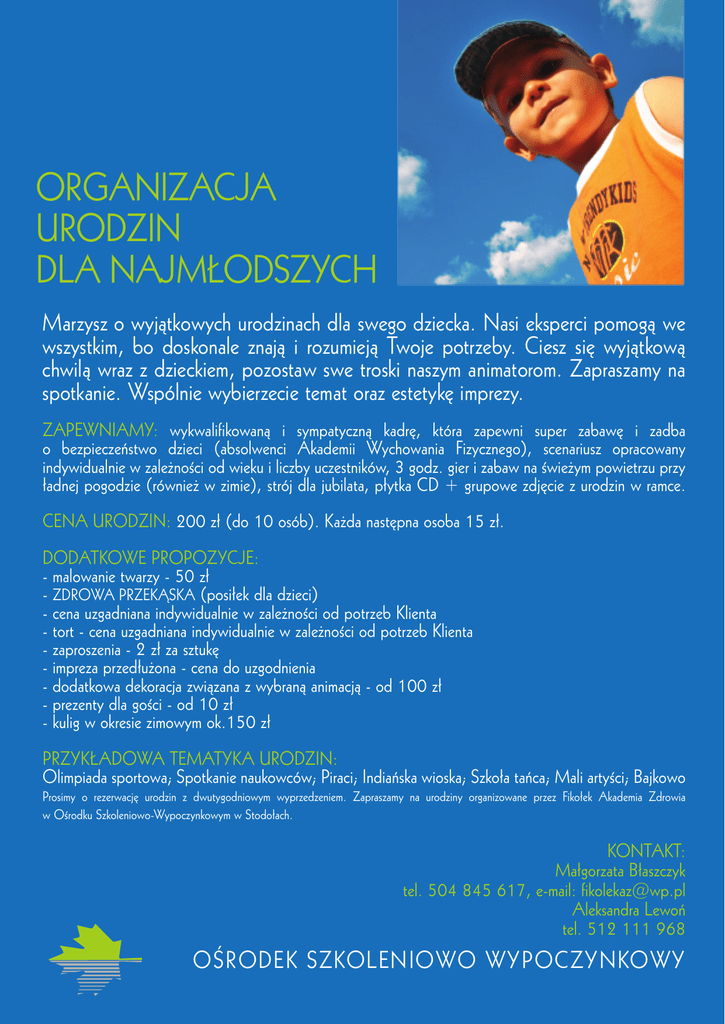 ORGANIZACJA URODZIN DLA NAJMŁODSZYCH Marzysz o wyjątkowych urodzinach dla swego dziecka. Nasi eksperci pomogą we wszystkim, bo doskonale znają i rozumieją Twoje potrzeby. Ciesz się wyjątkową chwilą wraz z dzieckiem, pozostaw swe troski naszym animatorom. Zapraszamy na spotkanie. Wspólnie wybierzecie temat oraz estetykę imprezy. ZAPEWNIAMY: wykwalifikowaną i sympatyczną kadrę, która zapewni super zabawę i zadba o bezpieczeństwo dzieci (absolwenci Akademii Wychowania Fizycznego), scenariusz opracowany indywidualnie w zależności od wieku i liczby uczestników, 3 godz. gier i zabaw na świeżym powietrzu przy ładnej pogodzie (również w zimie), strój dla jubilata, płytka CD + grupowe zdjęcie z urodzin w ramce. CENA URODZIN: 200 zł (do 10 osób). Każda następna osoba 15 zł. DODATKOWE PROPOZYCJE: - malowanie twarzy - 50 zł - ZDROWA PRZEKĄSKA (posiłek dla dzieci) - cena uzgadniana indywidualnie w zależności od potrzeb Klienta - tort - cena uzgadniana indywidualnie w zależności od potrzeb Klienta - zaproszenia - 2 zł za sztukę - impreza przedłużona - cena do uzgodnienia - dodatkowa dekoracja związana z wybraną animacją - od 100 zł - prezenty dla gości - od 10 zł - kulig w okresie zimowym ok.150 zł PRZYKŁADOWA TEMATYKA URODZIN: Olimpiada sportowa; Spotkanie naukowców; Piraci; Indiańska wioska; Szkoła tańca; Mali artyści; Bajkowo Prosimy o rezerwację urodzin z dwutygodniowym wyprzedzeniem. Zapraszamy na urodziny organizowane przez Fikołek Akademia Zdrowia w Ośrodku Szkoleniowo-Wypoczynkowym w Stodołach. KONTAKT: Małgorzata Błaszczyk tel. 504 845 617, e-mail: [email protected] Aleksandra Lewoń tel. 512 111 968 OŚRODEK SZKOLENIOWO WYPOCZYNKOWY