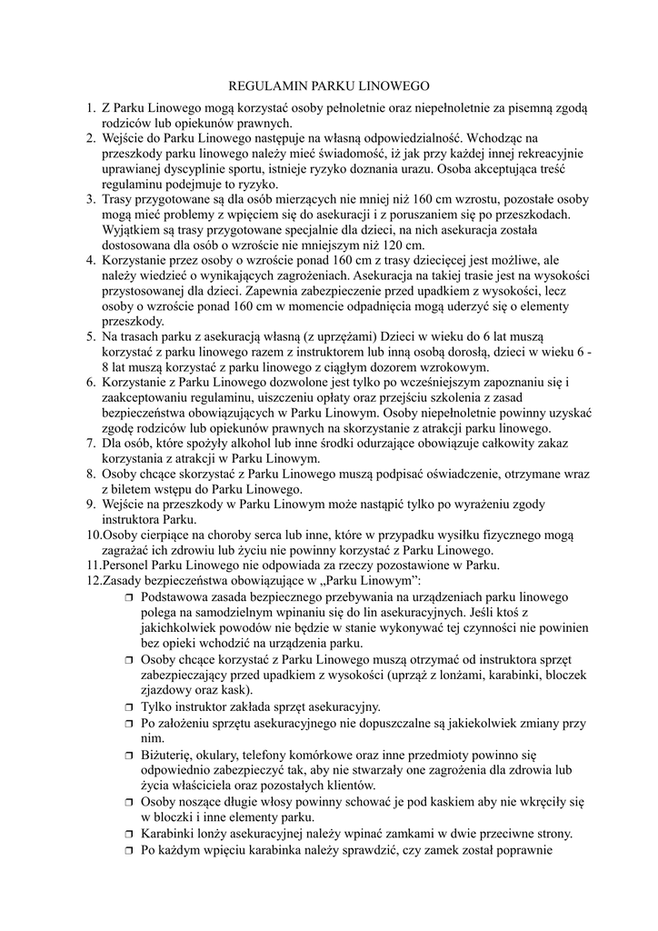 REGULAMIN PARKU LINOWEGO 1. Z Parku Linowego mogą korzystać osoby pełnoletnie oraz niepełnoletnie za pisemną zgodą rodziców lub opiekunów prawnych. 2. Wejście do Parku Linowego następuje na własną odpowiedzialność. Wchodząc na przeszkody parku linowego należy mieć świadomość, iż jak przy każdej innej rekreacyjnie uprawianej dyscyplinie sportu, istnieje ryzyko doznania urazu. Osoba akceptująca treść regulaminu podejmuje to ryzyko. 3. Trasy przygotowane są dla osób mierzących nie mniej niż 160 cm wzrostu, pozostałe osoby mogą mieć problemy z wpięciem się do asekuracji i z poruszaniem się po przeszkodach. Wyjątkiem są trasy przygotowane specjalnie dla dzieci, na nich asekuracja została dostosowana dla osób o wzroście nie mniejszym niż 120 cm. 4. Korzystanie przez osoby o wzroście ponad 160 cm z trasy dziecięcej jest możliwe, ale należy wiedzieć o wynikających zagrożeniach. Asekuracja na takiej trasie jest na wysokości przystosowanej dla dzieci. Zapewnia zabezpieczenie przed upadkiem z wysokości, lecz osoby o wzroście ponad 160 cm w momencie odpadnięcia mogą uderzyć się o elementy przeszkody. 5. Na trasach parku z asekuracją własną (z uprzężami) Dzieci w wieku do 6 lat muszą korzystać z parku linowego razem z instruktorem lub inną osobą dorosłą, dzieci w wieku 6 8 lat muszą korzystać z parku linowego z ciągłym dozorem wzrokowym. 6. Korzystanie z Parku Linowego dozwolone jest tylko po wcześniejszym zapoznaniu się i zaakceptowaniu regulaminu, uiszczeniu opłaty oraz przejściu szkolenia z zasad bezpieczeństwa obowiązujących w Parku Linowym. Osoby niepełnoletnie powinny uzyskać zgodę rodziców lub opiekunów prawnych na skorzystanie z atrakcji parku linowego. 7. Dla osób, które spożyły alkohol lub inne środki odurzające obowiązuje całkowity zakaz korzystania z atrakcji w Parku Linowym. 8. Osoby chcące skorzystać z Parku Linowego muszą podpisać oświadczenie, otrzymane wraz z biletem wstępu do Parku Linowego. 9. Wejście na przeszkody w Parku Linowym może nastąpić tylko po wyrażeniu zgody instruktora Parku. 10.Osoby cierpiące na choroby serca lub inne, które w przypadku wysiłku fizycznego mogą zagrażać ich zdrowiu lub życiu nie powinny korzystać z Parku Linowego. 11.Personel Parku Linowego nie odpowiada za rzeczy pozostawione w Parku. 12.Zasady bezpieczeństwa obowiązujące w „Parku Linowym”: Podstawowa zasada bezpiecznego przebywania na urządzeniach parku linowego polega na samodzielnym wpinaniu się do lin asekuracyjnych. Jeśli ktoś z jakichkolwiek powodów nie będzie w stanie wykonywać tej czynności nie powinien bez opieki wchodzić na urządzenia parku. Osoby chcące korzystać z Parku Linowego muszą otrzymać od instruktora sprzęt zabezpieczający przed upadkiem z wysokości (uprząż z lonżami, karabinki, bloczek zjazdowy oraz kask). Tylko instruktor zakłada sprzęt asekuracyjny. Po założeniu sprzętu asekuracyjnego nie dopuszczalne są jakiekolwiek zmiany przy nim. Biżuterię, okulary, telefony komórkowe oraz inne przedmioty powinno się odpowiednio zabezpieczyć tak, aby nie stwarzały one zagrożenia dla zdrowia lub życia właściciela oraz pozostałych klientów. Osoby noszące długie włosy powinny schować je pod kaskiem aby nie wkręciły się w bloczki i inne elementy parku. Karabinki lonży asekuracyjnej należy wpinać zamkami w dwie przeciwne strony. Po każdym wpięciu karabinka należy sprawdzić, czy zamek został poprawnie zamknięty. Przemieszczając się na kolejne przeszkody należy przepiąć pojedynczo najpierw pierwszy potem drugi karabinek do liny asekuracyjnej. Nie dopuszczalną sytuacją jest wypięcie naraz obydwu karabinków! Punkty wpięć oznaczone są kolorem czerwonym. Jeśli na linie stalowej obok podstawowego czerwonego oznaczenia występuje też oznaczenie niebieskie oznacza to, że należy tam wpiąć bloczek oznaczony właśnie takim kolorem. Należy wtedy najpierw wpiąć bloczek w linę, kontrolując czy lonża nie jest skręcona. Dopiero potem kolejno przepiąć karabinki z lonży asekuracyjnej tak aby na linie zjazdowej w pierwszej kolejności znajdował się bloczek zjazdowy. Kolejność jest oznaczona kolorami. Podczas zjazdu na bloczku należy trzymać się tylko lonży bloczka. Chwytanie w czasie zjazdu stalowej liny grozi poważnym skaleczeniem! Jedyną dopuszczalną pozycją zjazdu jest pozycja „siedząca”. Podczas dojeżdżania do podestu należy unieść nogi i lekko je zgiąć w kolanach tak aby zamortyzować ewentualne uderzenie o materac. W momencie zatrzymania należy chwycić ręką dodatkowej liny lub pętli aby nie odjechać od podestu. Nie wolno łapać się liny za bloczkiem aby powracający bloczek nie najechał nam na rękę. Uwaga!!! W ostatniej fazie zjazdu nie wyciągać przed siebie rąk w kierunku materaca. Jeśli nie udało nam się zatrzymać na podeście i zjechaliśmy z powrotem. Należy zaczekać aż się zatrzymamy, a następnie chwytając liny nośnej dociągnąć do podestu ustawiając się głową w kierunku jazdy. Po przejechaniu na linie powinno się zachować następującą kolejność przepinania sprzętu asekuracyjnego; najpierw wypinamy jeden karabinek i wpinamy go do pętli oplecionej wokół drzewa, następnie wypinamy bloczek i wpinamy go do ucha u boku uprzęży, jako ostatni wypinamy karabinek będący jeszcze na stalowej linie zjazdowej i wpinamy go do pętli asekuracyjnej. Podczas przechodzenia przez Park Linowy wskazany jest spokój, nie można skakać po przeszkodach i huśtać się na atrakcjach do tego nie przeznaczonych. Na pojedynczej przeszkodzie może znajdować się tylko jedna osoba. Na podeście mogą znajdować się maksymalnie dwie osoby. Osoby nieupoważnione nie mogą znajdować się pod trasami parku i w pobliżu zjazdów. W przypadku utraty sił, rezygnacji lub innych przyczyn uniemożliwiających zakończenie trasy należy wezwać obsługę Parku Linowego, zostan