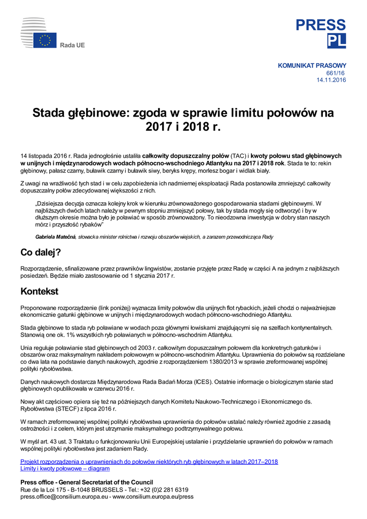 Rada UE PRESS PL KOMUNIKAT PRASOWY 661/16 14.11.2016 Stada głębinowe: zgoda w sprawie limitu połowów na 2017 i 2018 r. 14 listopada 2016 r. Rada jednogłośnie ustaliła całkowity dopuszczalny połów (TAC) i kwoty połowu stad głębinowych w unijnych i międzynarodowych wodach północno-wschodniego Atlantyku na 2017 i 2018 rok. Stada te to: rekin głębinowy, pałasz czarny, buławik czarny i buławik siwy, beryks krępy, morlesz bogar i widlak biały. Z uwagi na wrażliwość tych stad i w celu zapobieżenia ich nadmiernej eksploatacji Rada postanowiła zmniejszyć całkowity dopuszczalny połów zdecydowanej większości z nich. „Dzisiejsza decyzja oznacza kolejny krok w kierunku zrównoważonego gospodarowania stadami głębinowymi. W najbliższych dwóch latach należy w pewnym stopniu zmniejszyć połowy, tak by stada mogły się odtworzyć i by w dłuższym okresie można było je poławiać w sposób zrównoważony. To nieodzowna inwestycja w dobry stan naszych mórz i przyszłość rybaków” Gabriela Matečná, słowacka minister rolnictwa i rozwoju obszarów wiejskich, a zarazem przewodnicząca Rady Co dalej? Rozporządzenie, sfinalizowane przez prawników lingwistów, zostanie przyjęte przez Radę w części A na jednym z najbliższych posiedzeń. Będzie miało zastosowanie od 1 stycznia 2017 r. Kontekst Proponowane rozporządzenie (link poniżej) wyznacza limity połowów dla unijnych flot rybackich, jeżeli chodzi o najważniejsze ekonomicznie gatunki głębinowe w unijnych i międzynarodowych wodach północno-wschodniego Atlantyku. Stada głębinowe to stada ryb poławiane w wodach poza głównymi łowiskami znajdującymi się na szelfach kontynentalnych. Stanowią one ok. 1% wszystkich ryb poławianych w północno-wschodnim Atlantyku. Unia reguluje poławianie stad głębinowych od 2003 r. całkowitym dopuszczalnym połowem dla konkretnych gatunków i obszarów oraz maksymalnym nakładem połowowym w północno-wschodnim Atlantyku. Uprawnienia do połowów są rozdzielane co dwa lata na podstawie danych naukowych, zgodnie z rozporządzeniem 1380/2013 w sprawie zreformowanej wspólnej polityki rybołówstwa. Danych naukowych dostarcza Międzynarodowa Rada Badań Morza (ICES). Ostatnie informacje o biologicznym stanie stad głębinowych opublikowała w czerwcu 2016 r. Nowy akt częściowo opiera się też na późniejszych danych Komitetu Naukowo-Technicznego i Ekonomicznego ds. Rybołówstwa (STECF) z lipca 2016 r. W ramach zreformowanej wspólnej polityki rybołówstwa uprawnienia do połowów ustalać należy również zgodnie z zasadą ostrożności i z celem, którym jest utrzymanie maksymalnego podtrzymywalnego połowu. W myśl art. 43 ust. 3 Traktatu o funkcjonowaniu Unii Europejskiej ustalanie i przydzielanie uprawnień do połowów w ramach wspólnej polityki rybołówstwa jest zadaniem Rady. Projekt rozporządzenia o uprawnieniach do połowów niektórych ryb głębinowych w latach 2017–2018 Limity i kwoty połowowe – diagram Press office - General Secretariat of the Council Rue de la Loi 175 - B-1048 BRUSSELS - Tel.: +32 (0)2 281 6319 [email protected] - www.consilium.europa.eu/press