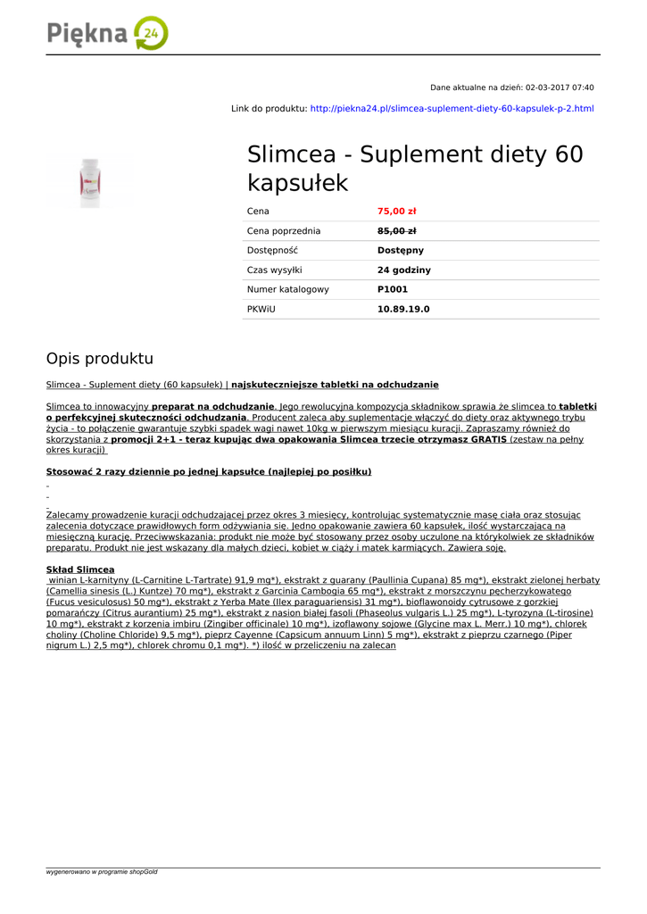 Dane aktualne na dzień: 02-03-2017 07:40 Link do produktu: http://piekna24.pl/slimcea-suplement-diety-60-kapsulek-p-2.html Slimcea - Suplement diety 60 kapsułek Cena 75,00 zł Cena poprzednia 85,00 zł Dostępność Dostępny Czas wysyłki 24 godziny Numer katalogowy P1001 PKWiU 10.89.19.0 Opis produktu Slimcea - Suplement diety (60 kapsułek) | najskuteczniejsze tabletki na odchudzanie Slimcea to innowacyjny preparat na odchudzanie. Jego rewolucyjna kompozycja składnikow sprawia że slimcea to tabletki o perfekcyjnej skuteczności odchudzania. Producent zaleca aby suplementacje włączyć do diety oraz aktywnego trybu życia - to połączenie gwarantuje szybki spadek wagi nawet 10kg w pierwszym miesiącu kuracji. Zapraszamy również do skorzystania z promocji 2+1 - teraz kupując dwa opakowania Slimcea trzecie otrzymasz GRATIS (zestaw na pełny okres kuracji) Stosować 2 razy dziennie po jednej kapsułce (najlepiej po posiłku) Zalecamy prowadzenie kuracji odchudzającej przez okres 3 miesięcy, kontrolując systematycznie masę ciała oraz stosując zalecenia dotyczące prawidłowych form odżywiania się. Jedno opakowanie zawiera 60 kapsułek, ilość wystarczającą na miesięczną kurację. Przeciwwskazania: produkt nie może być stosowany przez osoby uczulone na którykolwiek ze składników preparatu. Produkt nie jest wskazany dla małych dzieci, kobiet w ciąży i matek karmiących. Zawiera soję. Skład Slimcea winian L-karnityny (L-Carnitine L-Tartrate) 91,9 mg*), ekstrakt z guarany (Paullinia Cupana) 85 mg*), ekstrakt zielonej herbaty (Camellia sinesis (L.) Kuntze) 70 mg*), ekstrakt z Garcinia Cambogia 65 mg*), ekstrakt z morszczynu pęcherzykowatego (Fucus vesiculosus) 50 mg*), ekstrakt z Yerba Mate (Ilex paraguariensis) 31 mg*), bioflawonoidy cytrusowe z gorzkiej pomarańczy (Citrus aurantium) 25 mg*), ekstrakt z nasion białej fasoli (Phaseolus vulgaris L.) 25 mg*), L-tyrozyna (L-tirosine) 10 mg*), ekstrakt z korzenia imbiru (Zingiber officinale) 10 mg*), izoflawony sojowe (Glycine max L. Merr.) 10 mg*), chlorek choliny (Choline Chloride) 9,5 mg*), pieprz Cayenne (Capsicum annuum Linn) 5 mg*), ekstrakt z pieprzu czarnego (Piper nigrum L.) 2,5 mg*), chlorek chromu 0,1 mg*). *) ilość w przeliczeniu na zalecan wygenerowano w programie shopGold Powered by TCPDF (www.tcpdf.org)