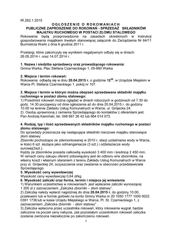 IR.262.1.2015 OGŁOSZENIE O ROKOW ANI ACH PUBLICZNE ZAPROSZENIE DO ROKOWAŃ - SPRZEDAŻ SKŁADNIKÓW MAJĄTKU RUCHOMEGO W POSTACI ZŁOMU STALOWEGO Rokowania będą przeprowadzone na zasadach określonych w Instrukcji gospodarowania majątkiem trwałym stanowiącej załącznik do Zarządzenia Nr 64/11 Burmistrza Warki z dnia 6 grudnia 2011 r. Przetargi, które zakończyły się wynikiem negatywnym odbyły się w dniach: 26.05.2014 r. oraz 14.07.2014 r. 1. Nazwa i siedziba sprzedawcy oraz prowadzącego rokowania: Gmina Warka, Plac Stefana Czarnieckiego 1, 05-660 Warka 2. Miejsce i termin rokowań: Rokowania odbędą się w dniu 20.04.2015 r. o godzinie 1230, w Urzędzie Miejskim w Warce Pl. Stefana Czarnieckiego 1. pokój nr 107. 3. Miejsce i termin w którym można obejrzeć sprzedawane składniki majątku ruchomego w postaci złomu stalowego: 1) Przedmiot rokowań można oglądać w dniach roboczych w godzinach od 7.30 do godz. 14.30 począwszy od dnia ogłoszenia aż do dnia 20.04.2015 r. do godziny 10.00 na terenie Zakładu Usług Komunalnych w Warce, ul. Grójecka 24. 2) Osobą uprawnioną z ramienia Sprzedającego do kontaktów z oferentami jest: Pan Andrzej Kamiński, tel. 048 667 26 42 lub 664 014 073. 4. Rodzaj, typ i ilość sprzedawanych składników majątku ruchomego w postaci złomu stalowego: Do sprzedaży przeznacza się następujące składniki rzeczowe majątku stanowiące złom stalowy: Zbiorniki pochodzące ze zdemontowanej w 2010 r. stacji uzdatniania wody w Warce, w ilości 6 szt. służące jako odmanganiacze (3 szt.) i odżelaziacze wody surowej(3szt.). Każdy ze zbiorników posiada całkowitą wysokość 3 400 mm i średnicę 2 450 mm. W ramach ceny zakupu oferent zobowiązany jest do odbioru w/w zbiorników, na własny koszt i własnym staraniem z terenu Zakładu Usług Komunalnych w Warce przy ul. Grójeckiej 24, oczyszczenia oraz zważenia w obecności przedstawiciela Sprzedającego. 5. Wysokość ceny wywoławczej Wysokość ceny wywoławczej 0,64 zł/kg 6. Wysokość zaliczki oraz forma, termin i miejsce jej wniesienia 1) Warunkiem uczestnictwa w rokowaniach jest wpłacenie zaliczki wynoszącej 1 200 zł z zaznaczeniem „Zaliczka zbiorniki – złom stalowy”. 2) Zaliczkę należy wpłacić najpóźniej do dnia 20.04.2015 r. do godziny 10.00, przelewem lub w formie gotówki na konto Gminy Warka nr 20 1050 1777 1000 0022 0391 1736 lub w kasie Urzędu Miejskiego w Warce, Pl. St. Czarnieckiego 1, z zaznaczeniem „Zaliczka zbiorniki - złom stalowy” . 3) Zaliczka wpłacona przez uczestnika rokowań, który rokowania wygrał, będzie zaliczona na poczet ceny nabycia, zaś pozostałym uczestnikom rokowań zaliczka zostanie zwrócona niezwłocznie po zakończeniu rokowań. 1 4) Zaliczka przepada na rzecz sprzedawcy, jeżeli oferent, który wygrał rokowania uchyli się od zawarcia umowy. 7. Miejsce i termin zgłoszenia udziału w rokowaniach: 1) Osoby zainteresowane nabyciem zbiorników w postaci złomu stalowego winny złożyć w Biurze Obsługi Interesanta Urzędu Miejskiego w Warce, Pl. Stefana Czarnieckiego 1, w terminie do dnia 20.04.2015 r. do godz. 10,00 pisemne zgłoszenie udziału w rokowaniach, w zamknie tej kopercie z napisem „Rokowania zbiorniki – złom stalowy”. 2) Zgłoszenie powinno zawierać: - imię, nazwisko i adres albo nazwę firmy oraz siedzibę jeżeli zgłaszający jest osobą prawną lub innym podmiotem, - datę sporządzenia zgłoszenia, - oświadczenie, że zgłaszający zapoznał się z warunkami rokowań i przyjmuje te warunki bez zastrzeżeń, - proponowaną cenę nabycia i sposób jej zapłaty, - kopię dowodu wpłaty zaliczki - proponowany sposób realizacji dodatkowych warunków rokowań. Organizatorowi rokowań przysługuje prawo ich zamknięcia bez wybrania nabywcy, bez podania przyczyny. Osoba ustalona jako nabywca jest zobowiązana do zawarcia umowy, w terminie ustalonym przez Burmistrza Warki. Ogłoszenie o rokowaniach, wzór zgłoszenia i umowy są dostępne na stronie internetowej www.warka.pl Ponadto z wymienionymi dokumentami można zapoznać się w Urzędzie Miejskim w Warce w pok. Nr 106 w godz. 9-15. Burmistrz Warki /-/ Dariusz Gizka 2