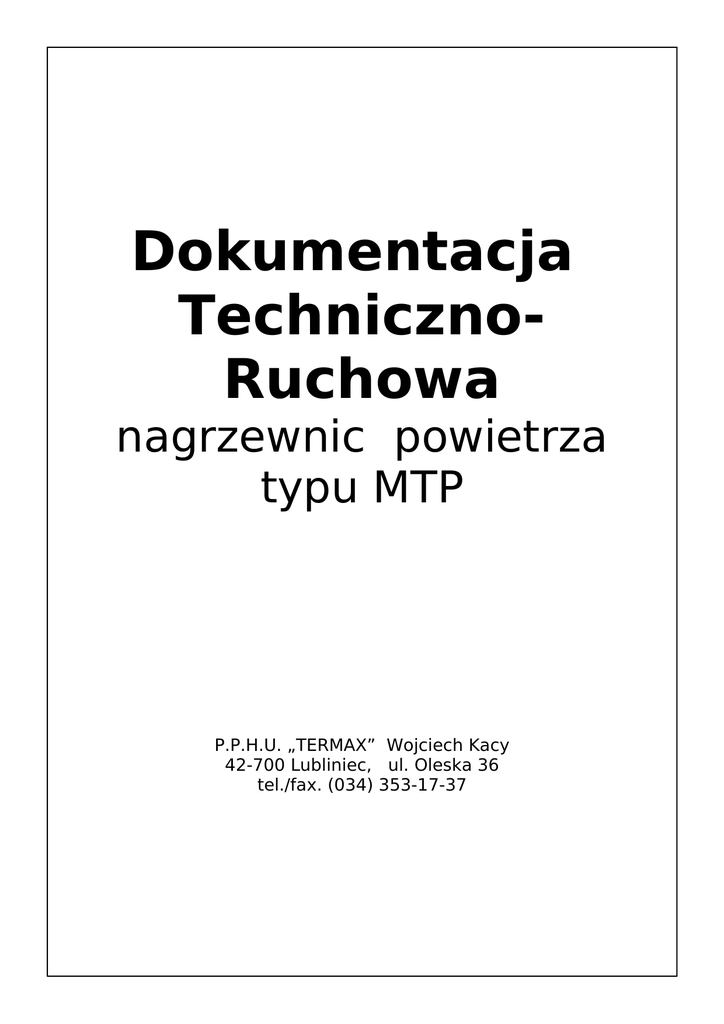 Dokumentacja TechnicznoRuchowa nagrzewnic powietrza typu MTP P.P.H.U. „TERMAX” Wojciech Kacy 42-700 Lubliniec, ul. Oleska 36 tel./fax. (034) 353-17-37 -1- NAGRZEWNICA POWIETRZA MTP Opis Bezpośrednie ogrzewanie powietrza ciekłym (olej opałowy). paliwem stałym (miał węglowy, ekogroszek) lub Pozycja pracy stojąca lub leżąca . Wymiennik ciepła wykonany ze stali węglowej; od strony palnika dostępne otwory do czyszczenia, dla palnika retortowego dodatkowo drzwi obsługowe i do usuwania popiołu Przyłączenie odprowadzenia spalin możliwe z 3 stron (z lewej i prawej strony oraz z tyłu) Komin musi zapewnić wymagane podciśnienie w zależności od rodzaju paliwa: olej-00Pa, ekogroszek-40Pa, pomiar na czopuchu wymiennika. Osłona zewnętrzna: Budowy ramowej z blachy stalowej, izolacja z wełny mineralnej zabezpieczonej przed promieniowaniem. Wentylator: wbudowany lub wolnostojący wentylator promieniowy. Wirnik wyważony statycznie i dynamicznie, łożyskowanie wału we wzmocnionych łożyskach tocznych. Silnik z urządzeniem napinającym i kompletnym napędem z pasem klinowym. Potrójny termostat: czujnik, ogranicznik, termostat zabezpieczający, montowany z boku. Szafa sterująca montowana w komplecie lub osobno. Okablowanie w skrzynce zaciskowej Na życzenie MTP-O, bez wentylatora. MTP-B, z obejściem. MTP-H, z maksymalną temperaturą do 295°C Testowane w 1997 przez Ośrodek Badawczo-Rozwojowy Gospodarki Energetycznej w Katowicach. Sprawność ogólna nagrzewnicy 90 % dla temp. powietrza 80°C paliwo olej opałowy, przy opalaniu ekogroszkiem sprawność ogólna 83%. Sprawność cieplna jest o ok.0,4 - 1,4 % wyższa Maksymalna temperatura powietrza na wlocie ts = 20°C przy wentylatorach w obudowie. Uwaga : Temperatura gazów spalinowych nie może być niższa niż 170°C Długa żywotność . Wiele urządzeń o podobnej konstrukcji jeszcze będących w użyciu pracuje już ponad 25 lat -2- Podstawowe wymiary nagrzewnicy powietrza z palnikiem retortowym -3- Podstawowe wymiary nagrzewnicy powietrza z palnikiem olejowym -4- -5- -6Podstawowe Dane Techniczne Typ Moc kw Wydajność w entylatora przy temp.20°C m3/s Moc wentylatora kW Ciężar kg 25 25 37 37 50 50 65 65 85 85 100 125 150 175 225 300 350 450 650 800 1000 100 125 150 175 225 300 350 450 650 800 1000 0,72 0,77 1,05 1,38 1,8 2,13 2,66 3,19 3,72 4,81 6,39 7,47 9,5 12,4 16,4 20,4 0,25 0,25 0,37 0,75 0,55 1,1 2,2 .3,0 3 4 5,5 7,5 11 15 15 18 245 245 315 325 440 445 615 615 825 850 1130 1140 1970 2910 4625 4650 Wymiary A B C D E F G H 25 37 50 65 85 100 1480 1480 1620 1620 1835 1835 880 880 1090 1090 1310 1310 590 590 660 660 790 790 1305 1305 1380 1380 1555 1555 315 315 315 315 365 365 915 915 940 940 1025 1025 1795 1795 1935 1935 2200 2200 150 150 150 150 150 150 125 2120 1410 1010 1835 365 1150 2485 200 150 2120 1410 1010 1835 365 1150 2485 200 175 2220 1510 1160 1910 435 1150 2655 200 225 2220 1510 1160 1910 435 1150 2655 200 300 2730 2050 1370 2300 435 1400 3165 250 350 2730 2050 1370 2300 435 1400 3165 250 450 2765 2710 1430 2480 565 1405 3330 300 650 2795 2810 1575 2500 615 1507 3512 350 800 4060 3312 2012 3850 615 1880 4675 250 1000 4060 3312 2012 3850 615 1880 4675 250 Dla miału i eko-groszku wymiary danego typoszeregu z następnej kolumny tabeli Na indywidualne zamówiene dostępne nagrzewnice do 5000 kW Montaż Począwszy od wielkości 450 (lub na życzenie klienta poniżej wielkości 450) , nagrzewnicę MTP dostarcza się w stanie niezmontowanym, w następujących podzespołach : Kompletny cokół wentylatorowy z umieszczonymi w górnym otworze płytami licowymi, poprzeczkami, ramą przykrywającą i innymi akcesoriami . Wymiennik ciepła. Na zamówienie, wymiennik ciepła może być także dostarczony w stanie rozłożonym . Obudowa wymiennika rama aluminiowa lub stalowa i kasety stalowe izolowane cieplnie Wyposażenie zapakowane pojedynczo . Montaż następuje na miejscu . Przy ustawieniu cokołu wentylatora, należy mieć na uwadze, by dookoła było wystarczająco dużo miejsca do montażu oraz późniejszej konserwacji i czyszczenia nagrzewnicy MTP . Wskazówki ułatwiające montaż nagrzewnic u klienta: 1. Oczyścić powierzchnię podłogi, żeby zapewnić solidne, wolne od wibracji oparcie . Ustawić cokół wentylatora . -72. Postawić wymiennik ciepła na cokole wentylatora, ale go jeszcze nie przykręcać . Usunąć kołnierz mocujący palnik . Dla wymienników ciepła, które zostały rozmontowane na komorę spalania i wymiennik rurowy, należy zwrócić szczególną uwagę na ułożenie sznura azbestowego w czasie łączenia śrubami . 3. Nałożyć pionowe belki, wkładki rozdzielające oraz ramę przykrywającą . Wyprostować i połączyć śrubami . 4. Ustawić wymiennik ciepła . Od przodu : kołnierz palnika równo z zewnętrznymi krawędziami pionowych belek . Z boków : zachować równe odstępy . Połączyć śrubami wymiennik ciepła z korpusem wentylatora . 5. Przykręcić płyty osłonowe Zwrócić uwagę na oznaczenia poszczególnych płyt (z przodu jest strona palnika) . Płyty przykręcić śrubami w narożnikach , w razie potrzeby dopasować ramy do płyt osłonowych przez podklinowanie . Wkręcić pozostałe śruby i docisnąć do gumy uszczelniającej . Nie dociskać za mocno, by uniknąć miejscowego ściskania . 6. Przykręcić kołnierz palnika przez otwory przewidziane do mocowania . Urządzenie w wykonaniu leżącym musi najpierw zostać złożone w pozycji stojącej . Przed położeniem, przymocować ramę-podstawę . Termostat zabezpieczający Oprócz zgodnego z przepisami, samoczynnego termostatu zabezpieczającego wymagany jest termostat wentylatora . Bez tego urządzenia zabezpieczającego nie wolno uruchamiać kotła MTP . Zgodny z przepisami termostat zabezpieczający jest gwarancją bezpieczeństwa pracy i bez awaryjności . Kompletnie wyposażone nagrzewnic MTP montowane jest fabrycznie Termostat zabezpieczający z bezpiecznikiem automatycznym (ogranicznik temperatu