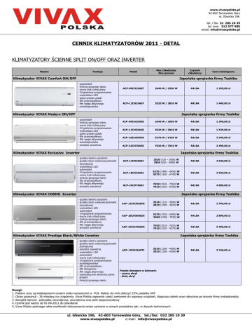 www.vivaxpolska.pl 42-603 Tarnowskie Góry ul. Gliwicka 196 tel. / fax 32 285 10 39 tel. kom. 512 577 980 email: [email protected] CENNIK KLIMATYZATORÓW 2011 - DETAL KLIMATYZATORY ŚCIENNE SPLIT ON/OFF ORAZ INVERTER Nazwa Funkcje Model Moc chłodzenia Moc grzania Klimatyzator VIVAX Comfort ON/OFF Czynnik chłodniczy Cena katalogowa Japońska sprężarka firmy Toshiba - autorestart funkcja gorącego startu nocny tryb cichej pracy 24-godzinne programowanie wyświetlacz LED panel przedni płaski filtr przeciwpyłkowy filtr węgla aktywnego autodiagnostyka - autorestart funkcja gorącego startu nocny tryb cichej pracy 24-godzinne programowanie wyświetlacz LED panel przedni płaski filtr przeciwpyłkowy filtr węgla aktywnego autodiagnostyka jonizator powietrza ACP-09CH25AEF 2640 W / 2930 W R410A 1 299,00 zł ACP-12CH35AEF 3520 W / 3810 W R410A 1 449,00 zł Klimatyzator VIVAX Modern ON/OFF Japońska sprężarka firmy Toshiba ACP-09CH25AEG 2640 W / 2930 W R410A 1 399,00 zł ACP-12CH35AEG 3520 W / 3810 W R410A 1 529,00 zł ACP-18CH50AEG 5270 W / 5420 W R410A 2 349,00 zł ACP-24CH70AEG 7030 W / 7910 W R410A 3 499,00 zł Klimatyzator VIVAX Exclusive Inverter - grzałka karteru sprężarki - grzałka tacki ociekowej jednostki zewnętrznej - wyświetlacz LED - autorestart - 24-godzinne programowanie - nocny tryb cichej pracy - funkcja gorącego startu - filtr przeciwpyłkowy - filtr węgla aktywnego - jonizator powietrza Japońska sprężarka firmy Toshiba ACP-12CH35AEI 3520 (720 – 3950) W 3850 (820 - 4690) W R410A 2 549,00 zł ACP-18CH50AEI 5270 (1490 – 6450) W 5570 (1550 - 6740) W R410A 3 549,00 zł ACP-24CH70AEI 7030 (3520 - 7360) W 7910 (3220 - 8790) W R410A 4 899,00 zł Klimatyzator VIVAX COSMO Inverter Japońska sprężarka firmy Toshiba - grzałka karteru sprężarki - grzałka tacki ociekowej jednostki zewnętrznej - wyświetlacz LED - autorestart - 24-godzinne programowanie - nocny tryb cichej pracy - funkcja gorącego startu - filtr przeciwpyłkowy - filtr węgla aktywnego - jonizator powietrza ACP-12CH35AEDI 3510 (1110 - 4040) W 3810 (1000 - 4830) W R410A 2 799,00 zł ACP-18CH50AEDI 5270 (1520 - 6590) W 5560 (1550 - 7030) W R410A 3 899,00 zł ACP-24CH70AEDI 7030 (3510 - 7620) W 7910 (3220 - 9370) W R410A 5 499,00 zł Klimatyzator VIVAX Prestige Black/White Inverter - grzałka karteru sprężarki - grzałka tacki ociekowej jednostki zewnętrznej - jonizator powietrza - wyświetlacz LED - autorestart - nocny tryb cichej pracy - 24-godzinne programowanie - autodiagnostyka - filtr przeciwpyłkowy - filtr biologiczny - filtr węgla aktywnego - automatycznie otwierany panel przedni - funkcja gorącego startu Japońska sprężarka firmy Toshiba ACP-12CH35AETI 3510 (1100 - 4400) W 3810 (1200 - 4500) W R410A 3 749,00 zł Panele dostępne w kolorach: - czarny akryl - biały akryl Uwagi: 1. Podane ceny są katalogowymi cenami netto wyrażonymi w PLN. Należy do nich doliczyć 23% podatku VAT. 2. Okres gwarancji : 36 miesięcy na urządzenia. Vivax Polska zapewnia części zamienne do naprawy urządzeń, diagnoza usterki oraz robocizna po stronie firmy instalatorskiej 3. Komplet stanowi jednostka wewnętrzna, zewnętrzna oraz pilot bezprzewodowy 4. Cennik jest ważny od 01-04-2011 do odwołania 5. Vivax Polska zastrzega sobie możliwość dokonywania zmian zarówno w cenach produktów jak i w danych technicznych. ul. Gliwicka 196, 42-603 Tarnowskie Góry, tel./fax: 032 285 10 39 www.vivaxpolska.pl e-mail: [email protected] www.vivaxpolska.pl 42-603 Tarnowskie Góry ul. Gliwicka 196 tel. / fax 32 285 10 39 tel. kom. 512 577 980 email: [email protected] KLIMATYZATORY TYPU MULTI SPLIT INVERTER Nazwa Funkcje Moc chłodzenia Moc grzania Czynnik chłodniczy Cena katalogowa ACP-07CIFM21GECI 2100 W / 2600 W R410A 689,00 zł ACP-09CIFM25GECI 2600 W / 2800 W R410A 699,00 zł ACP-12CIFM35GECI 3520 W / 3800 W R410A 849,00 zł ACP-18CIFM50GECI 5300 W / 5800 W R410A 949,00 zł ACP-12CCIFM35GECI 3520 W / 3850 W R410A 1 349,00 zł ACP-18CCIM50GECI 5000 W / 5500 W R410A 1 599,00 zł ACP-12CTIFM35GECI 3520 W / 3800 W R410A 1 299,00 zł ACP-18CTIFM50GECI 5300 W / 5800 W R410A 1 599,00 zł Model Klimatyzator VIVAX Luxury Multi Inverter jednostki wewnętrzne ścienne - funkcja gorącego startu autorestart 24-godzinne programowanie autodiagnostyka wyświetlacz LED filtr przeciwpyłkowy pilot bezprzewodowy Klimatyzator VIVAX Supreme Multi Inverter jednostki wewnętrzne kasetonowe - funkcja gorącego startu autorestart 24-godzinne programowanie autodiagnostyka wbudowana pompka skroplin filtr przeciwpyłkowy wyświetlacz LED pilot bezprzewodowy Klimatyzator VIVAX Unique Multi Inverter jednostki wewnętrzne konsolowe - funkcja gorącego startu autorestart 24-godzinne programowanie autodiagnostyka wyświetlacz LED filtr przeciwpyłkowy pilot bezprzewodowy Klimatyzator VIVAX Multi Inverter jednostki zewnętrzne - grzałka karteru sprężarki - grzałka tacki ociekowej jednostki zewnętrznej - autorestart - 24-godzinne programowanie - autodiagnostyka Japońska sprężarka firmy Mitsubishi, Sanyo ACP-18COFM50GECI max. ilość jednostek wewnętrznych : 2 ACP-24COFM70GECI max. ilość jednostek wewnętrznych : 3 5000 (2050 - 6200) W 5600 (2500 - 6650) W R410A 2 999,00 zł 7100 (2200 - 10000) W 8500 (3600 - 11000) W R410A 4 649,00 zł 8000 (2200 – 10000) W 9300 (2800 - 11000) W R410A 4 899,00 zł 11600 (2700 – 17400) W 13000 (2800 - 19500) W R410A 6 699,00 zł Moc chłodzenia Moc grzania Czynnik chłodniczy Cena katalogowa ACP-28COFM80GECI max. ilość jednostek wewnętrznych : 4 ACP-39COFM116GECI max. ilość jednostek wewnętrznych : 5 KLIMATYZATORY KASETONOWE INVERTER Nazwa Funkcje Model Klimatyzator kasetonowy VIVAX Supreme Inverter - grzałka karteru sprężarki - grzałka tacki ociekowej jednostki zewnętrznej - funkcja gorącego startu - autorestart - 24-godzinne programowanie - autodiagnostyka - wbudowana pompka skroplin - filtr przeciwpyłkowy - wyświetlacz LED - pilot bezprzewodowy Japońska sprężarka firmy M