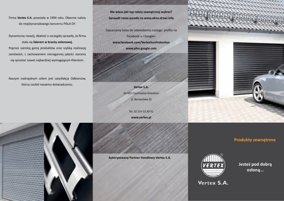 Nie wiesz jaki typ rolety zewnętrznej wybrać? Firma Vertex S.A. powstała w 1994 roku. Obecnie należy Sprawdź nasze porady na www.okna-drzwi.info do międzynarodowego koncernu PISLA OY. Zapraszamy także do odwiedzenia naszego profilu na Dynamiczny rozwój, dbałość o szczegóły sprawiły, że firma Facebook`u i Google+ stała się liderem w branży osłonowej. www.facebook.com/VertexSunProtection Poprzez szeroką gamę produktów oraz szybką realizację www.plus.google.com zamówień, z zachowaniem nienagannej jakości staramy się sprostać nawet najbardziej wymagającym Klientom. Naszym nadrzędnym celem jest satysfakcja Odbiorców, którzy zaufali naszemu doświadczeniu. Vertex S.A. 43-502 Czechowice-Dziedzice ul. Bestwińska 25 Tel. 32 214 53 30-31 www.vertex.pl Produkty zewnętrzne Autoryzowany Partner Handlowy Vertex S.A. Jesteś pod dobrą osłoną... ROLETY ZEWNĘTRZNE BRAMY GARAŻOWE MOSKITIERY Główne zalety rolet zewnętrznych: Najczęściej stosowane jako Stanowią doskonałe zabezpiecze- • stanowią dobrą izolację cieplną, tym samym przyczyniają się do zabezpieczenie do- nia wnętrz przed insektami. Siatka zmniejszenia kosztów ogrzewania; pasowane kolorystycznie z włókna szklanego pozwala na • zwiększają izolację akustyczną pomieszczeń; do zewnętrznych. swobodną cyrkulację powietrza • stanowią dodatkową ochronę otworu okiennego przed czynnikami atmosferycznymi i zabrudzeniami; • podnoszą standard budynku; • można je zastosować zarówno w nowych jak i już powstałych budynkach. Dostępnych rozwiązań jest wiele, także pod kątem funkcjonalności, możlwości montażowych oraz indywidualnych oczekiwań i preferencji Klienta. rolet Każdą bramę garażu, wyposażoną w napęd można obsługiwać ręcznie, jest a ciężar bramy równoważony przez sprężyny skrętne (dobierane komputerowo, indywidualnie, zależnie od wielkości bramy). BRAMY GARAŻOWE I KRATY ROLOWANE nie powodując zaciemnienia pomieszczenia. Moskitiery to rozwiązanie do domów i mieszkań prywatnych, ułatwiają także pracę w biurach w upalne dni, kiedy insekty atakują ze zdwojoną siłą. W ofercie Vertex S.A. znajdą Państwo: Oferujemy kilka systemów rolet zewnętrznych: Oferujemy bramy garażowe oraz kraty rolowane w skrzynkach Moskitiery ramowe i kołnierzowe, montowane bezinwazyjnie na Rolety podtynkowe, instalowane po zamontowaniu okien a przed aluminiowych lub z zastosowaniem konsoli ruchomej, z kilkoma haczykach, które licują się z ramą okna; ociepleniem budynku; opcjami prowadnic do wyboru. Możliwości zastosowania napę- Moskitiery typu Vertica, rolowane w kasecie z prowadnicami Rolety nadstawne, instalowane na etapie montażu okien i zinte- du elektrycznego z fotokomórkami i pilotami, napędu NHK który z PCV lub aluminium, do stosowania na okna i drzwi; growane z nimi, wymagają powiększonego otworu okiennego; pozwoli awaryjnie zamknąć/otworzyć bramę czy kratę, hamulców Moskitiery drzwiowe, z profili aluminiowych, dostępne moskitie- Rolety RKS, instalowane na etapie wznoszenia murów; inercyjnych. Listwy dolne pokryte są uszczelkami gumowymi. ry zawiasowe pojedyncze, podwójne, przesuwne; Moskitiery Plisse, najnowsze rozwiązanie, z charakterystycznie Rolety w systemie elewacyjnym, montowane do wykończonego budynku, do wyboru m.in. skrzynki kwadratowe, półokrągłe, ćwierćokrągłe. Przede wszystkim wygoda i bezpieczeństwo! ułożoną siatką plisowaną która po złożeniu całkowicie chowa się w profilu bocznym, możliwość łączenia moskitiery w segmenty.
