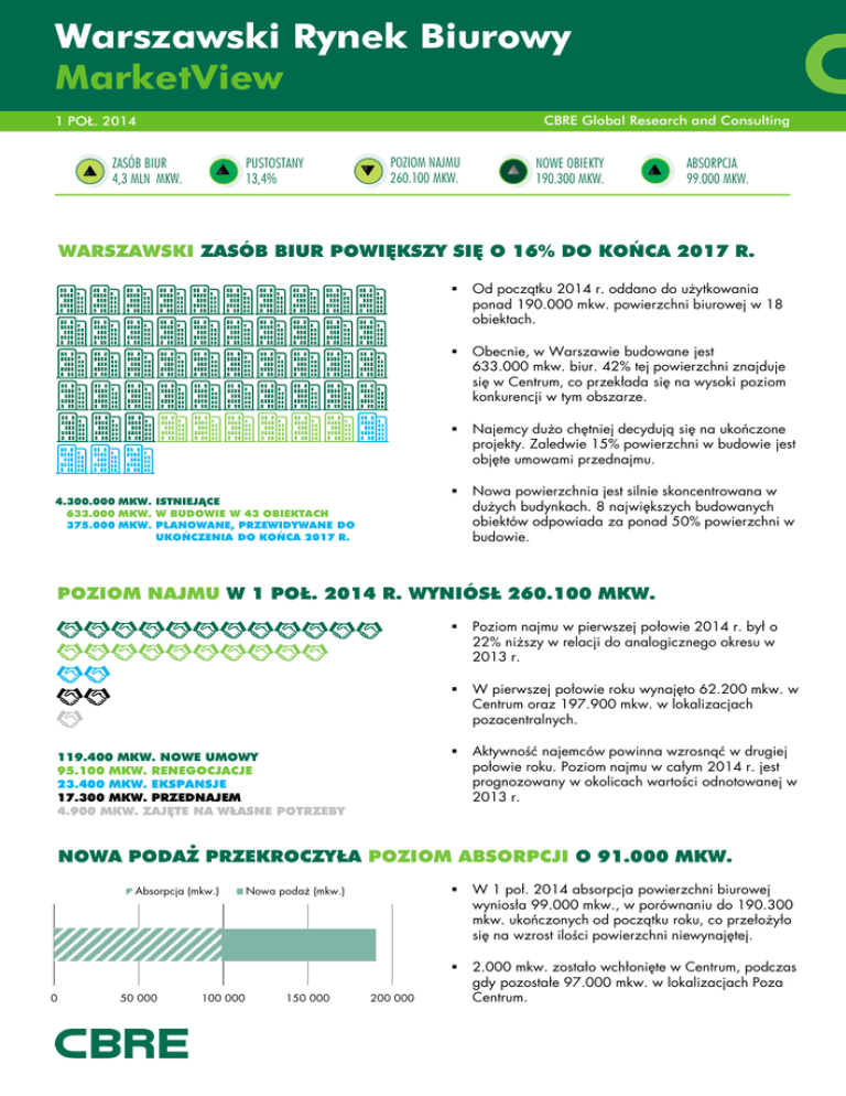 Warszawski Rynek Biurowy MarketView CBRE Global Research and Consulting 1 POŁ. 2014 ZASÓB BIUR 4,3 MLN MKW. PUSTOSTANY 13,4% POZIOM NAJMU 260.100 MKW. NOWE OBIEKTY 190.300 MKW. ABSORPCJA 99.000 MKW. WARSZAWSKI ZASÓB BIUR POWIĘKSZY SIĘ O 16% DO KOŃCA 2017 R. 4.300.000 MKW. ISTNIEJĄCE 633.000 MKW. W BUDOWIE W 43 OBIEKTACH 375.000 MKW. PLANOWANE, PRZEWIDYWANE DO UKOŃCZENIA DO KOŃCA 2017 R. Od początku 2014 r. oddano do użytkowania ponad 190.000 mkw. powierzchni biurowej w 18 obiektach. Obecnie, w Warszawie budowane jest 633.000 mkw. biur. 42% tej powierzchni znajduje się w Centrum, co przekłada się na wysoki poziom konkurencji w tym obszarze. Najemcy dużo chętniej decydują się na ukończone projekty. Zaledwie 15% powierzchni w budowie jest objęte umowami przednajmu. Nowa powierzchnia jest silnie skoncentrowana w dużych budynkach. 8 największych budowanych obiektów odpowiada za ponad 50% powierzchni w budowie. POZIOM NAJMU W 1 POŁ. 2014 R. WYNIÓSŁ 260.100 MKW. 119.400 MKW. NOWE UMOWY 95.100 MKW. RENEGOCJACJE 23.400 MKW. EKSPANSJE 17.300 MKW. PRZEDNAJEM 4.900 MKW. ZAJĘTE NA WŁASNE POTRZEBY Poziom najmu w pierwszej połowie 2014 r. był o 22% niższy w relacji do analogicznego okresu w 2013 r. W pierwszej połowie roku wynajęto 62.200 mkw. w Centrum oraz 197.900 mkw. w lokalizacjach pozacentralnych. Aktywność najemców powinna wzrosnąć w drugiej połowie roku. Poziom najmu w całym 2014 r. jest prognozowany w okolicach wartości odnotowanej w 2013 r. NOWA PODAŻ PRZEKROCZYŁA POZIOM ABSORPCJI O 91.000 MKW. Absorpcja (mkw.) Nowa podaż (mkw.) W 1 poł. 2014 absorpcja powierzchni biurowej wyniosła 99.000 mkw., w porównaniu do 190.300 mkw. ukończonych od początku roku, co przełożyło się na wzrost ilości powierzchni niewynajętej. 2.000 mkw. zostało wchłonięte w Centrum, podczas gdy pozostałe 97.000 mkw. w lokalizacjach Poza Centrum. 1 0 50 000 100 000 150 000 200 000 pesymistyczny realistyczny optymistyczny Ze względu na stosunkowo duży poziom powierzchni biurowej w budowie, poziom pustostanów wzrasta stopniowo od ostatnich 3 lat. Nawet w przypadku najbardziej optymistycznego scenariusza, ilość pustostanów będzie zwiększać się w najbliższym czasie i może sięgnąć 19% w połowie 2016 r. Odsetek powierzchni niewynajętej wyniósł 13,6% w Centrum oraz 13,3% Poza Centrum. Pod koniec 1 poł. 2014, współczynnik pustostanów w obiektach klasy A wyniósł 14,6% oraz 12,5% w budynkach klasy B. 24% 22% 20% 18% 16% 14% 12% 10% 8% 6% 4% 4 kw. 2016 3 kw. 2016 2 kw. 2016 1 kw. 2016 4 kw. 2015 3 kw. 2015 2 kw. 2015 1 kw. 2015 4 kw. 2014 3 kw. 2014 2 kw. 2014 1 kw. 2014 4 kw. 2013 3 kw. 2013 1 POŁ. 2014 Warszawski Rynek Biurowy | MarketView PUSTOSTANY NA POZIOMIE 13,4% UTRZYMUJĄ TREND WZROSTOWY 10 NAJWIĘKSZYCH UMÓW NAJMU OD POCZĄTKU 2014 R. Firma Budynek Powierzchnia (mkw.) Typ umowy Doradztwo CBRE Netia Marynarska Business Park 13.229 renegocjacje √ Citibank Marynarska 12 12.560 nowa + ekspansja PWC IBC 10.800 renegocjacje Sąd Okręgowy Płocka 9/11 6.000 nowa Nokia Siemens Networks Horizon Plaza 5.315 renegocjacje Polska Spółka Gazownictwa Bolero Office Point 5.000 nowa Gtech Brama Zachodnia 4.757 renegocjacje Altkom Warsaw Trade Tower 4.340 renegocjacje + ekspansja Provident Gdański Business Centre 4.058 przednajem 4.000 renegocjacje Domański Zakrzewski Palinka Rondo 1 √ √ √ 2 25,5 17,5 15,0 POZA CENTRUM CENTRUM UTRZYMUJĄCA SIĘ PRESJA NA SPADEK CZYNSZÓW 15,0 13,0 8,0 NAJWYŻSZE CZYNSZE TRANSAKCYJNE ŚREDNIE CZYNSZE TRANSAKCYJNE (KLASA A) ŚREDNIE CZYNSZE TRANSAKCYJNE (KLASA B) TREND (EUR/MKW./MIESIĄC) 1 POŁ. 2014 Warszawski Rynek Biurowy | MarketView KOMENTARZ RYNKOWY JOANNA MROCZEK DANIEL BIENIAS Dyrektor Starszy Dyrektor T +48 22 544 8061 M +48 500 000 583 [email protected] T +48 22 544 8024 M +48 501 433 618 [email protected] DORADZTWO I BADANIA RYNKU Najbliższe lata mogą przynieść nowe wyzwania na Aktywność najemców na warszawskim rynku biurowym rynku nieruchomości biurowych w Warszawie. W ciągu pozostaje silna. Wiele firm wykorzystuje moment kolejnych trzech lat stosunkowo duża ilość powierzchni wygaśnięcia umowy najmu do zwiększenia biurowej zostanie oddana do użytkowania w Centrum, wynajmowanej powierzchni. Mimo wszystko, sfera w szczególności w okolicach budowanej linii metra. kosztowa pozostaje podstawowym motorem rozwoju Zgodnie z zapowiedziami deweloperów, w latach rynku. Najemcy bardzo dobrze zdają sobie sprawę ze 2014-2016 ukończone zostanie 370.000 mkw. biur w zwiększonej konkurencji i dużej ilości ofert okolicach centrum miasta, w dużej mierze na zachód od deweloperów. W wielu przypadkach, przy Centralnego Obszaru Biznesu. Po ukończeniu tych przeprowadzce do nowego obiektu firmy są w stanie obiektów, zasób biurowy w Centrum zwiększy się o jednocześnie poprawić standard zajmowanej ponad 25%. powierzchni oraz uzyskać bardziej korzystne warunki Aktywność deweloperów w okolicach drugiej linii metra finansowe niż dotychczas. pokazuje jednoznacznie w którą stronę będzie Ponadto, wielu najemców decyduje się na relokację z rozwijało się biznesowe centrum stolicy w najbliższej centrum do nowych, efektywnych obiektów położonych przyszłości. na obrzeżach centrum lub jeszcze dalej – do parków Interesującą tendencją jest stosunkowo duża liczba biurowych zlokalizowanych poza centrum miasta. budynków, które są obecnie poddawane renowacjom. Mimo stopniowego wzrostu poziomu pustostanów, Przykładami takich obiektów są Ethos oraz Spektrum warszawski rynek biurowy w dalszym ciągu pozostaje Tower. Wymienione budynki zostały niedawno bardzo atrakcyjny dla deweloperów. Warszawa ciągle zwolnione przez dużych najemców i obecnie dysponuje obszarami o ograniczonej konkurencji, które przechodzą gruntowną modernizację w celu mogą stanowić ciekawą alternatywę dla największych zaoferowania wyższego standardu technicznego. dzielnic biurowych. Biorąc pod uw