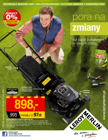 MATERIAŁY BUDOWLANE yt w ny o MAJSTERKOWANIE 1.0 d 23.03. do 0 ■ WYSTRÓJ WNĘTRZ ■ OGRODNICTWO pora na zmiany .2 01 2 r. k re d aż ■ 4 też bądź bohaterem w swoim domu 3 funkcje: kosz, wyrzut boczny, mielenie trawy centralna regulacja 898,- 995 TANIEJ O 97zł Kosiarka spalinowa z napędem JL46ZC3 B&S 500 Silnik: B&S dolnozaworowy. Maks. przeliczeniowa moc silnika: 4 KM. Poj. skokowa silnika: 158 cm3. Szer. koszenia: 44 cm. Regulacja wys. koszenia: centralna. Szer. korpusu: 46 cm. Korpus: stalowy. Poj. kosza: 55 l. Zalecana maks. pow. trawnika: 800 m2. kod 43972502 Kocham ogród.od 29.09. do 31.10.2010 r. Oferta ważna Ty też? Dołącz do nas www.facebook.com/kochamogrod www.leroymerlin.pl Oferta ważna od 21.03. do 10.04.2012 r. składane rączki pielęgnacja 7-poziomowa centralna regulacja wysokości koszenia trawnika 7,6 cm najwyższa jakość koszenia 125,- NAJTAŃSZY 790 NAJTAŃSZY Kosiarka pchana LIDER GC300 Korpus: stalowy. Zakres wys. koszenia: 15-40 mm. Regulacja koszenia: 3-poziomowa. Szer. koszenia: 30 cm. Poj. kosza: 20 l. Zalecana maks. pow. trawnika: 250 m2. Gwarancja: 2 lata. kod 43978046 Trawa uniwersalna Opak.: 0,9 kg. Popularna mieszanka o szerokim zastosowaniu. Nie ma dużych wymagań glebowych. Wystarcza na 36 m2. Cena za 1 kg: 8,78 zł. kod 43048236 Dostępne również: 159,Kosiarka elektryczna ME1030M Moc: 1000 W. Korpus: polipropylenowy. Szer. koszenia: 30 cm. Regulacja wys. koszenia: 3-poziomowa. Zakres wys. koszenia: 3-6 cm. Poj. kosza: 27 l. kod 44143113 1,9 cm 39,- kod 44237536 opak.: 9,5 kg 77,- kod 44237522 opak.: 4,5 kg 587,- kosiarka bardzo lekka i ergonomiczna Kosiarka spalinowa ES414 Maks. przeliczeniowa moc silnika: 3,5 KM. Poj. skokowa silnika: 148 cm3. Korpus: stalowy. Szer. koszenia: 39 cm. Regulacja wys. koszenia: 5-poziomowa. Zakres wys. koszenia: 3-6,7 cm. Poj. kosza: 55 l. kod 43977633 maks. przeliczeniowa moc silnika: 5,5 KM KORZYSTNY KORZYSTNY 22,- silnik z systemem łatwego rozruchu Trawa uniwersalna GEOLIA Opak.: 1 kg. Odporna na deptanie. Trawnik jest gęsty i wytrzymały, szybko i trwale rośnie na każdym podłożu. Wystarcza na 35 m2. Dołączony siewniczek zapewnia równomierny wysiew. kod 43769551 Dostępne również: opak.: 5 kg 99,- kod 43769565 opak.: 10 kg Kosiarka elektryczna ROTAK 32 Moc: 1200 W. Korpus: tworzywo ABS. Szer. koszenia: 32 cm. Regulacja wys. koszenia: 3-poziomowa. Zakres wys. koszenia: 2-6 cm. Poj. kosza: 31 l. Zalecana maks. pow. trawnika: 300 m2. kod 43684732 wyprodukowana przez B&S 1095,- 189,- kod 43769572 tylko w Leroy Merlin Kosiarka spalinowa BRUTE EBP22650E Maks. przeliczeniowa moc silnika: 5,5 KM. Poj. skokowa silnika: 190 cm3. Korpus: stalowy. Szer. koszenia: 54 cm. Regulacja wys. koszenia: 9-poziomowa. Zakres wys. koszenia: 3,5-10 cm. Poj. kosza: 80 l. kod 44190622 dekoracyjny charakter 1147,- ZNAKOMITY 34,Trawa uniwersalna VILMORIN Opak.: 1 kg. Odporna na deptanie. Odpowiednia na każdy teren. Pozwala uzyskać trawnik łatwy w utrzymaniu i odporny na suszę. Trawa ma delikatne źdźbła. Wystarcza na 40 m2. kod 42807443 Dostępne również opak.: 5 kg 139,kod 42807450 zakupy 335,- 3w1 1290 TANIEJ O 143zł funkcja mielenia 3w1 silnik z systemem łatwego rozruchu wyprodukowana przez B&S n kosze szer. ia 4 6 ZNAKOMITY 599,- tylko w Leroy Merlin cm 1395,- 1499 TANIEJ O OFERTA SPECJALNA 104 zł Kosiarka spalinowa z napędem BRUTE EBTP22650E Maks. przeliczeniowa moc silnika: 5,5 KM. Poj. skokowa silnika: 190 cm³. Korpus: stalowy. Szer. koszenia: 54 cm. Regulacja wys. koszenia: 9-poziomowa. Zakres wys. koszenia: 3,5-10 cm. Poj. kosza: 80 l. kod 44190664 Kosiarka spalinowa z napędem RLM4617SM Poj. skokowa silnika: 175 cm³. Korpus: stalowy. Szer. koszenia: 46 cm. Napęd na tylne koła. Zakres wys. koszenia: 1,9-7,6 cm. Poj. kosza: 55 l. kod 44190650 produkty z gazetki do kupienia także na ezakupy.leroymerlin.pl 3w1 silnik indukcyjny 2 3 napęd na przednie koła KREDYT 0% od 23.03. do 01.04.2012 r. Kosiarka elektryczna EL COMPACT PLUS 37E Moc: 1500 W. Korpus: polipropylen. Szer. koszenia: 37 cm. Regulacja wys. koszenia: centralna, 5-poziomowa. Zakres wys. koszenia: 2-6 cm. Poj. kosza: 35 l. kod 44190132 pielęgnacja Przygotowujemy sprzęt do eksploatacji ogrodu NAJTAŃSZY 267,- zbiorniczek na mieszankę paliwową w komplecie możliwość obsługi jedną ręką składana rączka ułatwiająca przechowywanie Wertykulator i aerator elektryczny N1B-JY-30 Moc: 1300 W. Szer. robocza: 32 cm. Regulacja gł. pracy: 5-poziomowa. Zakres gł. roboczej: +10/-10 cm. Poj. kosza: 35 l. kod 43974742 199,Pilarka spalinowa HARDER PN3800 Moc: 1,5 KM. Poj. skokowa silnika: 37,2 cm³. Dł. prowadnicy: 34 cm. Podziałka łańcucha: 3/8. Prędkość przesuwu łańcucha: 20 m/s. kod 44099671 109,- dwukrotnie składana rączka szerokość robocza 37 cm OFERTA SPECJALNA 4999,- moc: 1,7 KM sz Wykdososi tępnych o w trudmn iejscach OFERTA SPECJALNA Traktor MTD SC 125/92 Maks. przeliczeniowa moc silnika: 12,5 KM. Szer. koszenia: 92 cm. Poj. kosza: 240 l. Liczba biegów: 5 i 1 wsteczny. kod 43695393 aluminiowy korpus gwarancja: 3 lata Podkaszarka elektryczna RLT3025F Moc: 300 W. kod 44191112 samoczynne wciąganie gałęzi szelki i metalowa tarcza w komplecie KORZYSTNY 346,- 285,- serwis firmy Husqvarna 329 TANIEJ O 44 zł Pilarka elektryczna STERWINS CS ILM-2 Moc: 2200 W. Dł. prowadnicy: 40 cm. Podziałka łańcucha: 3/8. Prędkość przesuwu łańcucha: 15 m/s. kod 44048256 598,- Wertykulator i aerator COMBO VE1438B Moc: 1400 W. Szer. robocza: 36/37 cm. Regulacja gł. pracy: 5-poziomowa, centralna. Zakres gł. roboczej: +10/-10 cm. Poj. kosza: 55 l. kod 43974665 Rozdrabniacz elektryczny MK-L771 Moc: 2600 W. Silnik indukcyjny. Maks. śr. gałęzi: 40 mm. Zabezpieczenie przeciążeniowe. kod 43869623 299,- ergonomiczna rączka gwarancja: 3 lata silnik górnozaworowy silnik górnozaworowy OHV Kosa spalinowa PNBC415-2T Poj. skokowa silnika: 42,7 cm3. Szer. robocza żyłki tnącej: 42 cm. Szer. robocza tarczy tnącej: 23 cm. kod 44191