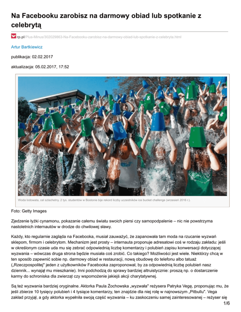 Na Facebooku zarobisz na darmowy obiad lub spotkanie z celebrytą rp.pl/Plus-Minus/302029863-Na-Facebooku-zarobisz-na-darmowy-obiad-lub-spotkanie-z-celebryta.html Artur Bartkiewicz publikacja: 02.02.2017 aktualizacja: 05.02.2017, 17:52 Woda lodowata, cel szlachetny. 2 tys. studentów w Bostonie bije rekord liczby uczestników ice bucket challenge (wrzesień 2016 r.). Foto: Getty Images Zjedzenie łyżki cynamonu, pokazanie całemu światu swoich piersi czy samopodpalenie – nic nie powstrzyma nastoletnich internautów w drodze do chwilowej sławy. Każdy, kto regularnie zagląda na Facebooka, musiał zauważyć, że zapanowała tam moda na rzucanie wyzwań sklepom, firmom i celebrytom. Mechanizm jest prosty – internauta proponuje adresatowi coś w rodzaju zakładu: jeśli w określonym czasie uda mu się zebrać odpowiednią liczbę komentarzy i polubień zapisu konwersacji dotyczącej wyzwania – wówczas druga strona będzie musiała coś zrobić. Co takiego? Możliwości jest wiele. Niektórzy chcą w ten sposób zapewnić sobie np. darmowy obiad w restauracji, nową obudowę do telefonu albo tatuaż („Rzeczpospolitej" jeden z użytkowników Facebooka zaproponował, by za odpowiednią liczbę polubień nasz dziennik... wynajął mu mieszkanie). Inni podchodzą do sprawy bardziej altruistycznie: proszą np. o dostarczenie karmy do schroniska dla zwierząt czy wspomożenie jakiejś akcji charytatywnej. Są też wyzwania bardziej oryginalne. Aktorka Paula Żochowska „wyzwała" reżysera Patryka Vegę, proponując mu, że jeśli zbierze 10 tysięcy polubień i 4 tysiące komentarzy, ten znajdzie dla niej rolę w najnowszym „Pitbullu". Vega zakład przyjął, a gdy aktorka wypełniła swoją część wyzwania – ku zaskoczeniu samej zainteresowanej – reżyser się 1/6 z nią skontaktował. Kto zapoczątkował tę modę? Jak w przypadku większości internetowych zjawisk odpowiedź nie jest prosta. Możliwe, że pierwszy był Damian, licealista z Zawiercia, który postanowił zaprosić na studniówkę prezenterkę Eska TV Olę Kot. Oczywiście Damian nie znał jej osobiście – ale śledził jej konto na Instagramie. Za pośrednictwem internetu zaproponował więc prezenterce wspólną studniówkową zabawę. Ola Kot się zgodziła – i zadeklarowała, że wyjdzie razem z Damianem za 20 tysięcy polubień ich rozmowy na Instagramie. Dużo? Okazało się, że nie – zwłaszcza, że chłopakowi postanowił pomóc raper Tede, który rozpowszechnił akcję zbierania lajków dla Damiana. A skoro słowo się rzekło – 28 stycznia finalistka konkursu Miss Polski 2009 towarzyszyła na studniówce maturzyście. Jeśli ktoś zainspirowany tymi historiami już zaczął zastanawiać się, jakiego celebrytę zaprosić na swoje urodziny, niestety prawdopodobnie się spóźnił – moda na tego rodzaju wyzwania ma już aż trzy tygodnie co oznacza, że jej schyłek jest bliski. Ale jest i dobra wiadomość: na pewno za chwilę pojawi się nowy rodzaj wyzwania. Bo internet nie służy już tylko do oglądania zdjęć kotów: dla wielu młodych ludzi to doskonała arena do udowodnienia czegoś sobie i światu. 22 pompki w słusznej sprawie Pierwszym internetowym wyzwaniem, o którym zrobiło się w Polsce głośno był tzw. ice bucket challenge. W tym przypadku chodziło o to, by pozwolić wylać sobie na głowę (lub zrobić to samemu) wiadro lodowato zimnej wody (i oczywiście pochwalić się tym w internecie). Latem 2014 roku na taką kąpiel zdecydowali się m.in. komendant główny policji Marek Działoszyński i szef CBA Paweł Wojtunik, a także Wojciech Szczęsny, Robert Lewandowski, Zbigniew Boniek i Monika Olejnik. W USA w akcji wzięli udział m.in. George W. Bush i Bill Gates. Czemu znani i lubiani postanowili pokazywać światu, jak wylewają sobie na głowę wodę? Powodem był szlachetny cel całej akcji, która miała za zadanie zwrócenie uwagi na problem chorych na stwardnienie zanikowe boczne (ALS) – nieuleczalną chorobę układu nerwowego. Nominowani do udziału w zabawie mogli albo wylać sobie na głowę wiadro wody, albo wspomóc jedną z fundacji zajmujących się pomocą osobom chorym na ALS (z tej drugiej możliwości skorzystał np. Donald Tusk). Akcja przyniosła wymierny efekt – amerykańska ALS Association otrzymała od jej uczestników ponad 100 milionów dolarów. Ice bucket challenge próbowano powtarzać w kolejnych latach – z pewnymi sukcesami – ale takiej popularności jak latem 2014 roku nie udało się już potem uzyskać. W połowie 2016 roku popularność zdobyło w Polsce tzw. 22 pushup challenge. Tym razem chodziło o robienie 22 pompek – i nominowanie do tej zabawy kolejnej osoby – w celu zwrócenia uwagi na los żołnierzy weteranów. Pomysłodawcą miał być amerykański weteran, który chciał w ten sposób wyrazić szacunek i wdzięczność żołnierzom za ich służbę. Kiedy jednak akcja stała się na moment zjawiskiem powszechnym, jej główną intencją było zwrócenie uwagi na problem samobójstw popełnianych przez byłych żołnierzy. W Polsce pompki przed internetowymi kamerami robiły głównie osoby związane z armią. Kolejnym internetowym wyzwaniem było pozbawione jakiejś głębszej ideologii, tzw. mannequin challenge. Grupa osób zastygała w bezruchu (jak manekiny) w jakiejś charakterystycznej pozycji np. podczas nalewania kawy, rozmowy przez telefon etc.) – a w tym czasie ktoś nagrywał taką scenę, poruszając się wokół „ludzkich manekinów". Do tak sporządzanego nagrania dodawano podkład muzyczny i film trafiał do sieci. Hitem internetu stało się m.in. nagranie z szatni Realu Madryt. Swoją wersję mannequin challenge przygotowała nawet Hillary Clinton wraz ze swoim sztabem wyborczym, jako manekin wystąpiła też np. Michelle Obama. Na razie brzmi niewinnie? Tak, bo to tylko wierzchołek góry lodowej. Teraz czas spojrzeć na to, co kryje się poniżej. Niewinnym wyzwaniom podejmowanym przez 