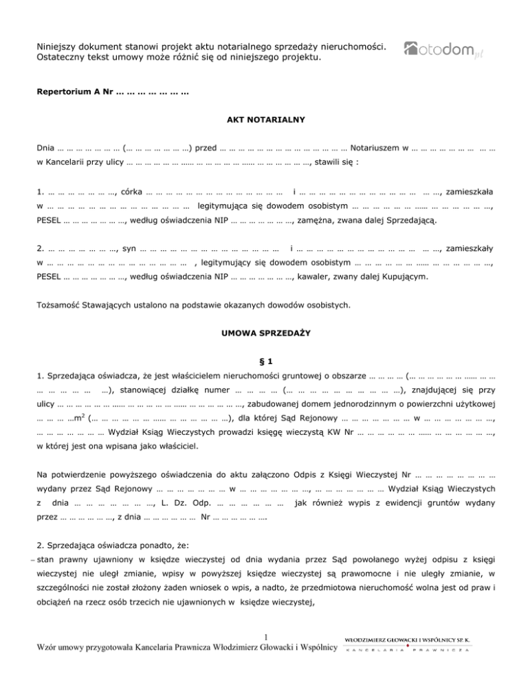 Niniejszy dokument stanowi projekt aktu notarialnego sprzedaży nieruchomości. Ostateczny tekst umowy może różnić się od niniejszego projektu. Repertorium A Nr … … … … … … … AKT NOTARIALNY Dnia … … … … … … … (… … … … … … …) przed … … … … … … … … … … … … … … Notariuszem w … … … … … … … … … w Kancelarii przy ulicy … … … … … … …… … … … … … …… … … … … … …, stawili się : 1. … … … … … … …, córka … … … … … … … … … … … … … … w … … … … … … … … … … … … … … i … … … … … … … … … … … … … …, zamieszkała legitymująca się dowodem osobistym … … … … … … …… … … … … … …, PESEL … … … … … … …, według oświadczenia NIP … … … … … … …, zamężna, zwana dalej Sprzedającą. 2. … … … … … … …, syn … … … … … … … … … … … … … … w … … … … … … … … … … … … … … i … … … … … … … … … … … … … …, zamieszkały , legitymujący się dowodem osobistym … … … … … … …… … … … … … …, PESEL … … … … … … …, według oświadczenia NIP … … … … … … …, kawaler, zwany dalej Kupującym. Tożsamość Stawających ustalono na podstawie okazanych dowodów osobistych. UMOWA SPRZEDAŻY §1 1. Sprzedająca oświadcza, że jest właścicielem nieruchomości gruntowej o obszarze … … … … (… … … … … … …… … … … … … … … …), stanowiącej działkę numer … … … … (… … … … … … … … … …), znajdującej się przy ulicy … … … … … … …… … … … … … …… … … … … … …, zabudowanej domem jednorodzinnym o powierzchni użytkowej … … … …m2 (… … … … … … …… … … … … … …), dla której Sąd Rejonowy … … … … … … … w … … … … … … …, … … … … … … … Wydział Ksiąg Wieczystych prowadzi księgę wieczystą KW Nr … … … … … … …… … … … … … …, w której jest ona wpisana jako właściciel. Na potwierdzenie powyższego oświadczenia do aktu załączono Odpis z Księgi Wieczystej Nr … … … … … … … … wydany przez Sąd Rejonowy … … … … … … … w … … … … … … …, … … … … … … … Wydział Ksiąg Wieczystych z dnia … … … … … … …, L. Dz. Odp. … … … … … … jak również wypis z ewidencji gruntów wydany przez … … … … … …, z dnia … … … … … … Nr … … … … … …. 2. Sprzedająca oświadcza ponadto, że: stan prawny ujawniony w księdze wieczystej od dnia wydania przez Sąd powołanego wyżej odpisu z księgi wieczystej nie uległ zmianie, wpisy w powyższej księdze wieczystej są prawomocne i nie uległy zmianie, w szczególności nie został złożony żaden wniosek o wpis, a nadto, że przedmiotowa nieruchomość wolna jest od praw i obciążeń na rzecz osób trzecich nie ujawnionych w księdze wieczystej, 1 Wzór umowy przygotowała Kancelaria Prawnicza Włodzimierz Głowacki i Wspólnicy Niniejszy dokument stanowi projekt aktu notarialnego sprzedaży nieruchomości. Ostateczny tekst umowy może różnić się od niniejszego projektu. przedmiotowa nieruchomość znajduje się w jej samoistnym posiadaniu, nie była przedmiotem żadnych umów zobowiązujących do zbycia, ani umów, których przedmiotem byłoby zobowiązanie do jej zbycia na rzecz osób trzecich, przedmiotowa nieruchomość nie jest przedmiotem żadnego toczącego się postępowania administracyjnego, sądowego lub arbitrażowego, nie istnieją żadne nie wykonane, choćby nieprawomocne decyzje administracyjne, orzeczenia sądu oraz prywatne roszczenia osób trzecich dotyczące tej nieruchomości oraz, że z przedmiotowej nieruchomości i w stosunku do niej nie jest prowadzona egzekucja, nie zachodzą po jej stronie żadne okoliczności – zaległości lub zobowiązania podatkowe, skutkujące powstaniem na przedmiotowej nieruchomości hipoteki przymusowej, stosownie do art. 34 i następnych ustawy z dnia 29 sierpnia 1997 roku Ordynacja podatkowa, wszelkie opłaty wynikające z eksploatacji przedmiotowej nieruchomości, w tym opłaty za energię elektryczną, ciepłą i zimną wodę są uregulowane na dzień sporządzenia niniejszego aktu, wszystkie osoby, które były zameldowane w przedmiotowej nieruchomości są wymeldowane. 3. Kupujący oświadcza, że zna stan prawny i faktyczny przedmiotowej nieruchomości. §2 Sprzedająca sprzedaje Kupującemu nieruchomość opisaną w § 1 ust. 1 niniejszej umowy wolny od wszelkich praw i obciążeń osób trzecich wraz z prawami związanymi, domem jednorodzinnym, … … … … … … … … … … … … … … … … … … … … … … … … … … … … … … oraz następującym wyposażeniem: … … … … … … … … … … … … … … … … … … … … … … …………………………………………………………………………………………………………………………………… za cenę … … … … … … … … … … … … zł (… … … … … …… … … … … …… … … … … …… … … … … …… … … … … …) a Kupujący za wymienioną cenę nieruchomość tą wraz z prawami związanymi, domem jednorodzinnym, … … … … … … … … … … … … … … … … … … … … … … … … … … … … … … … … … … … … i wyposażeniem kupuje. §3 Strony oświadczają, że opisana w § 2 niniejszej umowy cena płatna jest w następujący sposób: 1. część umówionej ceny w kwocie … … … … … … zł (… … … … … …… … … … … …… … … … … …) została z