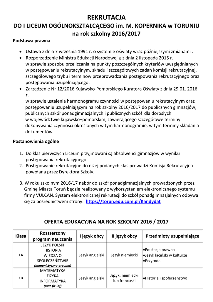 REKRUTACJA DO I LICEUM OGÓLNOKSZTAŁCĄCEGO im. M. KOPERNIKA w TORUNIU na rok szkolny 2016/2017 Podstawa prawna Ustawa z dnia 7 września 1991 r. o systemie oświaty wraz późniejszymi zmianami . Rozporządzenie Ministra Edukacji Narodowej 1) z dnia 2 listopada 2015 r. w sprawie sposobu przeliczania na punkty poszczególnych kryteriów uwzględnianych w postępowaniu rekrutacyjnym, składu i szczegółowych zadań komisji rekrutacyjnej, szczegółowego trybu i terminów przeprowadzania postępowania rekrutacyjnego oraz postępowania uzupełniającego. Zarządzenie Nr 12/2016 Kujawsko-Pomorskiego Kuratora Oświaty z dnia 29.01. 2016 r. w sprawie ustalenia harmonogramu czynności w postępowaniu rekrutacyjnym oraz postępowaniu uzupełniającym na rok szkolny 2016/2017 do publicznych gimnazjów, publicznych szkół ponadgimnazjalnych i publicznych szkół dla dorosłych w województwie kujawsko–pomorskim, zawierającego szczegółowe terminy dokonywania czynności określonych w tym harmonogramie, w tym terminy składania dokumentów. Postanowienia ogólne 1. Do klas pierwszych Liceum przyjmowani są absolwenci gimnazjów w wyniku postępowania rekrutacyjnego. 2. Postępowanie rekrutacyjne do niżej podanych klas prowadzi Komisja Rekrutacyjna powołana przez Dyrektora Szkoły. 3. W roku szkolnym 2016/17 nabór do szkół ponadgimnazjalnych prowadzonych przez Gminę Miasta Toruń będzie realizowany z wykorzystaniem elektronicznego systemu firmy VULCAN. System elektronicznej rekrutacji do szkół ponadgimnazjalnych odbywa się za pośrednictwem strony: https://torun.edu.com.pl/Kandydat OFERTA EDUKACYJNA NA ROK SZKOLNY 2016 / 2017 Klasa 1A Rozszerzony program nauczania JĘZYK POLSKI HISTORIA WIEDZA O SPOŁECZEŃSTWIE I język obcy II język obcy Przedmioty uzupełniające Język angielski Język niemiecki Edukacja prawna Język łaciński w kulturze Przyroda Język angielski Język: niemiecki lub francuski Historia i społeczeństwo (humanistyczno-prawna) 1B MATEMATYKA FIZYKA INFORMATYKA (mat-fiz-inf) GEOGRAFIA JĘZYK ANGIELSKI MATEMATYKA 1C Język angielski Język: niemiecki lub francuski Matematyka w ekonomii Historia i społeczeństwo Język angielski Język niemiecki Historia i społeczeństwo (geograficzno-ekonomiczna) MATEMATYKA FIZYKA JĘZYK ANGIELSKI 1D (mat-fiz-ang) BIOLOGIA CHEMIA 1E Język angielski Język niemiecki Język angielski Język: niemiecki lub francuski Język angielski Język: niemiecki lub francuski (biol-chem) HISTORIA HISTORIA SZTUKI 1F (kulturowo-artystyczna) JĘZYK POLSKI HISTORIA JĘZYK ANGIELSKI 1G (humanistyczno-medialna) Elementy fizyki w biologii i medycynie Język łaciński w medycynie Historia i społeczeństwo Plastyka Elementy kultury współczesnej Przyroda Edukacja medialna Język łaciński w kulturze Przyroda PUNKTACJA O przyjęciu do I LO w Toruniu decyduje suma punktów uzyskana za: 1. wyniki egzaminu gimnazjalnego – max. 100 punktów (1% = 0,2 pkt) 2. Oceny na świadectwie ukończenia gimnazjum ( z języka polskiego oraz trzech wskazanych przez szkołę przedmiotów) - punktacja wg poniższej tabeli – max. 80 punktów. 3. Ukończenie gimnazjum z wyróżnieniem -5 punktów 4. Osiągnięcia wymienione na świadectwie ukończenia gimnazjum Ad. 2. Oceny ze świadectwa przelicza się na punkty w następujący sposób: Ocena Liczba punktów cel 20 bdb 16 db 12 dst 8 dop 2 max 80 Wskazane przez szkołę obowiązkowe zajęcia edukacyjne przeliczane na punkty Kl. 1A Kl. 1B Kl. 1C Kl. 1D j. polski matematyka historia j. obcy j. polski matematyka fizyka j. obcy j. polski matematyka geografia j. obcy j. polski matematyka fizyka j. obcy Kl. 1E j. polski matematyka biologia/chemia j. obcy Kl. 1F Kl. 1G j. polski matematyka zajęcia artystyczne j. obcy j. polski matematyka historia j. obcy Ad. 4. 1. Osiągnięcia w zakresie aktywności społecznej, w tym na rzecz środowiska szkolnego, w szczególności w formie wolontariatu – 2 punkty. 2. uzyskanie wysokiego miejsca nagrodzonego lub uhonorowanego zwycięskim tytułem w zawodach wiedzy, artystycznych i sportowych, organizowanych przez kuratora oświaty albo organizowanych co najmniej na szczeblu powiatowym przez inne podmioty działające na terenie szkoły 1) uzyskanie w zawodach wiedzy będących konkursem o zasięgu ponadwojewódzkim organizowanym przez kuratorów oświaty na podstawie zawartych porozumień: a) tytułu finalisty konkursu przedmiotowego – przyznaje się 10 punktów, b) tytułu laureata konkursu tematycznego lub interdyscyplinarnego – przyznaje się 7 punktów, c) tytułu finalisty konkursu tematycznego lub interdyscyplinarnego – przyznaje się 5 punktów; 2) uzyskanie w zawodach wiedzy będących konkursem o zasięgu międzynarodowym lub ogólnopolskim albo turniejem o zasięgu ogólnopolskim; a) tytułu finalisty konkursu z przedmiotu lub przedmiotów artystycznych objętych ramowym planem nauczania szkoły artystycznej – przyznaje się 10 punktów, b) tytułu laureata turnieju z przedmiotu lub przedmiotów artystycznych nieobjętych ramowym planem nauczania szkoły artystycznej – przyznaje się 4 punkty, c) tytułu finalisty turnieju z przedmiotu lub przedmiotów artystycznych nieobjętych ramowym planem nauczania szkoły artystycznej – przyznaje się 3 punkty; 3) uzyskanie w zawodach wiedzy będących konkursem o zasięgu wojewódzkim organizowanym przez kuratora oświaty: a) dwóch lub więcej tytułów finalisty konkursu przedmiotowego – przyznaje się 10 punktów, b) dwóch lub więcej tytułów laureata konkursu tematycznego lub interdyscyplinarnego – przyznaje się 7 punktów, c) dwóch lub więcej tytułów finalisty konkursu tematycznego lub interdyscyplinarnego – przyznaje się 5 punktów, d) tytułu finalisty konkursu przedmiotowego – przyznaje się 7 punktów, e) tytułu laureata konkursu tematycznego lub interdyscyplinarnego – przyznaje się 5 punktów, f) tytułu finalisty konkursu tematycznego lub interdyscyplinarnego – przyznaje się 3 punkty;