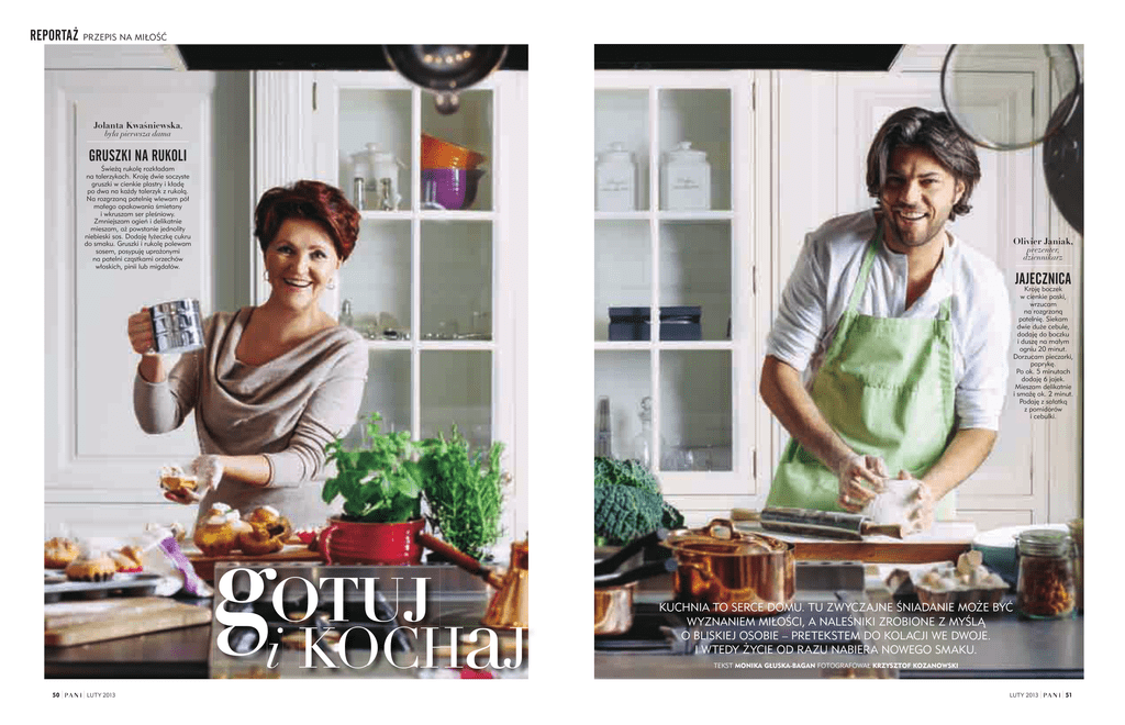 REPORTAŻ PRZEPIS NA MIŁOŚĆ Jolanta Kwaśniewska, była pierwsza dama GRUSZKI NA RUKOLI Świeżą rukolę rozkładam na talerzykach. Kroję dwie soczyste gruszki w cienkie plastry i kładę po dwa na każdy talerzyk z rukolą. Na rozgrzaną patelnię wlewam pół małego opakowania śmietany i wkruszam ser pleśniowy. Zmniejszam ogień i delikatnie mieszam, aż powstanie jednolity niebieski sos. Dodaję łyżeczkę cukru do smaku. Gruszki i rukolę polewam sosem, posypuję uprażonymi na patelni cząstkami orzechów włoskich, pinii lub migdałów. Olivier Janiak, prezenter, dziennikarz JAJECZNICA Kroję boczek w cienkie paski, wrzucam na rozgrzaną patelnię. Siekam dwie duże cebule, dodaję do boczku i duszę na małym ogniu 20 minut. Dorzucam pieczarki, paprykę. Po ok. 5 minutach dodaję 6 jajek. Mieszam delikatnie i smażę ok. 2 minut. Podaję z sałatką z pomidorów i cebulki. 50 | | LUTY 2013 giOTUJ KOCHaJ KUCHNIA TO SERCE DOMU. TU ZWYCZAJNE ŚNIADANIE MOŻE BYĆ WYZNANIEM MIŁOŚCI, A NALEŚNIKI ZROBIONE Z MYŚLĄ O BLISKIEJ OSOBIE – PRETEKSTEM DO KOLACJI WE DWOJE. I WTEDY ŻYCIE OD RAZU NABIERA NOWEGO SMAKU. TEKST MONIKA GŁUSKA-BAGAN FOTOGRAFOWAŁ KRZYSZTOF KOZANOWSKI LUTY 2013 | | 51 REPORTAŻ PRZEPIS NA MIŁOŚĆ diach. Pamiętam, że gdy byłam w ciąży, piekł dla mnie keks. Ja wolałam wtedy śledzie, ale jadłam ciasto, żeby nie sprawiać mu przykrości. Mimo że pierwsze mieszkanie Kwaśniewskich na Ursynowie było malutkie, często i chętnie przyjmowali w nim gości. – Zwykle we wrześniu, kiedy wracaliśmy z urlopu w górach, mąż kupował u naszej gaździny udziec barani – wspomina Jolanta Kwaśniewska. – Peklował mięso przez kilka dni, a potem piekł, do tego robił świetny orzechowy sos według gruzińskiego przepisu. Jej domową biblią była „Kuchnia polska”. Często przygotowywała dla męża nowe dania. Lubiła eksperymentować, a nie było to proste w czasach, gdy wielu produktów podanych w przepisach brakowało w sklepach. Kwaśniewska szykowała więc dostępne wtedy kalmary, importowane ze Związku Radzieckiego, krówki z zagęszczonego mleka oraz ciasteczka szyszki z płatków owsianych. Beata Janson, właścicielka firmy odzieżowej, żona i menedżerka Roberta Jansona CHIŃSKI EKSPRES Zawartość dwóch torebek ryżu basmati (lub jaśminowego) wrzucam na patelnię z rozgrzanym olejem. Smażę 5 minut, aż nabierze złocistego koloru. Wsypuję łyżkę curry i dolewam zagotowaną wodę – ok. 1,5 cm nad poziom ryżu. Zmniejszam ogień i zostawiam ryż pod przykrywką do czasu, gdy wchłonie wodę. W innym rondelku smażę pokrojone w małe paski mięso i dodaję do smaku sos sojowy. Usmażone mięso przekładam do miski. Na patelnię wrzucam paprykę, cebulę, pokrojonego pora, a na koniec cienkie nitki marchwi i pietruszki. Doprawiam curry, słodkim sosem teriyaki, dosładzam cukrem lub ksylitolem. Dodaję do mięsa. Smażę dwa jajka, mieszam tak, aby powstały wiórki. Potem wszystko ze sobą łączę i podaję gorące danie. k iedy Olivier Janiak poznał Karolinę Malinowską, modelkę, swoją obecną żonę, bardzo chciał na niej zrobić wrażenie. Zaprosił ją więc na domową kolację. – Wymyśliłem, że przygotuję carbonarę – opowiada dziennikarz TVN i redaktor naczelny magazynu „MaleMen”. – Za ostatnie pieniądze kupiłem mnóstwo drogich włoskich serów: parmezan, pecorino, grana padano. Chciałem dobrze, wyszło fatalnie. To był chyba najgorszy sos, jaki w życiu zrobiłem. Cenię Karolinę za szczerość, bo nie próbowała nawet tego zjeść. Powiedziała wprost, że danie mi nie wyszło, czym zyskała w moich oczach. Dziś trochę się podszkoliłem. Może nie jestem mistrzem, ale daję sobie radę w kuchni. 52 | | LUTY 2013 pułku wojska, lecz zakochany człowiek chce pokazać się od najlepszej strony, podkreślić, że umie zadbać o tę drugą połówkę, że mu zależy. Podobnie uważa Beata Janson, właścicielka firmy odzieżowej Betti Janson, żona i menedżerka kompozytora Roberta Jansona. Kiedy kilkanaście lat temu spotkali się na imprezie muzycznej w Łodzi, on, lider zespołu Varius Manx, był u szczytu sławy. Na ich pierwszy wspólny obiad przygotowała pyzy ziemniaczane z mięsem, sos oraz kapustę po śląsku. Robert był pod wrażeniem, sprawiła mu tym ogromną przyjemność. Wcześniej prowadził kawalerskie życie – kupował kurczaki z rożna i gotował tylko ryż w woreczkach. Beata przyznaje, że gdy Michał Olszański, dziennikarz RUSKIE NALEŚNIKI Najpierw gotuję pięć, sześć ziemniaków. Na patelni podsmażam drobno pokrojony boczek. Wrzucam dwie duże posiekane cebule i smażę je na złoty kolor. Przeciśnięte przez praskę i ostudzone ziemniaki łączę z cebulą i białym twarogiem. Dodaję pojemnik bryndzy z kminkiem (można ją kupić np. w Krakowskim Kredensie), kilka kropli tabasco, sól, pieprz i całość mieszam, by uzyskać jednolitą masę. Smażę lekkie naleśniki. Smaruję je nadzieniem i zawijam w ruloniki. Układam naleśniki na blasze i wkładam na pół godziny do nagrzanego do 180 st. C piekarnika. Mają być przyrumienione. Przed podaniem polewam je śmietaną i skrapiam sosem sojowym. w Niedawno, robiąc w Łodzi porządki w piwnicy mieszkania po babci, znalazł słój ogórków zrobionych jeszcze przez nią. – Umarła w wieku 94 lat, do końca życia świetnie gotowała. Gdy otworzyłem ten słoik, poczułem, że babcia jest blisko mnie. Nawet kunszt kucharza z najlepszej restauracji nie odda tego, co niosą w sobie potrawy robione z miłością dla najbliższych. Niegdyś w domach naszych babć wisiały makatki ze starannie wyhaftowanymi bon motami o kuchni i prowadzeniu domu, np. „Kiedy żona gotuje, to mężowi smakuje”. – Mówi się, że droga do serca mężczyzny wiedzie przez żołądek. W dzisiejszych czasach to przysłowie jest nieaktualne, bo oni równie dobrze gotują – śmieje się prezydentowa Jolanta Kwaśniewska. – M