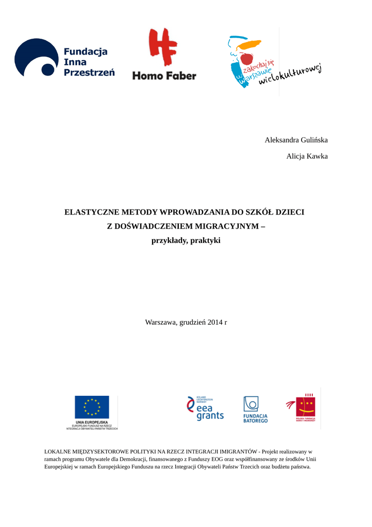 Aleksandra Gulińska Alicja Kawka ELASTYCZNE METODY WPROWADZANIA DO SZKÓŁ DZIECI Z DOŚWIADCZENIEM MIGRACYJNYM – przykłady, praktyki Warszawa, grudzień 2014 r LOKALNE MIĘDZYSEKTOROWE POLITYKI NA RZECZ INTEGRACJI IMIGRANTÓW - Projekt realizowany w ramach programu Obywatele dla Demokracji, finansowanego z Funduszy EOG oraz współfinansowany ze środków Unii Europejskiej w ramach Europejskiego Funduszu na rzecz Integracji Obywateli Państw Trzecich oraz budżetu państwa. Charakterystyka migracji do Polski Imigracja do Polski jest zjawiskiem nie tylko marginalnym, ale również nowym. Znaczący wzrost cudzoziemców przyjeżdżających i osiedlających się w Polsce przypada na lata 90., a przede wszystkim – dwie dekady XXI wieku. Niezależnie jednak od wzrostu liczby migrantów w ostatnich dwudziestu latach – nadal nie jesteśmy atrakcyjnym krajem jako kierunek migracji. Zasób imigrantów jest bardzo mały w porównaniu z całkowitą liczbą mieszkańców naszego kraju: stanowi on około 0,1 % ludności Polski. W całej Unii Europejskiej odsetek ten jest niższy tylko w Rumuniii. Bliskość geograficzna pomiędzy krajem wysyłającym a docelowym, która niejednokrotnie wiąże się także z bliskością kulturową, wydaje się kluczową cechą współczesnych migracji do Polski. Do naszego kraju przybywają przede wszystkim obywatele państw byłego ZSRR oraz innych krajów europejskich, a znaczny odsetek pochodzi z państw bezpośrednio sąsiadujących z Polską. I tak 1/3 wszystkich cudzoziemców posiadających zezwolenie na pobyt w RP stanowią obywatele Ukrainy (ok. 38 tys.). Kolejne obywatelstwa według liczebności to: Wietnam (13 tys.), Rosja (12,5 tys.), Białoruś (11 tys.), Chiny (5 tys.), Armenia (4,5 tys.)ii. Obecność Wietnamczyków w naszym kraju zaprzecza co prawda wskazanej powyżej regule o napływie do Polski przede wszystkim cudzoziemców z państw nieodległych geograficznie i kulturowo, jednak początki napływu obywateli Wietnamu wiążą się z wymianą studencką pomiędzy komunistyczną Polską i komunistycznym Wietnamem, której nasilenie przypadło na lata 70. i była zainicjowana z powodów politycznych. Uchodźcy mieszkający w Polsce (albo cudzoziemcy mający inną formę ochrony lub będący w procedurze o nadanie statusu uchodźcy) są przede wszystkim obywatelami Federacji Rosyjskiej (przede wszystkim trzech republik: Czeczenii, Inguszetii i Dagestanu), Gruzji i od 2014 roku – Ukrainyiii . Średnia liczba składanych wniosków o nadanie statusu uchodźcy w skali roku nie jest wartością wiele nam mówiącą - przez kilka lat było to 3 – 4 tysiące, aby w latach 2013-2014 wzrosnąć do kilkunastu w ciągu roku. Jednak w ośrodkach dla uchodźców mieszkają także ludzie czekający na decyzję od kilku lat lub po readmisji z krajów zachodniej Europy. Istotniejsze się wydaje geograficzne rozmieszczenie tej grupy cudzoziemców – w zasadzie cudzoziemcy czekający na decyzję lub z przyznaną ochroną koncentrują się w kilku gminach – tam gdzie usytuowane są ośrodki, oraz w Warszawie i okolicznych miejscowościach (ze względu na szerszy dostęp do rynku pracy). Jednak obecność uchodźców, zazwyczaj kilkuset osób mówiących innym językiem i czasem inaczej wyglądających, szczególnie w małych wiejskich gminach, jest, w odbiorze lokalnych społeczności, zauważalna. Każda z grup etnicznych preferuje nieco inny model strategii migracyjnej – w przypadku osób z Afryki i krajów Bliskiego Wschodu (ponad 80%) znacząca większość migrujących to samotni mężczyźni, w przypadku Ukraińców – będą to kobiety (najczęściej zostawiające rodzinę w kraju pochodzenia), natomiast jeśli chodzi o Czeczenów starających się o status uchodźcy – będą to przede wszystkim małżeństwa z kilkorgiem dzieci. Charakterystyczna dla każdej z tych grup sytuacja rodzinna oraz ich rozmieszczenie na terenie kraju daje nam sytuację, w której większość szkół nie doświadcza i nie zna problemu dzieci z doświadczeniem migracyjnym, a w kilkunastu placówkach (w miejscach koncentracji migrantów – w pobliżu ośrodków dla uchodźców oraz miejsc zamieszkania dużych grup Wietnamczyków) odsetek takich dzieci sięga nawet 50%iv. Spotkania z przedstawicielkami szkół Na podstawie danych z Systemu Informacji Oświatowej na początku roku szkolnego 2013/14 do polskich szkół uczęszczało 8174 dzieci cudzoziemskich. Jednak aby wyszukać jakkolwiek innowacyjne metody wprowadzania i integrowania dzieci migrantów zwróciłyśmy się do placówek położonych w bezpośrednim sąsiedztwie ośrodków dla uchodźców – jako szkół, które mierzą się z tym wyzwaniem na dużą skalę i nie tylko incydentalnie, ale stale i często od wielu lat. Szkoła Podstawowa nr 31 im. Lotników Polskich w Lublinie przyjmuje dzieci cudzoziemców od połowy lat 90. – to znaczy od momentu otwarcia przy sąsiedniej ulicy ośrodka dla uchodźców. W szkole są 24 klasy, jest 28 uczniów i uczennic cudzoziemskich. Szkoła dba by były równomiernie rozmieszczone w różnych oddziałach. W zakresie integrowania dzieci polskich i migranckich szkołę wspomaga m.in. Stowarzyszenie „Dla Ziemi” oraz Centrum Wolontariatu. Od września 2014 r. w szkole pracuje Czeczenka w charakterze pomocy nauczyciela, wcześniej przez dwa lata Stowarzyszenie „Dla Ziemi” zatrudniało cudzoziemkę jako tzw. asystentkę międzykulturową pracującą na terenie szkoły. Do Szkoły Podstawowej nr 58 im. Tadeusza Gajcego w Warszawie dzieci cudzoziemskie uczęszczają od roku szkolnego 2011/12, czyli od początku funkcjonowania ośrodka dla uchodźców na Targówku. Na 113 dzieci w szkole 38 to cudzoziemcy. Od początku ze szkołą współpracuje Stowarzyszenie Vox Humana, Stowarzyszenie Interwencji Prawnej oraz Fundacja na rzecz Różnorodności Społecznej. Szkoła uczestniczy też w działaniach przygotowywanych w ramach konsorcjum kilkunastu podmiotów „My, Ta