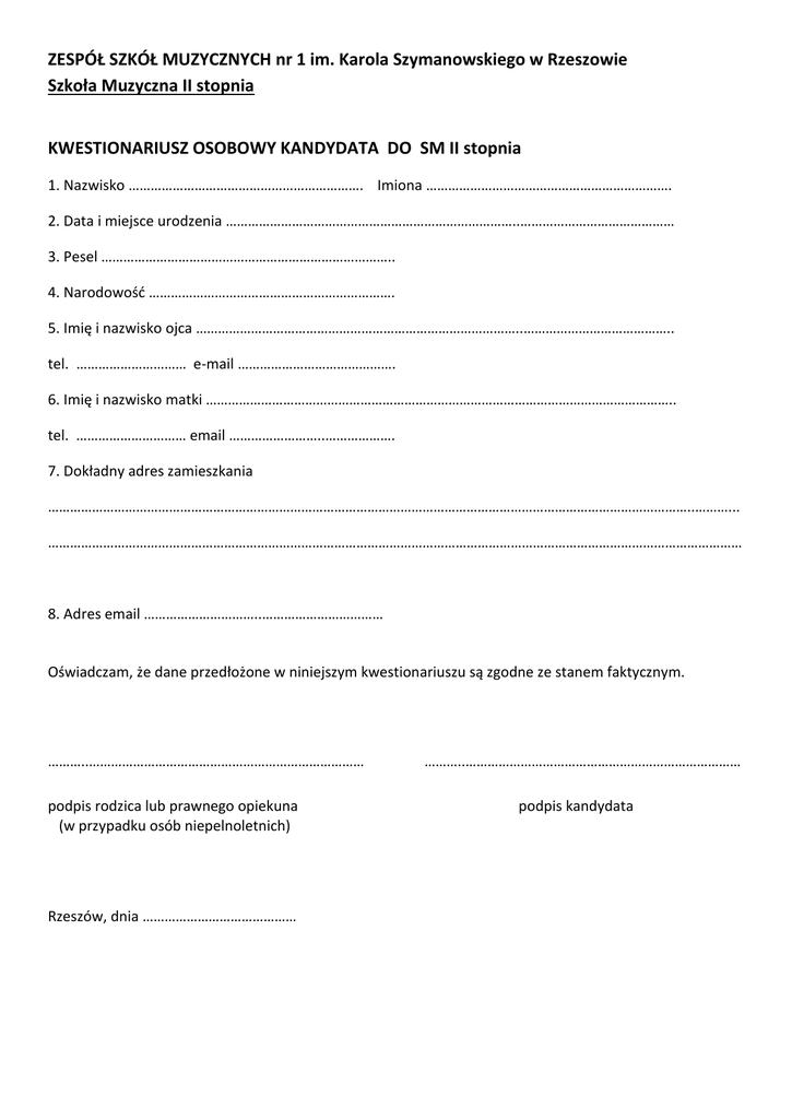 ZESPÓŁ SZKÓŁ MUZYCZNYCH nr 1 im. Karola Szymanowskiego w Rzeszowie Szkoła Muzyczna II stopnia KWESTIONARIUSZ OSOBOWY KANDYDATA DO SM II stopnia 1. Nazwisko ………………………………………………………. Imiona …………………………………………………………. 2. Data i miejsce urodzenia ……………………………………………………………………..…………………………………… 3. Pesel …………………………………………………………………….. 4. Narodowość …………………………………………………………. 5. Imię i nazwisko ojca ……………………………………………………………………………..………………………………….. tel. ………………………… e-mail ……………………………………. 6. Imię i nazwisko matki ……………………………………………………………………………………………………………….. tel. ………………………… email ……………………..………………. 7. Dokładny adres zamieszkania …………………………………………………………………………………………………………………………………………………………..………... ……………………………………………………………………………………………………………………………………………………………………… 8. Adres email …………………………..…………………………… Oświadczam, że dane przedłożone w niniejszym kwestionariuszu są zgodne ze stanem faktycznym. ………..………………………………………………………………… podpis rodzica lub prawnego opiekuna (w przypadku osób niepelnoletnich) Rzeszów, dnia …………………………………… ………..………………………………………………………………… podpis kandydata PODANIE (SM II st.) Proszę o przyjęcie mnie ………………………………………………………………………………………………............... (imię i nazwisko) do klasy ……………. Państwowej szkoły Muzycznej II stopnia ZSM nr 1 w Rzeszowie. SPECJALNOŚĆ (odpowiednie podkreśl): instrumentalistyka SPECJALIZACJA: wokalistyka rytmika ……………………………………………………………………………………………. (instrument) INFORMACJA O DOTYCHCZASOWYM PRZEBIEGU KSZTAŁCENIA MUZYCZNEGO: ……………………………………………………………………………………………………………………………………………………………………… ……………………………………………………………………………………………………………………………………………………………………… Wyrażam zgodę na przetwarzanie danych osobowych zawartych w niniejszym podaniu oraz na publikację imienia i nazwiska oraz wizerunku mojego dziecka na stronach i portalach internetowych w zakresie informacji o osiągnięciach ucznia podczas nauki w szkole. Przetwarzanie danych odbywa się zgodnie z Ustawą o Systemie Oświaty (Dz. U. z roku 2004 nr 256, poz. 2572 z późn. zmianami), Rozporządzeniem MKiDN z dnia 24 sierpnia 2011 (Dz. U. z 2011 r. nr 187, poz.1118) i Ustawą o Ochronie Danych Osobowych z dnia 29 sierpnia 1997 (Dz. U. nr 133 poz. 883). ………..………………………………………………………………… podpis rodzica lub prawnego opiekuna ………..………………………………………………………………… podpis kandydata Do kwestionariusza należy dołączyć: 1 zdjęcie legitymacyjne oraz zaświadczenie lekarskie o braku przeciwskazań do podjęcia nauki na określonej specjalizacji: na instrumenty dęte – od pulmonologa, na rytmikę – od ortopedy i foniatry/laryngologa, na wokalistykę – od foniatry i audiologa. Zaświadczenie o uczęszczaniu do szkoły ogólnej (uczelni). Można dołączyć dyplomy potwierdzające dotychczasowe osiągnięcia muzyczne. Szczegóły na stronie szkoły: www.szkolamuzyczna.rzeszow.pl