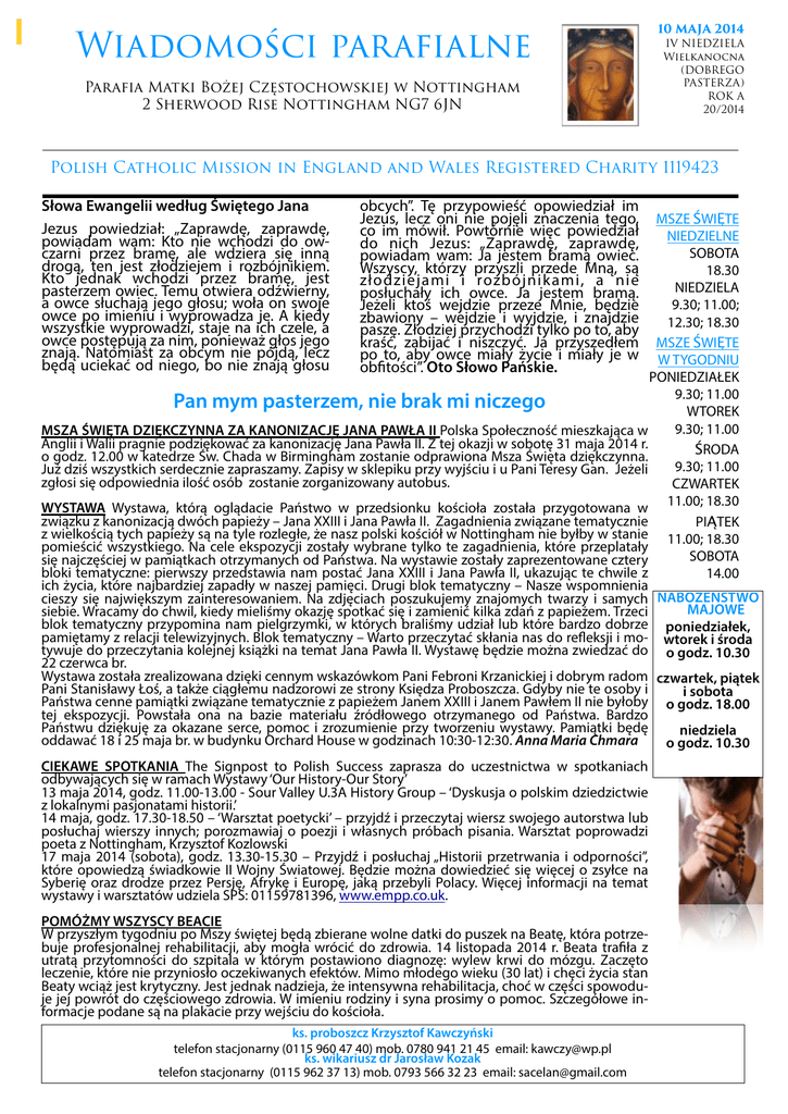 Wiadomości parafialne Parafia Matki Bożej Częstochowskiej w Nottingham 2 Sherwood Rise Nottingham NG7 6JN 10 MAJA 2014 ! IV NIEDZIELA Wielkanocna (DOBREGO PASTERZA) ROK A 20/2014 Polish Catholic Mission in England and Wales Registered Charity 1119423 Słowa Ewangelii według Świętego Jana Jezus powiedział: „Zaprawdę, zaprawdę, powiadam wam: Kto nie wchodzi do owczarni przez bramę, ale wdziera się inną drogą, ten jest złodziejem i rozbójnikiem. Kto jednak wchodzi przez bramę, jest pasterzem owiec. Temu otwiera odźwierny, a owce słuchają jego głosu; woła on swoje owce po imieniu i wyprowadza je. A kiedy wszystkie wyprowadzi, staje na ich czele, a owce postępują za nim, ponieważ głos jego znają. Natomiast za obcym nie pójdą, lecz będą uciekać od niego, bo nie znają głosu obcych”. Tę przypowieść opowiedział im Jezus, lecz oni nie pojęli znaczenia tego, co im mówił. Powtórnie więc powiedział do nich Jezus: „Zaprawdę, zaprawdę, powiadam wam: Ja jestem bramą owiec. Wszyscy, którzy przyszli przede Mną, są złodziejami i rozbójnik ami, a nie posłuchały ich owce. Ja jestem bramą. Jeżeli ktoś wejdzie przeze Mnie, będzie zbawiony – wejdzie i wyjdzie, i znajdzie paszę. Złodziej przychodzi tylko po to, aby kraść, zabijać i niszczyć. Ja przyszedłem po to, aby owce miały życie i miały je w obfitości”. Oto Słowo Pańskie. MSZE ŚWIĘTE NIEDZIELNE SOBOTA 18.30 NIEDZIELA 9.30; 11.00; 12.30; 18.30 MSZE ŚWIĘTE W TYGODNIU PONIEDZIAŁEK 9.30; 11.00 Pan mym pasterzem, nie brak mi niczego WTOREK 9.30; 11.00 MSZA ŚWIĘTA DZIĘKCZYNNA ZA KANONIZACJĘ JANA PAWŁA II Polska Społeczność mieszkająca w Anglii i Walii pragnie podziękować za kanonizację Jana Pawła II. Z tej okazji w sobotę 31 maja 2014 r. ŚRODA o godz. 12.00 w katedrze Św. Chada w Birmingham zostanie odprawiona Msza Święta dziękczynna. 9.30; 11.00 Już dziś wszystkich serdecznie zapraszamy. Zapisy w sklepiku przy wyjściu i u Pani Teresy Gan. Jeżeli zgłosi się odpowiednia ilość osób zostanie zorganizowany autobus. CZWARTEK WYSTAWA Wystawa, którą oglądacie Państwo w przedsionku kościoła została przygotowana w 11.00; 18.30 związku z kanonizacją dwóch papieży – Jana XXIII i Jana Pawła II. Zagadnienia związane tematycznie PIĄTEK z wielkością tych papieży są na tyle rozległe, że nasz polski kościół w Nottingham nie byłby w stanie 11.00; 18.30 pomieścić wszystkiego. Na cele ekspozycji zostały wybrane tylko te zagadnienia, które przeplatały SOBOTA się najczęściej w pamiątkach otrzymanych od Państwa. Na wystawie zostały zaprezentowane cztery bloki tematyczne: pierwszy przedstawia nam postać Jana XXIII i Jana Pawła II, ukazując te chwile z 14.00 ich życia, które najbardziej zapadły w naszej pamięci. Drugi blok tematyczny – Nasze wspomnienia cieszy się największym zainteresowaniem. Na zdjęciach poszukujemy znajomych twarzy i samych NABOŻEŃSTWO MAJOWE siebie. Wracamy do chwil, kiedy mieliśmy okazję spotkać się i zamienić kilka zdań z papieżem. Trzeci blok tematyczny przypomina nam pielgrzymki, w których braliśmy udział lub które bardzo dobrze poniedziałek, pamiętamy z relacji telewizyjnych. Blok tematyczny – Warto przeczytać skłania nas do refleksji i mo- wtorek i środa tywuje do przeczytania kolejnej książki na temat Jana Pawła II. Wystawę będzie można zwiedzać do o godz. 10.30 22 czerwca br. Wystawa została zrealizowana dzięki cennym wskazówkom Pani Febroni Krzanickiej i dobrym radom czwartek, piątek Pani Stanisławy Łoś, a także ciągłemu nadzorowi ze strony Księdza Proboszcza. Gdyby nie te osoby i i sobota Państwa cenne pamiątki związane tematycznie z papieżem Janem XXIII i Janem Pawłem II nie byłoby o godz. 18.00 tej ekspozycji. Powstała ona na bazie materiału źródłowego otrzymanego od Państwa. Bardzo Państwu dziękuję za okazane serce, pomoc i zrozumienie przy tworzeniu wystawy. Pamiątki będę niedziela oddawać 18 i 25 maja br. w budynku Orchard House w godzinach 10:30-12:30. Anna Maria Chmara o godz. 10.30 ! ! ! !CIEKAWE SPOTKANIA The Signpost to Polish Success zaprasza do uczestnictwa w spotkaniach odbywających się w ramach Wystawy ‘Our History-Our Story’ 13 maja 2014, godz. 11.00-13.00 - Sour Valley U.3A History Group – ‘Dyskusja o polskim dziedzictwie z lokalnymi pasjonatami historii.’ 14 maja, godz. 17.30-18.50 – ‘Warsztat poetycki’ – przyjdź i przeczytaj wiersz swojego autorstwa lub posłuchaj wierszy innych; porozmawiaj o poezji i własnych próbach pisania. Warsztat poprowadzi poeta z Nottingham, Krzysztof Kozlowski 17 maja 2014 (sobota), godz. 13.30-15.30 – Przyjdź i posłuchaj „Historii przetrwania i odporności”, które opowiedzą świadkowie II Wojny Światowej. Będzie można dowiedzieć się więcej o zsyłce na Syberię oraz drodze przez Persję, Afrykę i Europę, jaką przebyli Polacy. Więcej informacji na temat wystawy i warsztatów udziela SPS: 01159781396, www.empp.co.uk. !POMÓŻMY WSZYSCY BEACIE W przyszłym tygodniu po Mszy świętej będą zbierane wolne datki do puszek na Beatę, która potrzebuje profesjonalnej rehabilitacji, aby mogła wrócić do zdrowia. 14 listopada 2014 r. Beata trafiła z utratą przytomności do szpitala w którym postawiono diagnozę: wylew krwi do mózgu. Zaczęto leczenie, które nie przyniosło oczekiwanych efektów. Mimo młodego wieku (30 lat) i chęci życia stan Beaty wciąż jest krytyczny. Jest jednak nadzieja, że intensywna rehabilitacja, choć w części spowoduje jej powrót do częściowego zdrowia. W imieniu rodziny i syna prosimy o pomoc. Szczegółowe informacje podane są na plakacie przy wejściu do kościoła. ! ! ks. proboszcz Krzysztof Kawczyński telefon stacjonarny (0115 960 47 40) mob. 0780 941 21 45 email: [email protected] ks. wikariusz dr Jarosław Kozak telefon stacjonarny (0115 962 37 13) mob. 0793 566 32 23 email: [email protected] ! ! KANCELARIA INTE