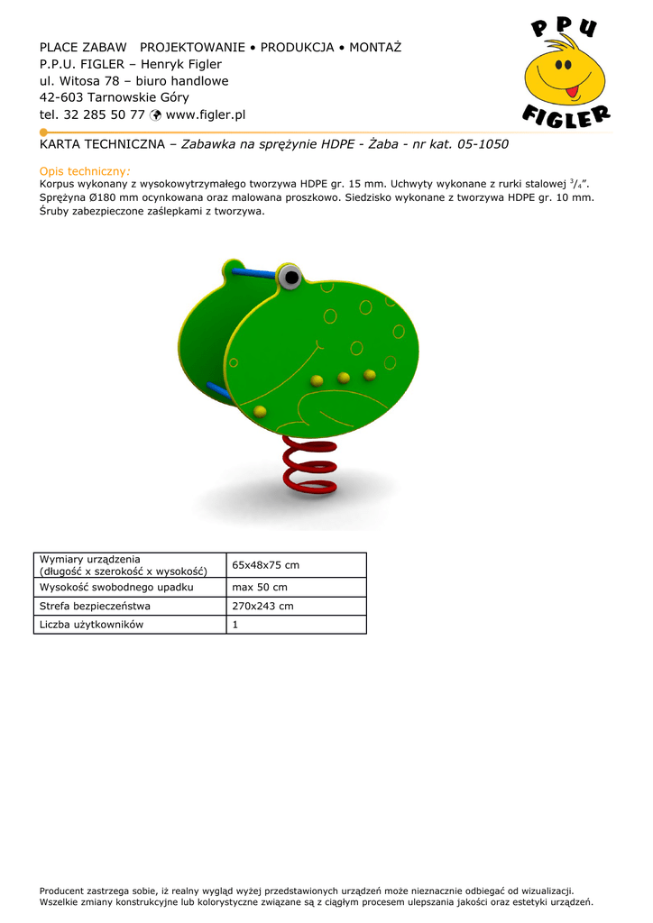 PLACE ZABAW PROJEKTOWANIE • PRODUKCJA • MONTAŻ P.P.U. FIGLER – Henryk Figler ul. Witosa 78 – biuro handlowe 42-603 Tarnowskie Góry tel. 32 285 50 77 www.figler.pl KARTA TECHNICZNA – Zabawka na sprężynie HDPE - Żaba - nr kat. 05-1050 Opis techniczny: Korpus wykonany z wysokowytrzymałego tworzywa HDPE gr. 15 mm. Uchwyty wykonane z rurki stalowej 3/4”. Sprężyna Ø180 mm ocynkowana oraz malowana proszkowo. Siedzisko wykonane z tworzywa HDPE gr. 10 mm. Śruby zabezpieczone zaślepkami z tworzywa. Wymiary urządzenia (długość x szerokość x wysokość) 65x48x75 cm Wysokość swobodnego upadku max 50 cm Strefa bezpieczeństwa 270x243 cm Liczba użytkowników 1 Producent zastrzega sobie, iż realny wygląd wyżej przedstawionych urządzeń może nieznacznie odbiegać od wizualizacji. Wszelkie zmiany konstrukcyjne lub kolorystyczne związane są z ciągłym procesem ulepszania jakości oraz estetyki urządzeń.