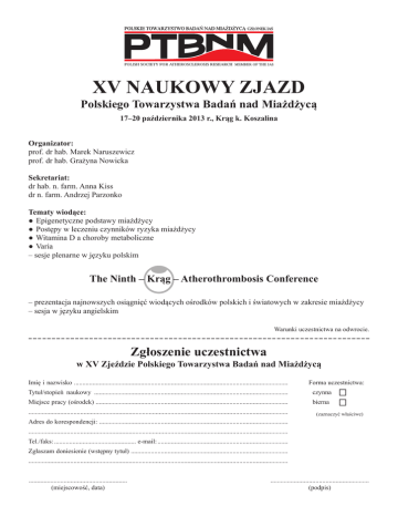 XV NAUKOWY ZJAZD Polskiego Towarzystwa Badań nad Miażdżycą 17–20 października 2013 r., Krąg k. Koszalina Organizator: prof. dr hab. Marek Naruszewicz prof. dr hab. Grażyna Nowicka Sekretariat: dr hab. n. farm. Anna Kiss dr n. farm. Andrzej Parzonko Tematy wiodące: ● Epigenetyczne podstawy miażdżycy ● Postępy w leczeniu czynników ryzyka miażdżycy ● Witamina D a choroby metaboliczne ● Varia – sesje plenarne w języku polskim The Ninth – Krąg – Atherothrombosis Conference – prezentacja najnowszych osiągnięć wiodących ośrodków polskich i światowych w zakresie miażdżycy – sesja w języku angielskim Warunki uczestnictwa na odwrocie. Zgłoszenie uczestnictwa w XV Zjeździe Polskiego Towarzystwa Badań nad Miażdżycą Imię i nazwisko ................................................................................................................................ Forma uczestnictwa: Tytuł/stopień naukowy .................................................................................................................... czynna Miejsce pracy (ośrodek) ................................................................................................................... bierna ........................................................................................................................................................... (zaznaczyć właściwe) Adres do korespondencji: ................................................................................................................. ........................................................................................................................................................... Tel./faks: ................................................. e-mail: .............................................................................. Zgłaszam doniesienie (wstępny tytuł) .............................................................................................. ........................................................................................................................................................... ........................................................... (miejscowość, data) ........................................................... (podpis) Warunki uczestnictwa w Zjeździe Zgłoszenia prosimy przesyłać do 30 czerwca 2013 r. na adres: dr n. farm. Andrzej Parzonko Katedra Farmakognozji i Molekularnych Podstaw Fitoterapii ul. Banacha 1, 02-097 Warszawa Sekretariat Zjazdu: tel.: (22) 57 20 986, tel./faks: (22) 57 20 985 e-mail: [email protected] Rejestracja elektroniczna: www.ptbnm.pl Streszczenia nieprzekraczające 250 słów prosimy przesyłać na: e-mail: [email protected] Przyjmowanie streszczeń do 30 czerwca 2013 r. Powinny one zawierać następujące informacje: – tytuł pracy, – nazwiska autorów (z podkreśleniem nazwiska i imienia osoby prezentującej pracę), – nazwę i adres ośrodka naukowego (także telefon i adres e-mailowy), – główny tekst (cel pracy, krótka metodyka badań, wyniki i wnioski). Opłaty za uczestnictwo prosimy przesyłać do 30 września 2013 r. Numer konta, na który należy przesyłać opłaty za uczestnictwo w zjeździe: Polskie Towarzystwo Badań nad Miażdżycą PKO BP II O/Szczecin 94 1020 4795 0000 9602 0080 1381 – dla członków PTBnM (opłacona składka członkowska za rok 2013) – 700,00 zł – dla pozostałych uczestników – 750,00 zł Opłata za uczestnictwo zawiera koszt pobytu 1 osoby: 3 x nocleg w pokoju dwuosobowym, śniadanie, obiad, kolacja. Zakwaterowanie wyłącznie w hotelu Podewils w Krągu – liczba miejsc ograniczona, nie przewidujemy w związku z tym obecności osób towarzyszących. Przypominamy członkom PTBnM, że podczas zjazdu odbędzie się Walne Zebranie Wyborcze. Katedra Farmakognozji i Molekularnych Podstaw Fitoterapii WUM Polskie Towarzystwo Badań nad Miażdżycą ul. Banacha 1 02-097 Warszawa