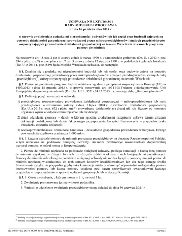UCHWAŁA NR LXIV/1643/14 RADY MIEJSKIEJ WROCŁAWIA z dnia 16 października 2014 r. w sprawie zwolnienia z podatku od nieruchomości budynków lub ich części oraz budowli zajętych na potrzeby działalności gospodarczej prowadzonej przez mikroprzedsiębiorców i małych przedsiębiorców rozpoczynających prowadzenie działalności gospodarczej na terenie Wrocławia w ramach programu pomocy de minimis Na podstawie art. 18 ust. 2 pkt 8 ustawy z dnia 8 marca 1990 r. o samorządzie gminnym (Dz. U. z 2013 r. poz. 594 z późn. zm.1)) w związku z art. 7 ust. 3 ustawy z dnia 12 stycznia 1991 r. o podatkach i opłatach lokalnych (Dz. U. z 2014 r. poz. 849) Rada Miejska Wrocławia uchwala, co następuje: § 1. Zwalnia się z podatku od nieruchomości budynki lub ich części oraz budowle zajęte na potrzeby działalności gospodarczej prowadzonej przez mikroprzedsiębiorców i małych przedsiębiorców, zwanych dalej „przedsiębiorcą”, którzy rozpoczynają prowadzenie działalności gospodarczej na terenie Wrocławia. § 2. Pomoc na podstawie programu będzie udzielana zgodnie z przepisami rozporządzenia Komisji (UE) nr 1407/2013 z dnia 18 grudnia 2013 r. w sprawie stosowania art. 107 i 108 Traktatu o funkcjonowaniu Unii Europejskiej do pomocy de minimis (Dz. Urz. UE L 352 z 24.12.2013 r.), zwanego dalej „Rozporządzeniem”. § 3. Definicje pojęć zawartych w uchwale: 1) przedsiębiorca rozpoczynający prowadzenie działalności gospodarczej – mikroprzedsiębiorca lub mały przedsiębiorca w rozumieniu ustawy z dnia 2 lipca 2004 r. o swobodzie działalności gospodarczej (Dz. U. z 2013 r. poz. 672 z późn. zm.2)) prowadzący działalność nie dłużej niż rok liczony od momentu uzyskania wpisu w odpowiednim rejestrze lub ewidencji; 2) dzień udzielenia pomocy – dzień, w którym zgodnie z odrębnymi przepisami upływa termin złożenia deklaracji podatkowej lub dzień faktycznego przysporzenia korzyści finansowych w przypadku braku obowiązku złożenia deklaracji; 3) wielkopowierzchniowa działalność handlowa - działalność gospodarcza prowadzona w budynku, którego powierzchnia użytkowa przekracza 1 000 mkw. § 4. 1. Łączna wartość pomocy de minimis przyznana przedsiębiorcy na obszarze Rzeczypospolitej Polskiej, w tym udzielona na podstawie niniejszej uchwały, nie może przekroczyć równowartości dopuszczalnej wartości pomocy, o której mowa w Rozporządzeniu. 2. Pomoc de minimis udzielana na podstawie niniejszej uchwały, podlega kumulacji z każdą inną pomocą de minimis uzyskaną w różnych formach i z różnych źródeł w okresie trzech kolejnych lat podatkowych. Pomocy de minimis udzielonej na podstawie niniejszej uchwały nie można łączyć z pomocą inną niż pomoc de minimis uzyskaną w odniesieniu do tych samych kosztów kwalifikowalnych lub dla tego samego środka finansowania ryzyka, w przypadku gdyby taka kumulacja miała przekroczyć odpowiedni maksymalny poziom intensywności pomocy lub kwotę pomocy ustaloną pod kątem specyficznych uwarunkowań każdego przypadku w rozporządzeniu w sprawie wyłączeń grupowych lub w decyzji Komisji. § 5. 1. Okres zwolnienia, o którym mowa w § 1, wynosi 5 lat. 2. Zwolnienie przyznawane jest na wniosek podatnika. 3. Wnioski o udzielenie zwolnienia przedsiębiorcy mogą składać do dnia 30 czerwca 2021 r. 1) Zmiany 2) Zmiany tekstu jednolitego wymienionej ustawy zostały ogłoszone w Dz. U. z 2013 r. poz. 645 i 1318 oraz z 2014 r. poz. 379 i 1072. tekstu jednolitego wymienionej ustawy zostały ogłoszone w Dz. U. z 2013 r. poz. 675, 983, 1036, 1238, 1304 oraz 1650. Id: 3466444A-D910-4C90-8140-36E998F38520. Podpisany Strona 1 4. Zwolnienie określone w ust. 1 przysługuje od pierwszego dnia miesiąca następującego po miesiącu, w którym Prezydent Wrocławia potwierdzi spełnienie przez przedsiębiorcę warunków do uzyskania zwolnienia, a w przypadku wybudowania nowego budynku lub budowli zwolnienie przysługuje od 1 stycznia roku następującego po roku, w którym Prezydent Wrocławia potwierdzi spełnienie przez przedsiębiorcę warunków do uzyskania zwolnienia i w którym budowa została zakończona albo w którym rozpoczęto użytkowanie budynku. 5. Podmiot ubiegający się o zwolnienie winien dołączyć do wniosku: 1) tytuł prawny do nieruchomości; 2) pozwolenie na użytkowanie budynku oraz budowli; 3) wypis z KRS lub zaświadczenie z Centralnej Ewidencji i Informacji o Działalności Gospodarczej (CEIDG); 4) informacje i zaświadczenia o których mowa w art. 37 ust. 1 ustawy z dnia 30 kwietnia 2004 r. o postępowaniu w sprawach dotyczących pomocy publicznej (Dz. U. z 2007 r. Nr 59, poz. 404, z późn. zm.3) ), tj.: a) wszystkie zaświadczenia o pomocy de minimis, jakie otrzymał w roku, w którym ubiega się o pomoc oraz w ciągu 2 poprzedzających go lat albo oświadczenie o wielkości pomocy de minimis otrzymanej w tym okresie, albo oświadczenie o nieotrzymaniu takiej pomocy w tym okresie, b) informacje niezbędne do udzielenia pomocy de minimis, dotyczące w szczególności wnioskodawcy i prowadzonej przez niego działalności oraz wielkości i przeznaczenia pomocy publicznej otrzymanej w odniesieniu do tych samych kosztów kwalifikujących się do objęcia pomocą, na pokrycie których ma być przeznaczona pomoc de minimis - na formularzu stanowiącym załącznik do rozporządzenia Rady Ministrów z dnia 29 marca 2010 r. w sprawie zakresu informacji przedstawianych przez podmiot ubiegający się o pomoc de minimis (Dz. U. z 2010 r. Nr 53, poz. 311 oraz Dz. U. z 2013 r. poz. 276), 5) oświadczenie, zawierające zobowiązanie do prowadzenia działalności gospodarczej w nieruchomości objętej zwolnieniem przez cały okres jego trwania oraz że nieruchomość, ani żadna jej część, nie będzie w tym okresie wynajęta, wydzierżawiona, zbyta lub oddana w użytkowanie na podstawie jakiegokolwiek innego tytułu na rzecz innego podmiotu; 6) oświadczenie w przedmiocie ewentualnego po