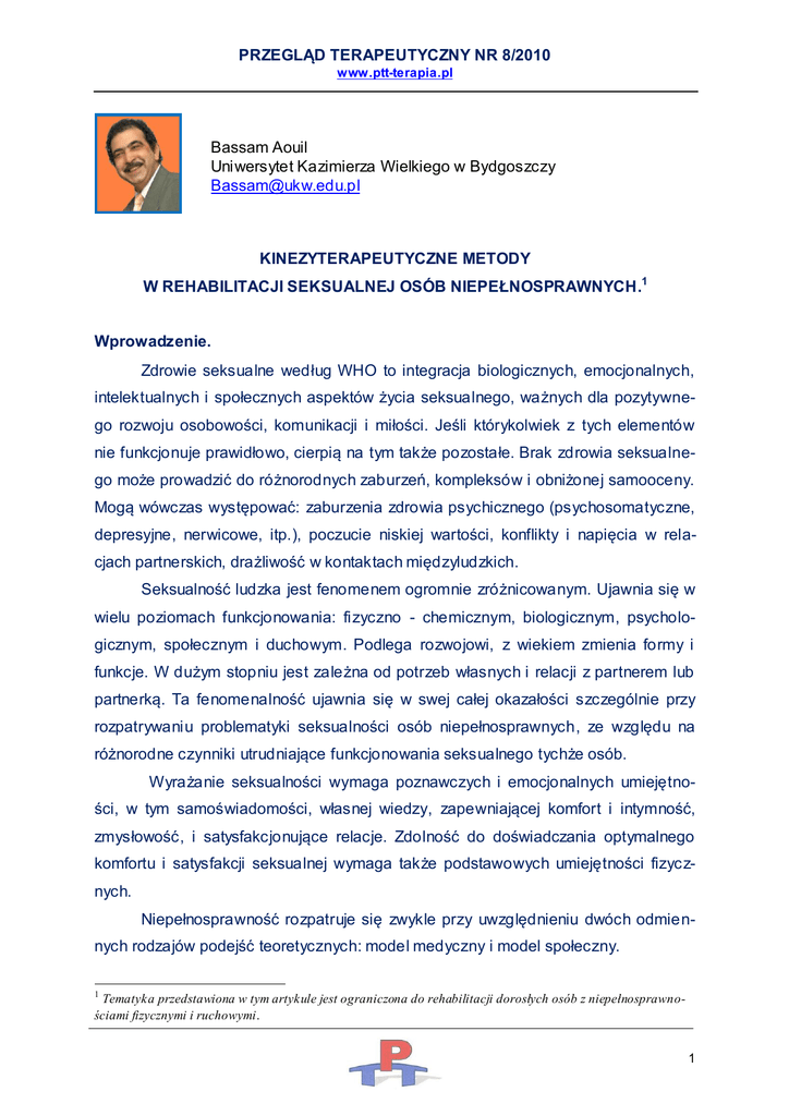 PRZEGLĄD TERAPEUTYCZNY NR 8/2010 www.ptt-terapia.pl Bassam Aouil Uniwersytet Kazimierza Wielkiego w Bydgoszczy [email protected] KINEZYTERAPEUTYCZNE METODY W REHABILITACJI SEKSUALNEJ OSÓB NIEPEŁNOSPRAWNYCH.1 Wprowadzenie. Zdrowie seksualne według WHO to integracja biologicznych, emocjonalnych, intelektualnych i społecznych aspektów życia seksualnego, ważnych dla pozytywnego rozwoju osobowości, komunikacji i miłości. Jeśli którykolwiek z tych elementów nie funkcjonuje prawidłowo, cierpią na tym także pozostałe. Brak zdrowia seksualnego może prowadzić do różnorodnych zaburzeń, kompleksów i obniżonej samooceny. Mogą wówczas występować: zaburzenia zdrowia psychicznego (psychosomatyczne, depresyjne, nerwicowe, itp.), poczucie niskiej wartości, konflikty i napięcia w relacjach partnerskich, drażliwość w kontaktach międzyludzkich. Seksualność ludzka jest fenomenem ogromnie zróżnicowanym. Ujawnia się w wielu poziomach funkcjonowania: fizyczno - chemicznym, biologicznym, psychologicznym, społecznym i duchowym. Podlega rozwojowi, z wiekiem zmienia formy i funkcje. W dużym stopniu jest zależna od potrzeb własnych i relacji z partnerem lub partnerką. Ta fenomenalność ujawnia się w swej całej okazałości szczególnie przy rozpatrywaniu problematyki seksualności osób niepełnosprawnych, ze względu na różnorodne czynniki utrudniające funkcjonowania seksualnego tychże osób. Wyrażanie seksualności wymaga poznawczych i emocjonalnych umiejętności, w tym samoświadomości, własnej wiedzy, zapewniającej komfort i intymność, zmysłowość, i satysfakcjonujące relacje. Zdolność do doświadczania optymalnego komfortu i satysfakcji seksualnej wymaga także podstawowych umiejętności fizycznych. Niepełnosprawność rozpatruje się zwykle przy uwzględnieniu dwóch odmiennych rodzajów podejść teoretycznych: model medyczny i model społeczny. 1 Tematyka przedstawiona w tym artykule jest ograniczona do rehabilitacji dorosłych osób z niepełnosprawnościami fizycznymi i ruchowymi. 1 PRZEGLĄD TERAPEUTYCZNY NR 8/2010 www.ptt-terapia.pl W modelu medycznym w niepełnosprawności podkreślana jest rola fizycznego uszkodzenia organizmu w wyniku chorób lub wypadków i akcentuje się, iż uszkodzenie jest przyczyną trudności w funkcjonowaniu. W modelu społecznym natomiast akcentowane są przede wszystkim trudności w wypełnianiu podstawowych ról społecznych, charakterystycznych dla osób w określonym wieku. Według tego modelu niepełnosprawność jest traktowana jako upośledzenie, które wynika z utraty cenionych zdolności i umiejętności, utrudniając człowiekowi aktywne uczestnictwo w życiu społecznym w stopniu, który byłby dla niego dostępny, gdyby nie posiadał ograniczeń sprawności. Osoby niepełnosprawne z pewnością potrzebują kompleksowej rehabilitacji, w tym wsparcia, doradztwa i szkolenia, ale to, czego potrzebujemy przede wszystkim jest równość w społeczeństwie. To oznacza nie tylko lepszy fizyczny dostęp do różnego rodzaju obiektów, ale przede wszystkim zmiany w postawach społecznych, w tym postawach polityków, nauczycieli i lekarzy tak, aby w ujęciu potrzeb rehabilitacyjnych została uwzględniona również rehabilitacja seksualna. Rehabilitacja seksualna osób niepełnosprawnych jest jednym z nowoczesnych kierunków współczesnej rehabilitacji, która się rozwija zarówno na gruncie medyc yny, jak i seksuologii. Rehabilitacja seksualna osób niepełnosprawnych ma przede wszystkim na celu poprawę jakości aktywności seksualnej, która stanowi elementem składowym poprawy jakości życia psychicznego, społecznego i zawodowego człowieka z niepełnosprawnością, poprzez możliwie eliminowanie lub minimalizowanie zaburzeń seksualnych wynikających pośrednio lub bezpośrednio z dysfunkcji organizmu a także z sytuacji psychicznej i społecznej. Istotną rolę w rehabilitacji seksua lnej odgrywa świadomość seksualna, w tym mechanizmy i funkcje zachowań seksua lnych. Dla realizacji celów rehabilitacji seksualnej osób niepełnosprawnych wymaga się nie tylko znajomości czynników chorobowych, oraz utrudniających funkcjonowania w sferze seksualnej, ale również znajomość biopsychospołecznych mechanizmów zachowań seksualnych i w związku z tym czynników leczniczo - terapeutycznych. Czy zachowania seksualne są sprawne, czy też niepełnosprawne? Czy niepełnosprawność, która może mieć różne przejawy i objawy a także może wynikać z różnych przyczyń stanowi barierę dla osób niepełnosprawnych w 2 PRZEGLĄD TERAPEUTYCZNY NR 8/2010 www.ptt-terapia.pl życiu seksualnym? Jaka jest efektywność stosowania różnych metod medycznych, w tym kinezytycznych, a także psychologiczno-społecznych, w rehabilitacji seksualnej? O seksualności osób niepełnosprawnych raczej nie można mówić w kategoriach pełnosprawności i niepełnosprawności, są tylko bariery, trudności i zaburzenia wynikające z dysfunkcji organizmu w konsekwencji niepełnosprawności, lub też z bycia osobą niepełnosprawną w społeczeństwie. W związku z tym rehabilitacja seksualna osób niepełnosprawnych ma za zadanie tworzenie skutecznych mechanizmów i programów wspierających realizację potrzeby seksualnej u osób niepełnosprawnych, z wykorzystywaniem różnorodnych metod dla osiągnięcia tego celu, przy uwzględnienia indywidualnej sytuacji każdego niepełnosprawnego i jego potrzeb. Istota problemu. Główny problem w seksualności osób niepełnosprawnych ma charakter społeczny i dotyczy podejścia do celu i zadań rehabilitacji oraz wartościowania tego, co jest ważne, a co nie jest ważne lub jest mniej ważne w procesie opieki i rehabilitacji. W wyniku tego często cała tematyka związana z seksualnością osób niepełnospra wnych od edukacji do rehabilitacji jest spychana na dalszy plan i pozostawiana w ci eniu medycznych lub społeczno-zawodowych celów rehabilitacji. Jest to jednak, jak 