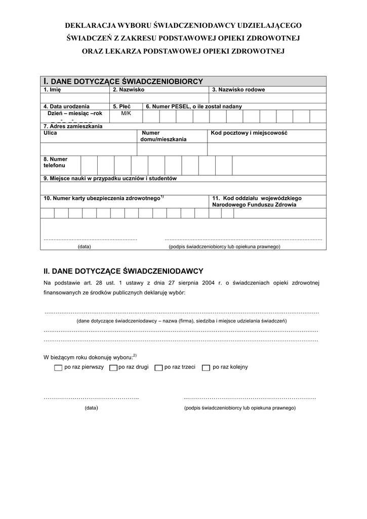 DEKLARACJA WYBORU ŚWIADCZENIODAWCY UDZIELAJĄCEGO ŚWIADCZEŃ Z ZAKRESU PODSTAWOWEJ OPIEKI ZDROWOTNEJ ORAZ LEKARZA PODSTAWOWEJ OPIEKI ZDROWOTNEJ I. DANE DOTYCZĄCE ŚWIADCZENIOBIORCY 1. Imię 2. Nazwisko 4. Data urodzenia Dzień – miesiąc –rok _ _-_ _-_ _ _ _ 7. Adres zamieszkania Ulica 5. Płeć M/K 3. Nazwisko rodowe 6. Numer PESEL, o ile został nadany Numer domu/mieszkania Kod pocztowy i miejscowość 8. Numer telefonu 9. Miejsce nauki w przypadku uczniów i studentów 10. Numer karty ubezpieczenia zdrowotnego ………………………………………………… 1) 11. Kod oddziału wojewódzkiego Narodowego Funduszu Zdrowia …………………………………………………………………………………… (podpis świadczeniobiorcy lub opiekuna prawnego) (data) II. DANE DOTYCZĄCE ŚWIADCZENIODAWCY Na podstawie art. 28 ust. 1 ustawy z dnia 27 sierpnia 2004 r. o świadczeniach opieki zdrowotnej finansowanych ze środków publicznych deklaruję wybór: ………………………………………………………………………………………………………………………………… (dane dotyczące świadczeniodawcy – nazwa (firma), siedziba i miejsce udzielania świadczeń) ………………………………………………………………………………………………………………………………… ………………………………………………………………………………………………………………………………… W bieżącym roku dokonuję wyboru: po raz pierwszy 2) po raz drugi ……………………………………….. (data) po raz trzeci po raz kolejny ..……………………………………………………… (podpis świadczeniobiorcy lub opiekuna prawnego) III. DANE DOTYCZĄCE LEKARZA PODSTAWOWEJ OPIEKI ZDROWOTNEJ Na podstawie art. 28 ust. 1a ustawy z dnia 27 sierpnia 2004 r. o świadczeniach opieki zdrowotnej finansowanych ze środków publicznych deklaruję wybór: 3) …………………………………………………………………………………………………………………………………………………………………….. (imię i nazwisko lekarza podstawowej opieki zdrowotnej) W bieżącym roku dokonuję wyboru: po raz pierwszy 2) po raz drugi po raz trzeci ……………………………………….. po raz kolejny ..……………………………………………………… (podpis świadczeniobiorcy lub opiekuna prawnego) (data) ……………………………………………………………………….. (podpis osoby przyjmującej deklarację wyboru) IV. DANE DOTYCZĄCE PIELĘGNIARKI PODSTAWOWEJ OPIEKI ZDROWOTNEJ Na podstawie art. 28 ust. 1a ustawy z dnia 27 sierpnia 2004 r. o świadczeniach opieki zdrowotnej finansowanych ze środków publicznych deklaruję wybór:3) …………………………………………………………………………………………………………………………………………………………………….. (imię i nazwisko pielęgniarki podstawowej opieki zdrowotnej) W bieżącym roku dokonuję wyboru: 2) po raz pierwszy po raz drugi ……………………………………….. po raz trzeci po raz kolejny ..……………………………………………………… (podpis świadczeniobiorcy lub opiekuna prawnego) (data) ……………………………………………………………………….. (podpis osoby przyjmującej deklarację wyboru) V. DANE DOTYCZĄCE POŁOŻNEJ PODSTAWOWEJ OPIEKI ZDROWOTNEJ Na podstawie art. 28 ust. 1a ustawy z dnia 27 sierpnia 2004 r. o świadczeniach opieki zdrowotnej finansowanych ze środków pub licznych deklaruję wybór:3) …………………………………………………………………………………………………………………………………………………………………….. (imię i nazwisko położnej podstawowej opieki zdrowotnej) W bieżącym roku dokonuję wyboru: 2) po raz pierwszy po raz drugi ……………………………………….. po raz trzeci po raz kolejny ..……………………………………………………… (podpis świadczeniobiorcy lub opiekuna prawnego) (data) ……………………………………………………………………….. (podpis osoby przyjmującej deklarację wyboru) Objaśnienia: 1) Jeżeli świadczeniobiorcy została wydana karta ubezpieczenia zdrowotnego, a w przypadku osób uprawnionych na podstawie przepisów o koordynacji – numer 2) Świadczeniobiorca ma prawo bezpłatnego wyboru świadczeniodawcy, lekarza, pielęgniarki i położnej podstawowej opieki zdrowotnej nie częściej niż trzy razy w roku poświadczenia potwierdzającego prawo do świadczeń opieki zdrowotnej w ramach ubezpieczenia zdrowotnego na terytorium Rzeczypospolitej Polskiej. kalendarzowym, a w przypadku każdej kolejnej zmiany wnosi opłatę w wysokości 80 zł. Świadczeniobiorca nie ponosi opłaty w przypadku zmiany swojego miejsca zamieszkania lub w przypadku zaprzestania udzielania świadczeń opieki zdrowotnej przez wybranego świadczeniodawcę, lekarza, pielęgniarkę lub położną podstawowej opieki zdrowotnej u wybranego świadczeniodawcy lub z innych przyczyn powstałych po stronie świadczeniodawcy (art. 28 ust. 1c i 1d ustawy z dnia 27 sierpnia 2004 r. o świadczeniach opieki zdrowotnej finansowanych ze środków publicznych). 3) Świadczeniobiorca może wybrać lekarza, pielęgniarkę lub położną podstawowej opieki zdrowotnej u tego samego świadczeniodawcy, u różnych świadczeniodawców albo będących świadczeniodawcami (art. 28 ust. 1b ustawy z dnia publicznych). 27 sierpnia 2004 r. o świadczeniach opieki zdrowotnej finansowanych ze środków