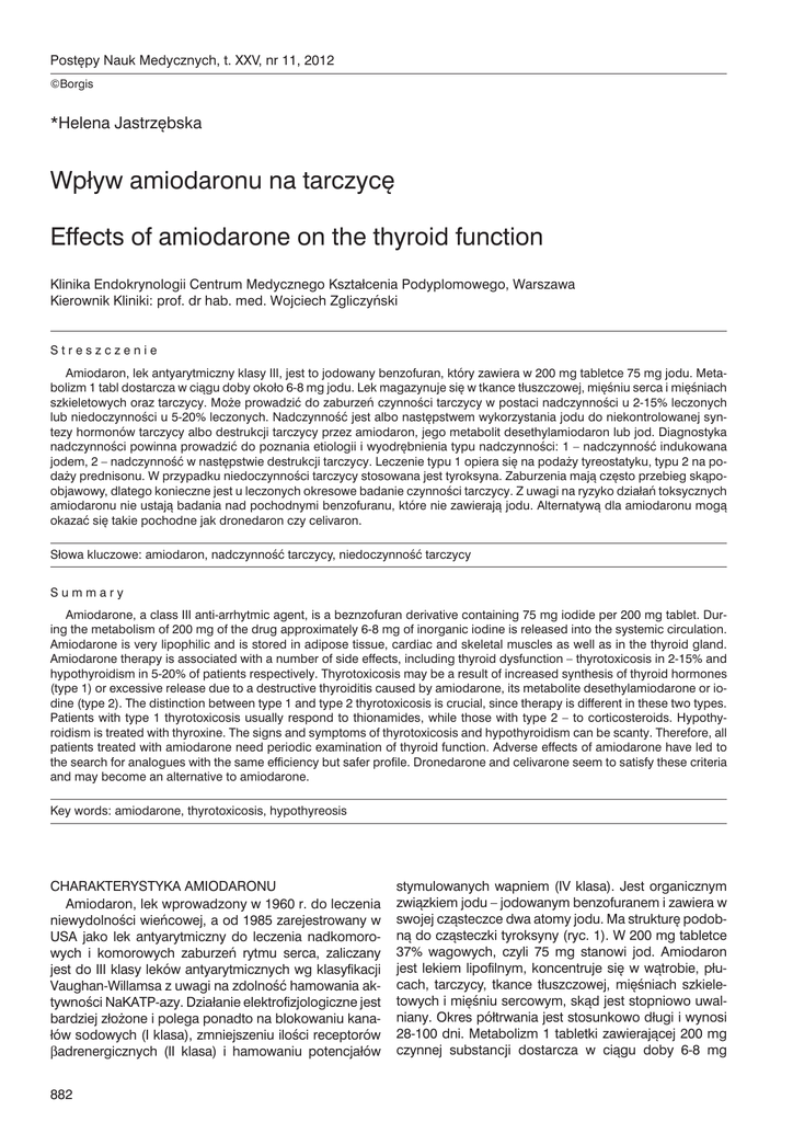 Postępy Nauk Medycznych, t. XXV, nr 11, 2012 ©Borgis *Helena Jastrzębska Wpływ amiodaronu na tarczycę Effects of amiodarone on the thyroid function Klinika Endokrynologii Centrum Medycznego Kształcenia Podyplomowego, Warszawa Kierownik Kliniki: prof. dr hab. med. Wojciech Zgliczyński Streszczenie Amiodaron, lek antyarytmiczny klasy III, jest to jodowany benzofuran, który zawiera w 200 mg tabletce 75 mg jodu. Metabolizm 1 tabl dostarcza w ciągu doby około 6-8 mg jodu. Lek magazynuje się w tkance tłuszczowej, mięśniu serca i mięśniach szkieletowych oraz tarczycy. Może prowadzić do zaburzeń czynności tarczycy w postaci nadczynności u 2-15% leczonych lub niedoczynności u 5-20% leczonych. Nadczynność jest albo następstwem wykorzystania jodu do niekontrolowanej syntezy hormonów tarczycy albo destrukcji tarczycy przez amiodaron, jego metabolit desethylamiodaron lub jod. Diagnostyka nadczynności powinna prowadzić do poznania etiologii i wyodrębnienia typu nadczynności: 1 – nadczynność indukowana jodem, 2 – nadczynność w następstwie destrukcji tarczycy. Leczenie typu 1 opiera się na podaży tyreostatyku, typu 2 na podaży prednisonu. W przypadku niedoczynności tarczycy stosowana jest tyroksyna. Zaburzenia mają często przebieg skąpoobjawowy, dlatego konieczne jest u leczonych okresowe badanie czynności tarczycy. Z uwagi na ryzyko działań toksycznych amiodaronu nie ustają badania nad pochodnymi benzofuranu, które nie zawierają jodu. Alternatywą dla amiodaronu mogą okazać się takie pochodne jak dronedaron czy celivaron. Słowa kluczowe: amiodaron, nadczynność tarczycy, niedoczynność tarczycy Summary Amiodarone, a class III anti-arrhytmic agent, is a beznzofuran derivative containing 75 mg iodide per 200 mg tablet. During the metabolism of 200 mg of the drug approximately 6-8 mg of inorganic iodine is released into the systemic circulation. Amiodarone is very lipophilic and is stored in adipose tissue, cardiac and skeletal muscles as well as in the thyroid gland. Amiodarone therapy is associated with a number of side effects, including thyroid dysfunction – thyrotoxicosis in 2-15% and hypothyroidism in 5-20% of patients respectively. Thyrotoxicosis may be a result of increased synthesis of thyroid hormones (type 1) or excessive release due to a destructive thyroiditis caused by amiodarone, its metabolite desethylamiodarone or iodine (type 2). The distinction between type 1 and type 2 thyrotoxicosis is crucial, since therapy is different in these two types. Patients with type 1 thyrotoxicosis usually respond to thionamides, while those with type 2 – to corticosteroids. Hypothyroidism is treated with thyroxine. The signs and symptoms of thyrotoxicosis and hypothyroidism can be scanty. Therefore, all patients treated with amiodarone need periodic examination of thyroid function. Adverse effects of amiodarone have led to the search for analogues with the same efficiency but safer profile. Dronedarone and celivarone seem to satisfy these criteria and may become an alternative to amiodarone. Key words: amiodarone, thyrotoxicosis, hypothyreosis CHARAKTERYSTYKA AMIODARONU Amiodaron, lek wprowadzony w 1960 r. do leczenia niewydolności wieńcowej, a od 1985 zarejestrowany w USA jako lek antyarytmiczny do leczenia nadkomorowych i komorowych zaburzeń rytmu serca, zaliczany jest do III klasy leków antyarytmicznych wg klasyfikacji Vaughan-Willamsa z uwagi na zdolność hamowania aktywności NaKATP-azy. Działanie elektrofizjologiczne jest bardziej złożone i polega ponadto na blokowaniu kanałów sodowych (I klasa), zmniejszeniu ilości receptorów βadrenergicznych (II klasa) i hamowaniu potencjałów 882 stymulowanych wapniem (IV klasa). Jest organicznym związkiem jodu – jodowanym benzofuranem i zawiera w swojej cząsteczce dwa atomy jodu. Ma strukturę podobną do cząsteczki tyroksyny (ryc. 1). W 200 mg tabletce 37% wagowych, czyli 75 mg stanowi jod. Amiodaron jest lekiem lipofilnym, koncentruje się w wątrobie, płucach, tarczycy, tkance tłuszczowej, mięśniach szkieletowych i mięśniu sercowym, skąd jest stopniowo uwalniany. Okres półtrwania jest stosunkowo długi i wynosi 28-100 dni. Metabolizm 1 tabletki zawierającej 200 mg czynnej substancji dostarcza w ciągu doby 6-8 mg Wpływ amiodaronu na tarczycę wolnego jodu. Może wywoływać niekorzystny wpływ na tarczycę, a także inne narządy w tym płuca (prowadząc do włóknienia płuc), oczy (przyczyniając się do powstawania mikrozłogów w rogówce), skórę (powodując nadwrażliwość na światło), przewód pokarmowy (działając hepatotoksycznie) i układ nerwowy (powodując neuropatię obwodową). Metabolizm amiodaronu dokonuje się w wątrobie. Proces dealkilacji prowadzi do powstania aktywnego metabolitu desethylamiodaronu. Metabolit ten charakteryzuje się długim okresem półtrwania wynoszącym 57 dni, osiąga wysokie stężenie w mięśniu sercowym i ma działanie elektrofizjologiczne podobne do amiodaronu. Wywiera także podobny do amiodaronu wpływ na tarczycę. Wpływ ten uzależniony jest od czynników środowiskowych, w tym głównie podaży jodu, współistniejących chorób tarczycy i predyspozycji genetycznych. Zaburzenia wynikające z obecności jodu w cząsteczce amiodaronu Jod uwolniony z cząsteczki amiodaronu może być przyczyną: niedoczynności tarczycy, nadczynności tarczycy i zapalenia tarczycy. Jak wspomniano metabolizm 200 mg tabletki amiodaronu dostarcza w ciągu doby 6-8 mg jodu i z uwagi na długi okres półtrwania uwalnianie ma miejsce także po odstawieniu leku. Podczas przewlekłego leczenia ilość jodu uwolnionego z jednej tabletki amiodaronu przekracza 30-krotnie dawkę dobową rekomendowaną osobie dorosłej, wynoszącą 150 µg. Nadmierna podaż jodu prowadzi w mechanizmie Wolffa-Chaikoffa do zahamowania syntezy i uwalniania hormonów tarczycy. U osób zdrowych ze sprawnym mechanizmem adaptacyjnym omijania zwanym escape fenomenon za