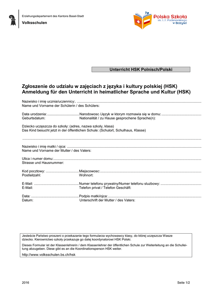 Erziehungsdepartement des Kantons Basel-Stadt Volksschulen Unterricht HSK Polnisch/Polski Zgłoszenie do udziału w zajęciach z języka i kultury polskiej (HSK) Anmeldung für den Unterricht in heimatlicher Sprache und Kultur (HSK) Nazwisko i imię ucznia/uczennicy:. ................................................................................................................. Name und Vorname der Schülerin / des Schülers: Data urodzenia: ............................. Narodowosc /Język w ktorym rozmawia się w domu: ......................................... Geburtsdatum: Nationalität / zu Hause gesprochene Sprache(n): Dziecko uczęszcza do szkoły: (adres, nazwa szkoły, klasa) Das Kind besucht jetzt in der öffentlichen Schule: (Schulort, Schulhaus, Klasse) ........................................................................................................................................................................................ Nazwisko i imię matki / ojca: .......................................................................................................................... Name und Vorname der Mutter / des Vaters: Ulica i numer domu: ........................................................................................................................................................ Strasse und Hausnummer: Kod pocztowy: .................................. Miejscowosc: ........................................................................................................ Postleitzahl: Wohnort: E-Mail: .............................................. Numer telefonu prywatny/Numer telefonu sluzbowy: .......................................... E-Mail: Telefon privat / Telefon Geschäft: Data: ................................................. Podpis matki/ojca: ................................................................................................ Datum: Unterschrift der Mutter / des Vaters: Jesteście Państwo proszeni o przekazanie tego formularza wychowawcy klasy, do której uczęszcza Wasze dziecko. Kierownictwo szkoły przekazuje go dalej koordynatorowi HSK Polski. Dieses Formular ist der Klassenlehrerin / dem Klassenlehrer der öffentlichen Schule zur Weiterleitung an die Schulleitung abzugeben. Diese gibt es an die Koordinationsperson HSK weiter. http://www.volksschulen.bs.ch/hsk 2016 Seite 1/2 Drodzy Rodzice, Wasze dziecko ma mozliwosc uczeszczania w naszym kantonie na zajecia z Kultury i Jezyka Polskiego. Na zajecia HSK Polski przyjmujemy dzieci od trzeciego roku zycia. Lekcje w HSK maja pomoc dziecku poglebic i rozwinac znajomosc jezyka i kultury kraju z ktorego pochodzi, badz z ktorego pochodzi jedno z rodzicow. Dziecko poprzez nauke jezyka rodzicow, wzbogaca swoja osobowosc i ksztaltuje poczucie przynaleznosci rodzinnej i kulturowej. Zajecia te maja byc rowniez pomocne w rozwoju jego dwu- lub wielojezycznosci. Badania naukowe potwierdzaja fakt, iz dobra znajomosc pierwszego jezyka dziecka, wspomaga nauke kolejnych jezykow. Wyniki w nauce w HKS mozna dolaczyc do swiadectwa szkolnego dziecka, co w przyszlosci moze okazac sie korzystne w zdobywaniu dalszego wykszalcenia jak studia wyzsze w Szwajcarii jak i za granica. Polecamy Panstwu zgloszenie Waszego dziecka na zajecia z HSK Polski. Erziehungsdepartement Basel-Stadt Liebe Eltern Ihre Tochter oder Ihr Sohn hat in unserem Kanton die Möglichkeit, den Unterricht HSK in Polnisch zu besuchen. Dieser Unterricht wird ab 1. Kindergartenjahr angeboten. Im Unterricht HSK erweitern die Kinder ihre Kenntnisse in einer Erstsprache sowie in der Kultur des Herkunftslandes. Die Beschäftigung mit einer Herkunftssprache und -kultur hilft den Kindern bei der Entwicklung ihrer individuellen wie familiären Identität und stärkt sie in ihrer Zwei- oder Mehrsprachigkeit. Forschungsergebnisse zeigen, dass ein Kind mit guten Kompetenzen in der Erstsprache Vorteile hat beim Lernen weiterer Sprachen. Die Kompetenzen in einer Erstsprache, die das Kind im Unterricht HSK erworben und gefestigt hat, werden im Zeugnis der öffentlichen Schule ausgewiesen. Das kann ein Vorteil sein bei der Ausbildung, einem Studium und einer späteren Erwerbsarbeit sowohl in der Schweiz wie im Ausland. Wir empfehlen Ihnen, Ihr Kind für den Besuch des Unterrichts in heimatlicher Sprache und Kultur anzumelden. Erziehungsdepartement Basel-Stadt Name und Adresse der Schulkoordinatorin / des Schulkoordinators: Bernadeta Sonnleitner Spiegelbergstr. 24 4059 Basel [email protected] www.polskazkola.ch Hinweise an die Eltern: 1. 2. 3. 4. 5. 6. 7. 8. Zajecia w HSK Polski organizowane sa poprzez Stowarzyszenie Rodzicow. Uczestnictwo w zajeciach HSK jest dobrowolne, natomiast po zgloszeniu dziecka na zajecia obowiazkowe. Zajecia w HSK rozpoczynaja sie i trwaja w tym samym czasie co rok szkolny. Obowiazuja te same ferie i dni wolne od nauki. Zajecia trwaja najwyzej trzy godziny lekcyjne w tygodniu i odbywaja sie w soboty doploudnia w budynku szkoly na terenie Bazylei. Wysokosc oplaty za zajecia HSK zostaje ustalana przez Stowarzyszenie Rodzicow i jemu uiszszana. Koordynator HSK informuje rodzicow bezposrednio o godzinach i miescu zajec. Zgloszenia nalezy dokonywac mozliwie na koncu roku szkolnego, bezposrednio do koordynatora. Dzieci uczestniczace w zajeciach HSK moga otrzymac ocene ich umiejetnosci, ktora to moze znalezc sie na swiadectwie szkoly publicznej. Dzieci otrzymaja na swiadectwie wpis informujacy o ich uczestnictwie w tychze zajeciach. Hinweise an die Eltern: 1. 2. 3. 4. 5. 6. 7. 8. Der Unterricht wird vom Elternverein getragen. Der Besuch des Unterrichts wird empfohlen, ist aber freiwillig. Nach der Anmeldung ist der Unterrichtsbesuch obligatorisch. Der Unterricht beginnt bei Schuljahresbeginn im August und hat den gleichen Ferienplan wie die öffentliche Schule. Er umfasst höchstens 3 Unterrichtsstunden pro Woche und findet an einem Nachmittag oder samstagvormittags in der Regel in einem Schulhaus statt. Der finanzielle Beitrag der Eltern an de