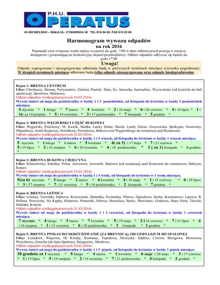 43-300 BIELSKO – BIAŁA UL. CYNIARSKA 38 TEL:816 84 82; FAX 815 03 80 Harmonogram wywozu odpadów na rok 2016 Pojemniki oraz związane worki należy wystawić do godz. 7:00 w dniu odbioru przed posesją w miejscu dostępnym i gwarantującym bezkolizyjny dojazd przedsiębiorcy. Odbiór odpadów odbywać się będzie do godz.17:00 Uwaga! Odpady segregowane i niesegregowane odbierane będą w pierwszych terminach miesiąca (czcionka pogrubiona). W drugich terminach miesiąca odbierane będą tylko odpady niesegregowane oraz odpady biodegradowalne Rejon 1: BRENNA CENTRUM Ulice: Chrobaczy, Stroma, Partyzantów, Zielona, Pasieki, Huta, Ks. Juroszka, Jastrzębiec, Wyzwolenia (od kościoła do hali sportowej), Sportowa, Malinowa. Odbiór odpadów wielkogabarytowych 19.03.2016r. Wywóz śmieci od maja do października w każdy 1 i 3 poniedziałek, od listopada do kwietnia w każdy 1 poniedziałek miesiąca. 4 stycznia * 1 lutego * 7 marca * 4 kwietnia * 2 i 16 maja * 6 i 20 czerwca * 4 i 18 lipca * 1 i 16( za 15)sierpnia * 5 i 19 września * 3 i 17 października * 7 listopada * 5 grudnia * Rejon 2: BRENNA WĘGIERSKI I CZĘŚĆ BUKOWEJ Ulice: Węgierski, Pościenny, M. Kawik, Skałka, Lachy Dolne, Borek, Lachy Górne, Goczowska, Spokojna, Nostrożny, Objazdowa, Armii Krajowej, Osiedlowa, Świerkowa, Bukowa (od Węgierskiego do restauracji pod Kotarzem). Odbiór odpadów wielkogabarytowych 22.03.2016r. Wywóz śmieci od maja do października w każdy 1 i 3 wtorek, od listopada do kwietnia w każdy 1 wtorek miesiąca. 5 stycznia * 2 lutego * 1 marca * 5 kwietnia * 4( za 3) i 17 maja * 7 i 21 czerwca * 5 i 19 lipca * 2 i 16 sierpnia * 6 i 20 września * 4 i 18 października * 2 ( za 1) listopada * 6 grudnia * Rejon 3: BRENNA BUKOWA I HOŁCYNA Ulice: Klimorówka, Szkolna, Polna, Jaworowa, Jawornik, Bukowa (od restauracji pod Kotarzem do cmentarza), Hołcyna, Kotarz. Odbiór odpadów wielkogabarytowych 23.03.2016r. Wywóz śmieci od maja do października w każdą 1 i 3 środę, od listopada do kwietnia w 1 środę miesiąca. 5(za 6) stycznia * 3 lutego * 2 marca * 6 kwietnia * 4 i 18 maja * 1 i 15 czerwca * 6 i 20 lipca * 3 i 17 sierpnia * 7 i 21 września * 5 i 19 października * 2 listopada * 7 grudnia * Rejon 4: BRENNA LEŚNICA Ulice: Leśnica, Trowniki, Dębowa, Krzywonek, Hetnołka, Świniorka, Pilarzy, Ogrodowa, Sucha, Kasztanowa, Lipowa, R. Hellera, Nowociny, Na Kępkę, Klonowa, Pasternik, Orłowa, Horzelica, Stawy, Stawieńce, Grabowa, Stary Groń, Tłoczki, Malinka, Kobyla. Odbiór odpadów wielkogabarytowych 21.03.2016r. Wywóz śmieci od maja do października w każdy 1 i 3 czwartek, od listopada do kwietnia w każdy 1 czwartek miesiąca. 7 stycznia * 4 lutego * 3 marca * 7 kwietnia * 5 i 19 maja * 2 i 16 czerwca * 7 i 21 lipca * 4 i 18 sierpnia * 1 i 15 września * 6 i 20 października * 3 listopada * 1 grudnia * Rejon 5: BRENNA PINKAS DO SKRZYŻOWANIE (ZA BRENNICĄ), OD GIMNAZJUM DO SPALONEJ Ulice: Leśników, Wiązowa, Dr Kisiały, Kormany, Topolowa, Drożyska, Głębiec, Cisowa, Brzegowa, Brzozowa, Wierzbowa, Górecka (do baru Spalona), Śniegociny, Miodowa. Odbiór odpadów wielkogabarytowych 24.03.2016r. Wywóz śmieci od maja do października w każdy 1 i 3 piątek, od listopada do kwietnia w każdy 1 piątek miesiąca. 30 grudnia za 1 stycznia * 5 lutego * 4 marca * 1 kwietnia * 6 maja i 20 maja * 3 i 17 czerwca * 1 i 15 lipca * 5 i 19 sierpnia * 2 i 16 września * 7 i 21 października * 4 listopada * 2 grudnia * Rejon 6: BRENNA SKRZYŻOWANIE – GÓRKI M. – GÓRKI W. (ZA BRENNICĄ) Brenna, ulice: Barujec, Rolnicza, Żory, Stara Droga. Górki M., ulice: Stara Droga, Cienista Górki W., ulice: Wesoła, Olszyna, L. Żagana, Topolowa, Żurówka, Turystyczna, Myśliwska, Wilcza, Łamana, Kretowskie, Okrężna, Nad Wodospadem, Leśna Kamionka, Skośna, Pod Zebrzydkę, Potok, Rocha, Kmicica, Zagłoby, Przełom, Jasna, Szczęśliwa, Długa, Działowa, Radosna, Skrzypka. Odbiór odpadów wielkogabarytowych 16.03.2016r. Wywóz śmieci od maja do października w każdy 2 i 4 poniedziałek, od listopada do kwietnia w każdy 2 poniedziałek miesiąca. 11 stycznia * 8 lutego * 14 marca * 11 kwietnia * 9 i 23 maja * 13 i 27 czerwca * 11 i 25 lipca * 8 i 22 sierpnia * 12 i 26 września * 10 i 24 października * 14 listopada * 12 grudnia * Rejon 7: BRENNA – GÓRKI MAŁE Brenna, ulice: Snowaniec, Łęgowa, Wiejska, Żarnowiec, Lipowska, Górecka (od baru Spalona do Brenna Skrzyżowanie). Górki M., ulice: Lipowska, Wichrowe Wzgórza, Do Warszawy, Lipowski Groń, Łączka, Lekarska, Elektryków, Chłopska, Łęgowa, Zamilerze, Mleczna, Nowociny, Wusionka, Stawki, Klubowa, Uliczka, Kowalska, Objazdowa, Krótka, Rzeczna, Breńska, Wałowa. Odbiór odpadów wielkogabarytowych 17.03.2016r. Wywóz śmieci od maja do października w każdy 2 i 4 wtorek, od listopada do kwietnia w każdy 2 wtorek miesiąca. 12 stycznia * 9 lutego * 8 marca * 12 kwietnia * 10 i 24 maja * 14 i 28 czerwca * 12 i 26 lipca * 9 i 23 sierpnia * 13 i 27 września * 11 i 25 października * 8 listopada * 13 grudnia * Rejon 8: GÓRKI WIELKIE – BUCZE , SZPOTAWICE Ulice: Bielska, Szkolna, Szpotawicka, W. Krząszcza, Czereśniowa, Wiśniowa, Podgórka, Pogodna, Jabłoniowa, Kosów, Brzoskwiniowa, Morelowa, Sowia, Bociania, Słowicza, Jastrzębia, Stroma, Żurawia, Krucza, Jaskółcza, Drozdów, Zacisze, Grodziecka, Jarzębinowa, Cisowa, Leszczynowa, Grabowa, Wierzbowa, Olchowa, Kasztanowa, Akacjowa, Jaworowa, Bukowa, Wiązowa, Solarska, Jesionowa, Klonowa, Modrzewiowa, Lipowa, Sosnowa, Jodłowa, Świerkowa, Dzielowy, Brzozowa, Dębowa, Do Raju, Osiedlowa, Harcerska, Ogrodowa, Bucze, Spacerowa, Na Wzgórzu, Widokowa, Miodowa. Odbiór odpadów wielkogabarytowych 18.03.2016r. Wywóz śmieci od maja do października w każdą 2 i 4 środę, od listopada do kwietnia w każdą 2 środę miesiąca. 13 stycznia * 10 lutego * 9 marca * 13 kwietnia * 11 i 25 maja * 8 i 22 czerwca * 13 i 27 lipca * 10 i 24 sierpnia * 14 i 28 września * 12