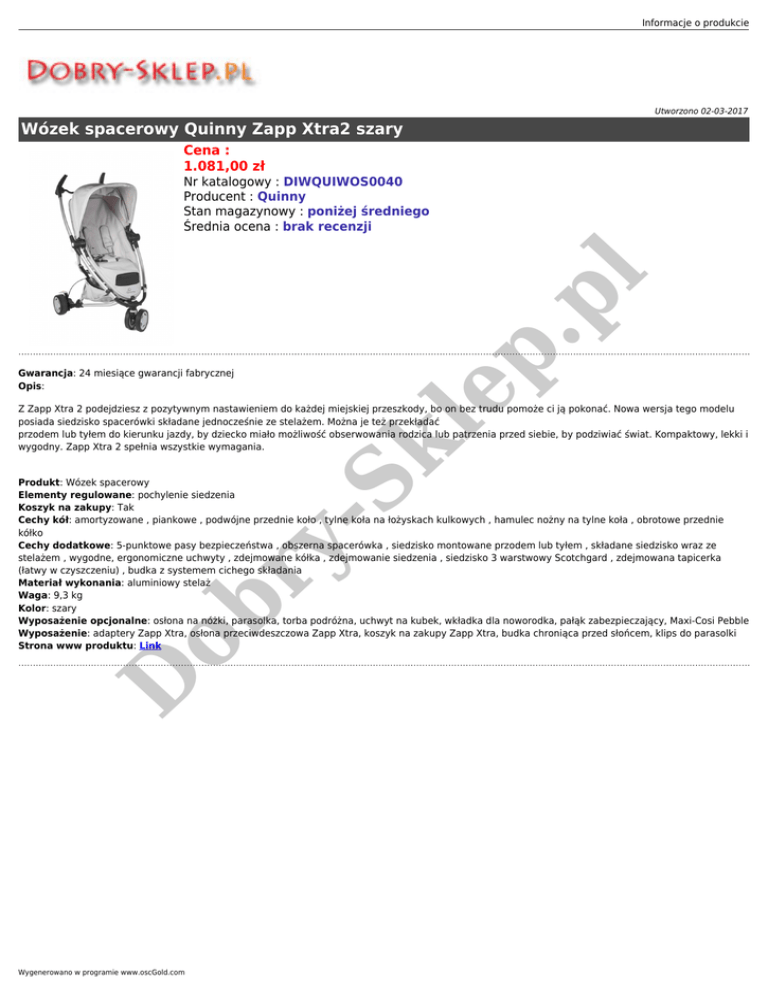 Informacje o produkcie Utworzono 02-03-2017 Wózek spacerowy Quinny Zapp Xtra2 szary Cena : 1.081,00 zł Sk le Gwarancja: 24 miesiące gwarancji fabrycznej Opis: p. pl Nr katalogowy : DIWQUIWOS0040 Producent : Quinny Stan magazynowy : poniżej średniego Średnia ocena : brak recenzji Z Zapp Xtra 2 podejdziesz z pozytywnym nastawieniem do każdej miejskiej przeszkody, bo on bez trudu pomoże ci ją pokonać. Nowa wersja tego modelu posiada siedzisko spacerówki składane jednocześnie ze stelażem. Można je też przekładać przodem lub tyłem do kierunku jazdy, by dziecko miało możliwość obserwowania rodzica lub patrzenia przed siebie, by podziwiać świat. Kompaktowy, lekki i wygodny. Zapp Xtra 2 spełnia wszystkie wymagania. D ob ry - Produkt: Wózek spacerowy Elementy regulowane: pochylenie siedzenia Koszyk na zakupy: Tak Cechy kół: amortyzowane , piankowe , podwójne przednie koło , tylne koła na łożyskach kulkowych , hamulec nożny na tylne koła , obrotowe przednie kółko Cechy dodatkowe: 5-punktowe pasy bezpieczeństwa , obszerna spacerówka , siedzisko montowane przodem lub tyłem , składane siedzisko wraz ze stelażem , wygodne, ergonomiczne uchwyty , zdejmowane kółka , zdejmowanie siedzenia , siedzisko 3 warstwowy Scotchgard , zdejmowana tapicerka (łatwy w czyszczeniu) , budka z systemem cichego składania Materiał wykonania: aluminiowy stelaż Waga: 9,3 kg Kolor: szary Wyposażenie opcjonalne: osłona na nóżki, parasolka, torba podróżna, uchwyt na kubek, wkładka dla noworodka, pałąk zabezpieczający, Maxi-Cosi Pebble Wyposażenie: adaptery Zapp Xtra, osłona przeciwdeszczowa Zapp Xtra, koszyk na zakupy Zapp Xtra, budka chroniąca przed słońcem, klips do parasolki Strona www produktu: Link Wygenerowano w programie www.oscGold.com