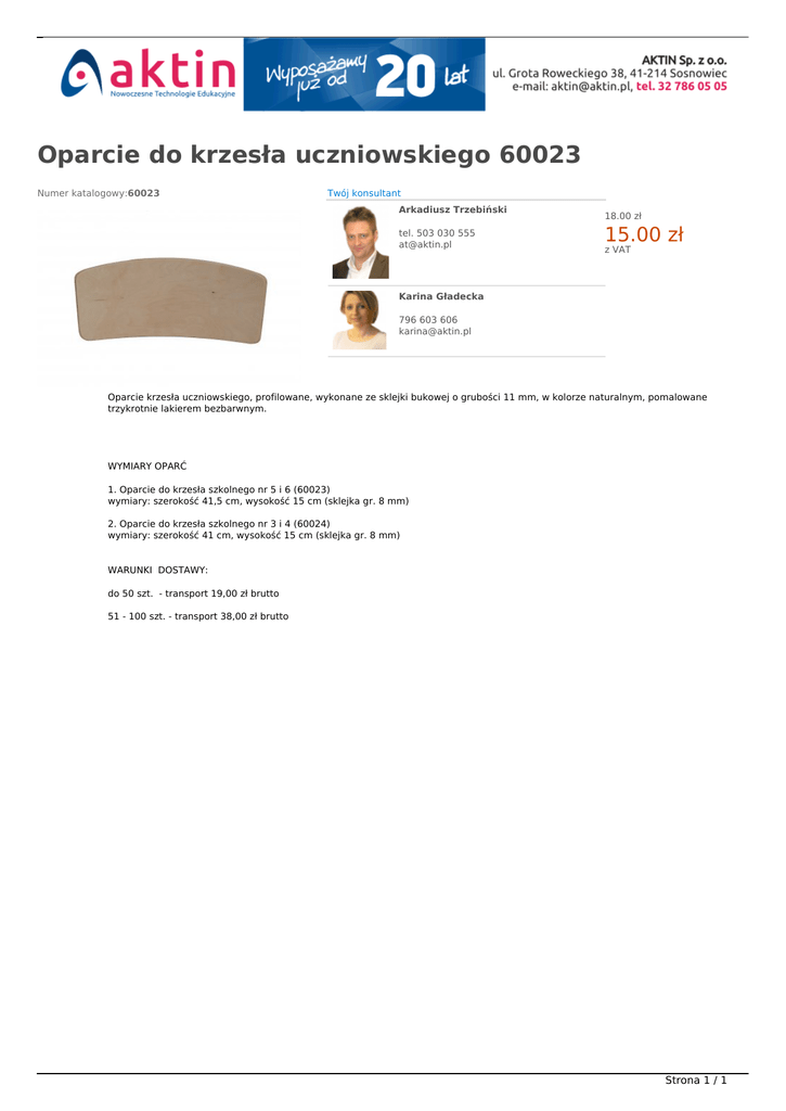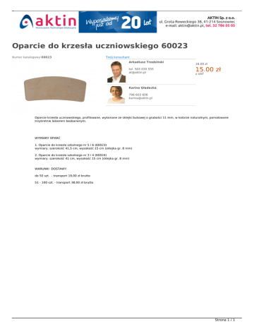 Oparcie do krzesła uczniowskiego 60023 Numer katalogowy:60023 Twój konsultant Arkadiusz Trzebiński tel. 503 030 555 [email protected] NOWOŚĆ W OFERCIE 18.00 zł 15.00 zł z VAT Karina Gładecka 796 603 606 [email protected] Oparcie krzesła uczniowskiego, profilowane, wykonane ze sklejki bukowej o grubości 11 mm, w kolorze naturalnym, pomalowane trzykrotnie lakierem bezbarwnym. WYMIARY OPARĆ 1. Oparcie do krzesła szkolnego nr 5 i 6 (60023) wymiary: szerokość 41,5 cm, wysokość 15 cm (sklejka gr. 8 mm) 2. Oparcie do krzesła szkolnego nr 3 i 4 (60024) wymiary: szerokość 41 cm, wysokość 15 cm (sklejka gr. 8 mm) WARUNKI DOSTAWY: do 50 szt. - transport 19,00 zł brutto 51 - 100 szt. - transport 38,00 zł brutto Strona 1 / 1 Powered by TCPDF (www.tcpdf.org)