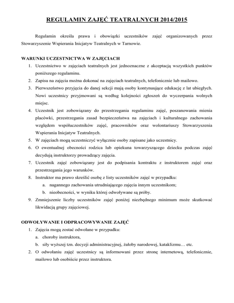 REGULAMIN ZAJĘĆ TEATRALNYCH 2014/2015 Regulamin określa prawa i obowiązki uczestników zajęć organizowanych przez Stowarzyszenie Wspierania Inicjatyw Teatralnych w Tarnowie. WARUNKI UCZESTNICTWA W ZAJĘCIACH 1. Uczestnictwo w zajęciach teatralnych jest jednoznaczne z akceptacją wszystkich punktów poniższego regulaminu. 2. Zapisu na zajęcia można dokonać na zajęciach teatralnych, telefonicznie lub mailowo. 3. Pierwszeństwo przyjęcia do danej sekcji mają osoby kontynuujące edukację z lat ubiegłych. Nowi uczestnicy przyjmowani są według kolejności zgłoszeń do wyczerpania wolnych miejsc. 4. Uczestnik jest zobowiązany do przestrzegania regulaminu zajęć, poszanowania mienia placówki, przestrzegania zasad bezpieczeństwa na zajęciach i kulturalnego zachowania względem współuczestników zajęć, pracowników oraz wolontariuszy Stowarzyszenia Wspierania Inicjatyw Teatralnych. 5. W zajęciach mogą uczestniczyć wyłącznie osoby zapisane jako uczestnicy. 6. O ewentualnej obecności rodzica lub opiekuna towarzyszącego dziecku podczas zajęć decydują instruktorzy prowadzący zajęcia. 7. Uczestnik zajęć zobowiązany jest do podpisania kontraktu z instruktorem zajęć oraz przestrzegania jego warunków. 8. Instruktor ma prawo skreślić osobę z listy uczestników zajęć w przypadku: a. nagannego zachowania utrudniającego zajęcia innym uczestnikom; b. nieobecności, w wyniku której odwoływane są próby. 9. Zmniejszenie liczby uczestników zajęć poniżej niezbędnego minimum może skutkować likwidacją grupy zajęciowej. ODWOŁYWANIE I ODPRACOWYWANIE ZAJĘĆ 1. Zajęcia mogą zostać odwołane w przypadku: a. choroby instruktora, b. siły wyższej tzn. decyzji administracyjnej, żałoby narodowej, kataklizmu… etc. 2. O odwołaniu zajęć uczestnicy są informowani przez stronę internetową, telefonicznie, mailowo lub osobiście przez instruktora. KWESTIE ORGANIZACYJNE 1. Zajęcia odbywają się w wyznaczonym przez Zarząd Stowarzyszenia miejscu i terminie. 2. Uczestnicy zajęć teatralnych podzieleni są przez prowadzącego zajęcia na grupy odpowiednio liczebne, dostosowane do wieku i poziomu zaawansowania. 3. Uczestnik zajęć zobowiązany jest przychodzić na zajęcia w stroju odpowiednim do ćwiczeń (miękkie obuwie, ubranie niekrępujące ruchów). 4. Korzystanie z aparatów, telefonów, kamer i innych urządzeń elektronicznych przez uczniów na zajęciach jest zabronione. 5. Za rzeczy wartościowe pozostawione na terenie placówki SWIT nie odpowiada. 6. Nie należy spóźniać się na zajęcia, gdyż przeszkadza to innym uczestnikom zajęć 7. Obowiązuje szacunek do instruktora prowadzącego zajęcia i wszystkich uczestników. 8. Na zajęciach należy zachowywać kulturę osobistą i porządek. 9. Za zniszczenie strojów/rekwizytów/scenografii będącej własnością Stowarzyszenia Wspierania Inicjatyw Teatralnych odpowiedzialność finansową ponoszą uczestnicy zajęć (w przypadku osób niepełnoletnich ich prawni opiekunowie). 10. Uczestnicy (bądź w przypadku osób niepełnoletnich ich prawni opiekunowie) wyrażają zgodę na wykorzystywanie swego wizerunku lub wizerunku dziecka w celach promocyjnych Stowarzyszenia. 11. Tematyka spektakli jest zawsze konsultowana w grupie, nie jest przedmiotem nacisku prowadzącego. 12. W przypadku choroby uczestnika zajęć przed planowanym występem lub wyjazdem, zobowiązany on jest zawiadomić instruktora osobiście lub przez rodzica (opiekuna). 13. W przypadku problemów zdrowotnych uczestnika mających wpływ na jego uczestnictwo w zajęciach, rodzic (opiekun) ma obowiązek poinformować o tym instruktora. 14. W przypadku wyjazdu na przegląd teatralny odbywający się poza terenem miasta, koszty transportu i akredytacji pokrywa Stowarzyszenie Wspierania Inicjatyw Teatralnych. 15. W razie jakichkolwiek problemów prosimy o kontakt pod adresem mailowym: [email protected] lub telefoniczny: 600 503 739.