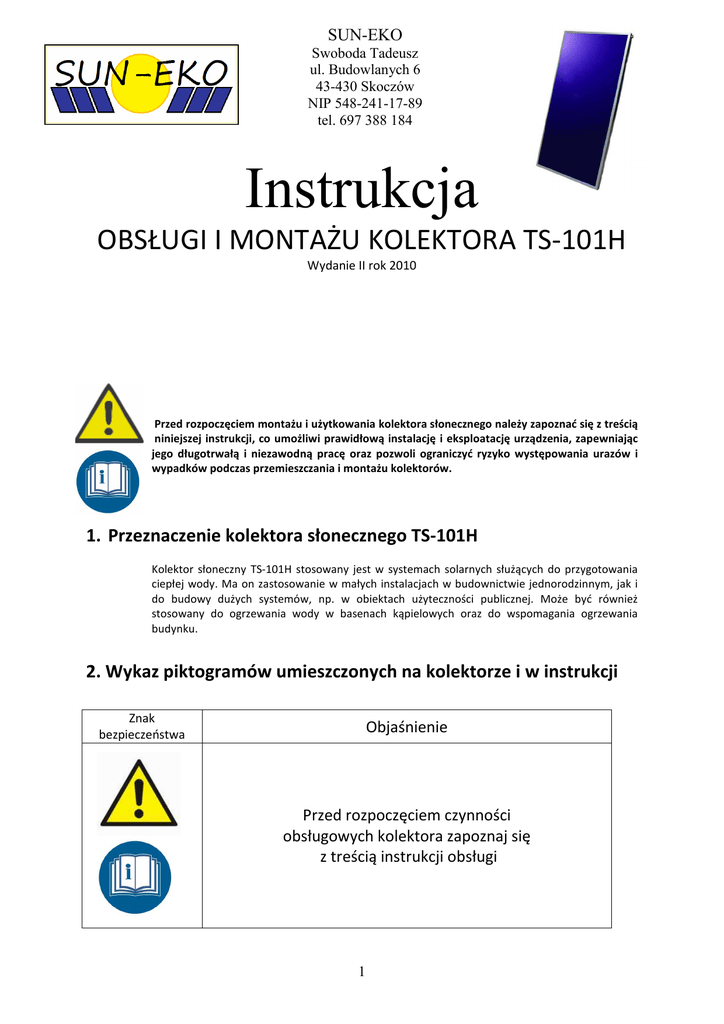 SUN-EKO Swoboda Tadeusz ul. Budowlanych 6 43-430 Skoczów NIP 548-241-17-89 tel. 697 388 184 Instrukcja OBSŁUGI I MONTAŻU KOLEKTORA TS-101H Wydanie II rok 2010 Przed rozpoczęciem montażu i użytkowania kolektora słonecznego należy zapoznać się z treścią niniejszej instrukcji, co umożliwi prawidłową instalację i eksploatację urządzenia, zapewniając jego długotrwałą i niezawodną pracę oraz pozwoli ograniczyć ryzyko występowania urazów i wypadków podczas przemieszczania i montażu kolektorów. 1. Przeznaczenie kolektora słonecznego TS-101H Kolektor słoneczny TS-101H stosowany jest w systemach solarnych służących do przygotowania ciepłej wody. Ma on zastosowanie w małych instalacjach w budownictwie jednorodzinnym, jak i do budowy dużych systemów, np. w obiektach użyteczności publicznej. Może być również stosowany do ogrzewania wody w basenach kąpielowych oraz do wspomagania ogrzewania budynku. 2. Wykaz piktogramów umieszczonych na kolektorze i w instrukcji Znak bezpieczeństwa Objaśnienie Przed rozpoczęciem czynności obsługowych kolektora zapoznaj się z treścią instrukcji obsługi 1 Ogólny znak ostrzegawczy Ostrzeżenie przed gorącą powierzchnią Oznaczenie miejsca do chwytania przy przemieszczaniu kolektora Ostrzeżenie przed porażeniem prądem elektrycznym Użytkownik kolektora zobowiązany jest do utrzymania piktogramów w czystości i czytelności, a uszkodzone piktogramy należy wymienić na nowe. Piktogramy są do nabycia u producenta kolektora. 3. Zasady bezpieczeństwa • • • • • • • Instrukcja obsługi i montażu stanowi część składową kolektora. Kolektor należy transportować, zamontować i podłączyć do instalacji zgodnie z opisem zawartym w instrukcji montażu. Przy montażu i demontażu kolektora urządzenia podporowe, zabezpieczające i drabiny stawiać zawsze na twardym podłożu w położeniu zapewniającym bezpieczeństwo obsłudze. Przed rozpoczęciem pracy skontrolować stan kolektora i połączeń elementów składowych. Montaż kolektora musi odpowiadać miejscowym warunkom i obowiązującym zasadom techniki budowlanej i powinien być wykonany przez wykwalifikowane osoby. Przed demontażem kolektora należy odczekać, aż temperatura kolektora obniży się do temperatury przy której nie może wystąpić oparzenie palców czy dłoni, a w szczególności uważać na możliwość wylania się z kolektora gorącego płynu. Należy uwzględnić wszystkie obowiązujące przepisy krajowe, szczególnie w zakresie: dopuszczalnego obciążenia dachu prac montażowych na dachu podłączenia solarnych instalacji grzewczych prac elektrycznych wykonania instalacji odgromowych 2 • • • • • • • • • • po przeprowadzeniu prób ciśnieniowych i przepłukaniu instalacji solarnej kolektora słonecznego wodą w urządzeniu mogą pozostawać jej resztki. W związku z tym konieczne jest szybkie napełnienie instalacji płynem solarnym Przy temperaturach grożących zamarznięciem czynnika w kolektorze, nie wolno zostawić w instalacji czystej wody Podczas montażu kolektora należy zabezpieczyć szybę przed uszkodzeniem. Przy przemieszczaniu kolektora na środek transportowy przy pomocy urządzeń podnośnikowych, przebywanie osób postronnych w strefie działania jest zabronione. Kolektor należy przemieszczać przy pomocy urządzeń podnośnikowych w sposób opisany w instrukcji obsługi, chwytając za miejsca wskazane na kolektorze. Przeznaczenie kolektora: „Kolektor słoneczny służy do podgrzewania wody użytkowej, ogrzewania basenów, ogrzewania pomieszczeń lub do innych celów”. Nie wolno chodzić i stawiać ciężkich przedmiotów na powierzchni szklanej kolektora słonecznego. Instalację solarną należy napełnić wodnym roztworem glikolu propylenowego, który jest 0 odporny na zamarzanie w temperaturze wyższej niż -25 C. Podczas napełniania zachować szczególną ostrożność. Nosić odpowiednie rękawice ochronne z gumy butylowej i odpowiednią bawełnianą odzież ochronną, fartuch przedni gumowany i buty. Przy załączeniu i odłączeniu kolektora do i od urządzeń współpracujących z nim, należy zachować szczególną ostrożność (uwaga na dzieci). Uważać na ostrzeżenia przed miejscami zagniatania przy instalowaniu kolektora. Za szkody spowodowane nieprzestrzeganiem instrukcji obsługi producent nie ponosi odpowiedzialności. Znajomość instrukcji obsługi i zasad w niej opisanych może zapobiec wypadkom. Instrukcje obsługi należy wręczyć użytkownikowi instalacji, który powinien się z nią zapoznać. Na nim spoczywa obowiązek starannego przechowywania instrukcji i udostępniania jej w razie potrzeby. 4. TRANSPORT Kolektory należy transportować w oryginalnym opakowaniu producenta, zgodnie z umieszczonymi na nim znakami i zaleceniami, szybą do góry, nie rzucać, nie przewracać. Opakowane kolektory przemieszczać na środki transportu za pomocą wózków widłowych lub podnośników palet. Przechowywać w suchym miejscu. W przypadku, gdy kolektory składowane są na wolnym powietrzu, muszą być zabezpieczone przed czynnikami atmosferycznymi. Po rozpakowaniu kolektory słoneczne należy przenosić pojedynczo przez minimum dwie osoby. Kolektory można przenosić w dowolnej pozycji (w pionie lub płasko) chwytając dłońmi lub pasami transportowymi (parcianymi) za obudowę kolektora w miejscach wskazanych przez piktogramy. Nie należy stosować do przenoszenia materiałów, które mogą uszkodzić (porysować) powierzchnię kolektorów. Na miejsce montażu (na dach) kolektory należy dostarczyć podnośnikiem lub wciągając je za pomocą krążka linowego, zabezpieczając je przed upadkiem, zarysowaniem i innymi uszkodzeniami. W żadnym wypadku nie należy chwytać lub przenosić kolektorów słonecznych za króćce, gdyż może to doprowadzić do ich deformacji i uszkodzenia kolektora. 5. Ryzyko resztkowe Firma SUN-EKO bierze odpowiedzialność za wzorn
