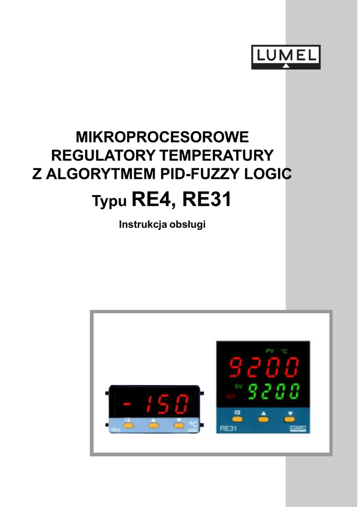 MIKROPROCESOROWE REGULATORY TEMPERATURY Z ALGORYTMEM PID-FUZZY LOGIC Typu RE4, RE31 Instrukcja obs³ugi 1 2 Lubuskie Zak³ady Aparatów Elektrycznych LUMEL S.A. MIKROPROCESOROWE REGULATORY TEMPERATURY Z ALGORYTMEM PID-FUZZY LOGIC TYP RE4, RE31 INSTRUKCJA OBS£UGI 3 SPIS TRECI 1. WPROWADZENIE ................................................................................... 3 2. MONTA¯ .................................................................................................. 3 3. POD£¥CZENIE ........................................................................................ 5 4. OBS£UGA ............................................................................................... 7 4.1. Autoadaptacja .................................................................................. 7 4.2. Rêczny dobór nastaw PID ................................................................ 8 4.3. Wywietlanie wartoci mocy wyjciowej ........................................... 9 4.4. Tryb pracy rêcznej .......................................................................... 13 4.5. Konfiguracja regulatora z wyjciem ch³odzenia .............................. 15 4.6. Ustalenie zakresu wejciowego dla sygna³ów liniowych ................. 16 4.7. Kalibracja ....................................................................................... 17 5. PROGRAMOWANIE .............................................................................. 25 5.1 Funkcje alarmów .................................................................................. 5.2 Okres impulsowwania .......................................................................... 5.3 Funkcje: nachylenia i opónienia zadzia³ania wyjcia alarmowego ..... 6. KODY WYKONAÑ I DANE TECHNICZNE ............................................ 26 7. KODY B£ÊDÓW I PRZYCZYNY WYSTÊPOWANIA ............................. 27 4 1. WPROWADZENIE Mikroprocesorowe regulatory RE4 i RE31 s¹ tablicowymi regulatorami o wskazaniach cyfrowych, przeznaczonymi do sta³owartociowej regulacji temperatury. Umo¿liwiaj¹ pomiar i wywietlanie temperatury rzeczywistej oraz wartoci zadanej lub sygna³u wyjciowego. Regulatory s¹ programowalne w zakresie dostosowania wejcia pomiarowego oraz w realizacji pozosta³ych funkcji, opisanych w tablicy 5. Zastosowany algorytm PID-Fuzzy Logic zapewnia optymalne przebiegi wielkoci regulowanej, osi¹gniêcie wartoci zadanej w najkrótszym czasie i przy minimalnych przeregulowaniach. Metoda Fuzzy Logic zapewnia przebieg procesu zgodnie z wczeniej nabytym przez uk³ad dowiadczeniem. Modu³ Fuzzy Logic ma za zadanie dobranie nastaw PID w celu szybkiego zaadaptowania sygna³u wyjciowego do parametrów obiektu. Rys. 1. Przyk³ad przebiegu regulacji PID oraz PID + Fuzzy Logic Do regulatora s¹ dostarczone w komplecie: - ramka mocuj¹ca 1 szt. - trzymacz 2 szt. - instrukcja obs³ugi 1 szt. - karta gwarancyjna 1 szt. Symbol bezpieczeñstwa u¿ywany w tekcie oznacza, ¿e nale¿y dok³adnie zapoznaæ siê z tak oznaczonymi informacjami. 5 2. MONTA¯ Przed rozpoczêciem monta¿u regulatora w tablicy nale¿y od³¹czyæ napiêcie zasilaj¹ce i wszystkie przewody od listw zaciskowych oraz zdj¹æ ramkê mocuj¹c¹ lub trzymacze. Wymiana podzespo³ów oraz wewnêtrzne nastawy musz¹ byæ przeprowadzane tylko przez wykwalifikowan¹ obs³ugê. Nie nale¿y stosowaæ regulatorów w miejscach podatnych na przypadkowe nara¿enia takie jak nadmierne wstrz¹sy, wibracje, brud, wilgotnoæ, dzia³anie korozyjne gazów lub oleju. Regulator wsuwaæ do tablicy od jej czo³a w otwór o wymiarach przedstawionych na rysunku. Po w³o¿eniu nasun¹æ na regulator, z ty³u tablicy, ramkê mocuj¹c¹ lub zamontowaæ trzymacze. RE4 RE31 Rys. 2. Wymiary gabarytowe i wymiary otworu w tablicy 6 3. POD£¥CZENIE Przed pod³¹czeniem regulatora nale¿y wykonaæ nastêpuj¹ce czynnoci: • Sprawdziæ czy opis na etykiecie zgadza siê z numerem regulatora i wybranymi opcjami. Przed sprawdzeniem od³¹czyæ napiêcie zasilaj¹ce. • Sprawdziæ czy napiêcia nominalne nie zosta³y przekroczone. • Zaleca siê, aby urz¹dzenie by³o zabezpieczone bezpiecznikami lub wy³¹cznikami. • Wszystkie ³¹czenia musz¹ byæ zgodne z odpowiednimi normami, przyjêtymi zwyczajami dobrego wykonawstwa oraz lokalnymi przepisami. Po³¹czenia musz¹ byæ dopasowane do nominalnych wartoci napiêæ, pr¹dów i temperatur panuj¹cych w systemie pomiarowym. • Uwa¿aæ, ¿eby nie zaciskaæ ze zbyt du¿¹ si³¹ rub przy³¹czeniowych. • Niepod³¹czone zaciski nie powinny byæ w ¿aden sposób wykorzystane ze wzglêdu na ich wewnêtrzne po³¹czenia. Wykorzystanie takich zacisków jako np. zwór mog³oby spowodowaæ uszkodzenie regulatora. • Sprawdziæ czy wielkoci znamionowe wspó³pracuj¹cych urz¹dzeñ zewnêtrznych nie s¹ przekroczone w stosunku do wyspecyfikowanych parametrów regulatora. • Regulator spe³nia wymagania dotycz¹ce bezpieczeñstwa obs³ugi wg normy PN-IEC 1010-1 i odpornoci na zak³ócenia wystêpuj¹ce w rodowisku przemys³owym wg normy EN 50082-2. Praktycznie wystêpuj¹ce ró¿ne ród³a zak³óceñ oddzia³uj¹ na regulator w sposób ci¹g³y lub impulsowy od strony sieci zasilaj¹cej (na skutek dzia³ania innych urz¹dzeñ) jak równie¿ nak³adaj¹ siê na sygna³ mierzony lub obwody pomocnicze regulatora. Zak³ócenia powstaj¹ równie¿ na skutek prze³¹czania obci¹¿eñ pojemnociowo-indukcyjnych przez w³asne przekaniki regulatora. W szczególnoci, du¿e zak³ócenia impulsowe s¹ grone dla dzia³ania urz¹dzenia, poniewa¿ mog¹ powodowaæ sporadyczne b³êdne wyniki pomiarów lub przypadkowe zadzia³ania alarmów, mimo zastosowania odpowiednich filtrów w regulatorze. Poziom tych zak³óceñ powinien zostaæ sprowadzony do wartoci ni¿szej od progu odpornoci regulatora, przede wszystkim poprzez odpowiedni¹ instalacjê regulatora na obiekcie. Zak³ócenia nie powinny przekraczaæ poziomów przewidzianych w normie PN - EN 50081-2. W celu