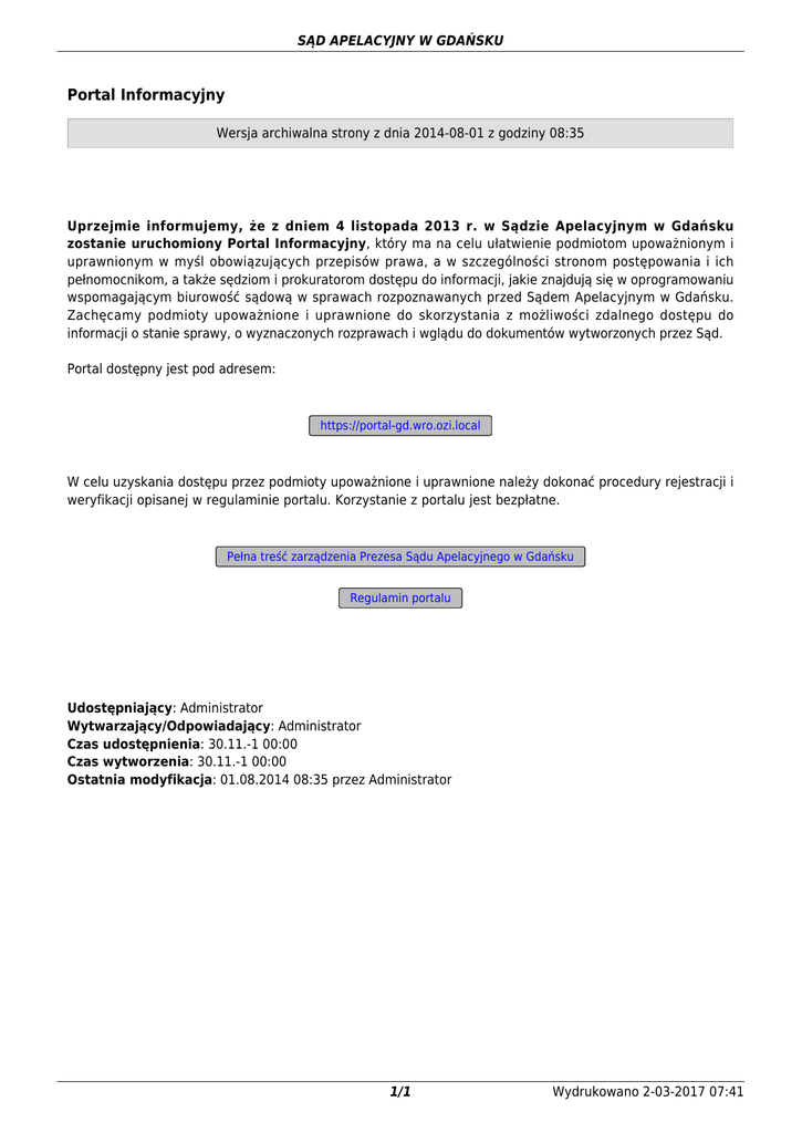 SĄD APELACYJNY W GDAŃSKU Portal Informacyjny Wersja archiwalna strony z dnia 2014-08-01 z godziny 08:35 Uprzejmie informujemy, że z dniem 4 listopada 2013 r. w Sądzie Apelacyjnym w Gdańsku zostanie uruchomiony Portal Informacyjny, który ma na celu ułatwienie podmiotom upoważnionym i uprawnionym w myśl obowiązujących przepisów prawa, a w szczególności stronom postępowania i ich pełnomocnikom, a także sędziom i prokuratorom dostępu do informacji, jakie znajdują się w oprogramowaniu wspomagającym biurowość sądową w sprawach rozpoznawanych przed Sądem Apelacyjnym w Gdańsku. Zachęcamy podmioty upoważnione i uprawnione do skorzystania z możliwości zdalnego dostępu do informacji o stanie sprawy, o wyznaczonych rozprawach i wglądu do dokumentów wytworzonych przez Sąd. Portal dostępny jest pod adresem: https://portal-gd.wro.ozi.local W celu uzyskania dostępu przez podmioty upoważnione i uprawnione należy dokonać procedury rejestracji i weryfikacji opisanej w regulaminie portalu. Korzystanie z portalu jest bezpłatne. Pełna treść zarządzenia Prezesa Sądu Apelacyjnego w Gdańsku Regulamin portalu Udostępniający: Administrator Wytwarzający/Odpowiadający: Administrator Czas udostępnienia: 30.11.-1 00:00 Czas wytworzenia: 30.11.-1 00:00 Ostatnia modyfikacja: 01.08.2014 08:35 przez Administrator 1/1 Wydrukowano 2-03-2017 07:41