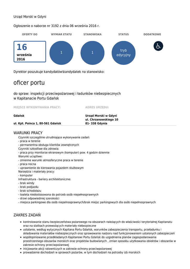 Urząd Morski w Gdyni Ogłoszenie o naborze nr 3192 z dnia 06 września 2016 r. OFERTY DO 16 września 2016 WYMIAR ETATU STANOWISKA STATUS 1 1 tryb edycyjny DODATKOWE Dyrektor poszukuje kandydatów\kandydatek na stanowisko: oficer portu do spraw: inspekcji przeciwpożarowej i ładunków niebezpiecznych w Kapitanacie Portu Gdańsk MIEJSCE WYKONYWANIA PRACY: ADRES URZĘDU: Gdańsk Urząd Morski w Gdyni ul. Chrzanowskiego 10 81- 338 Gdynia ul. Kpt. Poinca 1, 80-561 Gdańsk WARUNKI PRACY Czynniki szczególnie utrudniające wykonywanie zadań: - praca w terenie - permanentna obsługa klientów zewnętrznych Czynniki szkodliwe dla zdrowia: - praca przy monitorze ekranowym (komputer) pow. 4 godzin dziennie Warunki uciążliwe: - zmienne warunki atmosferyczne praca w terenie - praca nocna - uprawnienie do kierowania pojazdem służbowym Narzędzia i materiały pracy: - komputer Infrastruktura - bariery architektoniczne: - brak windy - brak podjazdu - brak schodołazu - toaleta niedostosowana do potrzeb osób niepełnosprawnych - drzwi odpowiedniej szerokości - miejsca parkingowe dla osób niepełnosprawnych/brak miejsc parkingowych dla osób niepełnosprawnych ZAKRES ZADAŃ kontrolowanie stanu bezpieczeństwa pożarowego na obszarach należących do właściwości terytorialnej Kapitanatu oraz na statkach przewożących materiały niebezpieczne ustalanie, według wytycznych Kapitana Portu Gdańsk, warunków zabezpieczenia transportu, przeładunku i składowania materiałów niebezpiecznych oraz sprawowanie nadzoru nad funkcjonowaniem ustalonych zabezpieczeń współopiniowanie przedkładanych Kapitanowi Portu Gdańsk do uzgodnienia planów zagospodarowania przestrzennego obszarów morskich oraz projektów budowlanych , zmian sposobu użytkowania obiektów i obszarów w zakresie ochrony przeciwpożarowej inicjowanie akcji ratowniczych w zakresie ochrony przeciwpożarowej prowadzenie dochodzeń w sprawach pożarów, w tym dochodzeń na potrzeby izb morskich WYMAGANIA NIEZBĘDNE Wykształcenie: wyższe doświadczenie zawodowe: 2 lata doświadczenia zawodowego - morskiego dyplom na poziomie operacyjnym w dziale pokładowym komunikatywna znajomość języka angielskiego umiejętność pracy w zespole umiejętność działania w sytuacjach stresowych Posiadanie obywatelstwa polskiego Korzystanie z pełni praw publicznych Nieskazanie prawomocnym wyrokiem za umyślne przestępstwo lub umyśle przestępstwo skarbowe WYMAGANIA DODATKOWE doświadczenie zawodowe: 1 rok w pracy w danym obszarze (ochrona przeciwpożarowa portów morskich) prawo jazdy kat. B uprawnienia do przeprowadzania kontroli z zakresu ochrony przeciwpożarowej DOKUMENTY I OŚWIADCZENIA NIEZBĘDNE Życiorys/CV i list motywacyjny Kopie dokumentów potwierdzających spełnienie wymagania niezbędnego w zakresie wykształcenia Kopie dokumentów potwierdzających spełnienie wymagania niezbędnego w zakresie doświadczenia zawodowego / stażu pracy dyplom na poziomie operacyjnym w dziale pokładowym Oświadczenie o posiadaniu obywatelstwa polskiego albo kopia dokumentu potwierdzającego posiadanie polskiego obywatelstwa Oświadczenie o wyrażeniu zgody na przetwarzanie danych osobowych do celów naboru Oświadczenie o korzystaniu z pełni praw publicznych Oświadczenie o nieskazaniu prawomocnym wyrokiem za umyślne przestępstwo lub umyślne przestępstwo skarbowe DOKUMENTY I OŚWIADCZENIA DODATKOWE kopia dokumentu potwierdzającego niepełnosprawność - w przypadku kandydatek/kandydatów, zamierzających skorzystać z pierwszeństwa w zatrudnieniu w przypadku, gdy znajdą się w gronie najlepszych kandydatek/kandydatów Kopie dokumentów potwierdzających spełnienie wymagania dodatkowego w zakresie doświadczenia zawodowego / stażu pracy prawo jazdy kat. B TERMINY I MIEJSCE SKŁADANIA DOKUMENTÓW Dokumenty należy złożyć do: 16 września 2016 r. Decyduje data: stempla pocztowego / osobistego dostarczenia oferty do urzędu Miejsce składania dokumentów: Urząd Morski w Gdyni Kancelaria Ogólna ul. Chrzanowskiego 10 81- 338 Gdynia z dopiskiem: Nr ogłoszenia o naborze - ………………… INNE INFORMACJE: W miesiącu poprzedzającym datę upublicznienia ogłoszenia wskaźnik zatrudnienia osób niepełnosprawnych w urzędzie, w rozumieniu przepisów o rehabilitacji zawodowej i społecznej oraz zatrudnianiu osób niepełnosprawnych, nie wynosi co najmniej 6%. • oferty niekompletne, w tym brak własnoręcznie podpisanych listu motywacyjnego i wymaganych oświadczeń oraz złożone po terminie nie będą rozpatrywane (decyduje data stempla pocztowego), • Urząd poinformuje osoby, które zakwalifikowały się do poszczególnych etapów naboru telefoniczne lub drogą elektroniczną, a brak kontaktu jest równoznaczny z niezakwalifikowaniem kandydata do dalszych etapów naboru, • aplikacje odrzucone zostaną komisyjnie zniszczone, • proponowane wynagrodzenie zasadnicze brutto 3 003,77 zł • do składania ofert zachęcamy również osoby niepełnosprawne, które spełniają wymagania określone w ogłoszeniu • dodatkowe informacje można uzyskać pod nr. tel. : 58 343 17 64 lub 58 355 31 72. Legenda Pierwszeństwo dla osób z niepełnosprawnościami Ogłoszenie z tym symbolem oznacza, że pierwszeństwo w zatrudnieniu mają osoby z niepełnosprawnościami, które spełniają wszystkie następujące warunki: • złożyły w terminie ofertę wraz z dokumentem potwierdzającym niepełnosprawność, • spełniają warunki wymienione w ogłoszeniu, • po rekrutacji znalazły się w gronie najlepszych kandydatów. Zastępstwo Ogłoszenie z tym symbolem oznacza, że urząd poszukuje kandydatów do pracy na czas przewidywanej nieobecności swojego pracownika. Jeśli w ogłoszeniu nie wskazano okresu zastępstwa, możesz o to spytać w urzędzie. Osoba zatrudniona na zastępstwo jest członkiem korpusu służby cywilnej. Nabór otwarty dla cudzoziemców Ogłoszenie z tym symbolem oznacza, że o stanowisko mogą starać się, poza pols