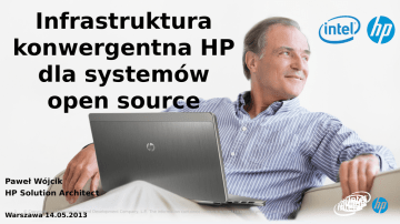 Infrastruktura konwergentna HP dla systemów open source Paweł Wójcik HP Solution Architect 1 © Copyright 2012 Hewlett-Packard Development Company, L.P. The information contained herein is subject to change without notice. Warszawa 14.05.2013 Rosnące wymagania 2013 416,340 nowych wiadomości na Twitterze 23,148 pobrań aplikacji Rosnący „internet przedmiotów” 400,710 odwołań do reklam on-line 60 seku nd Mobile Apps 2000 utworów granych na Tunewiki 208,333 minut spędzonych na Angry Birds 30 miliard Devicesów (1) 40 trylionów(2) GB Today 1,500 wiadomości na PingMe a w 2020 … Wszystko połączone Ekspansja urządzeń „Smart” Eksplozja informacji Potrzebujemy nowego IT dla nowych czasów … dla 8 miliard (4) ów (1) IDC Directions 2013: Why the Datacenter of the Future Will Leverage a Converged Infrastructure, March 2013, Matt Eastwood ; (2) & (3) IDC Predictions 2012: Competing for 2020, Document 231720, December 2011, Frank Gens; (4) http://en.wikipedia.org © Copyright 2012 Hewlett-Packard Development Company, L.P. The information contained herein is subject to change without notice. DATA 10 (3) milion ów Nowe zjawiska wymuszają konieczność zmian w zakresie IT Skala Miliony aplikacji mialiardy urządzeń i użytkowników 3 Szybkość Specjalizacja Adaptacja do aktualnych potrzeb biznesu w celu uzyskania przewagi rynkowej Dopasowane i zoptymalizowane do specyficznych potrzeb i charakterystyki obciążenia © Copyright 2012 Hewlett-Packard Development Company, L.P. The information contained herein is subject to change without notice. Infrastruktura Konwergentna 4 © Copyright 2012 Hewlett-Packard Development Company, L.P. The information contained herein is subject to change without notice. Infrastruktura Konwergentna Zasilanie & klimatyzacja Converged Infrastructure Zarządzanie 5 Macierze Dyskowe Serwery Sieć LAN © Copyright 2012 Hewlett-Packard Development Company, L.P. The information contained herein is subject to change without notice. Model referencyjny HP Infrastruktury konwergentnej Środowisko operacyjne infrastruktury, zarządzanie infrastrukturą jako usługą Dynamiczne połączenia sieciowe, efektywna sieć dynamicznych połaczeń 6 Zwirtualizowane uniwersalne zasoby, moc obliczeniowa, pamięć masowa, sieć Inteligentne zarządzanie środowiskiem centrum danych (energia el. ; temperatura) © Copyright 2012 Hewlett-Packard Development Company, L.P. The information contained herein is subject to change without notice. Pełna gama serwerów z rodziny x86 zoptymalizowane, zaprojektowane pod każde potrzeby High-end Scale-up Data-intensive Scale-up Mainstream x86 2-socket offerings for variety of general purpose workloads Up to 4-socket offerings for data-demanding workloads Up to 8-socket offerings for largest enterprise workloads HP ProLiant DL980 HP ProLiant DL300 and BL400c 7 HP ProLiant DL500 and BL600c For your most demanding x86 workloads © Copyright 2012 Hewlett-Packard Development Company, L.P. The information contained herein is subject to change without notice. Serwery HP ProLiant ML i DL GEN8 Wybierz odpowiedni produkt Wydjność p-Series 300 Series DL560 GEN8 DL380p e-Series ML350p DL380e DL360p ML350e DL360e Cena 8 DL580 G7 © Copyright 2012 Hewlett-Packard Development Company, L.P. The information contained herein is subject to change without notice. 500 Series HP BladeSystem – elastyczna platforma CloudSyste m Matrix Serwery HP Integrity ProLiant Serwery Obudowy c7000 c3000 2 s 4s 8s Superdome 2 enclosure Superdome cell blade c7000 c3000 x86 9 2-64s © Copyright 2012 Hewlett-Packard Development Company, L.P. The information contained herein is subject to change without notice. Zasilanie i klimatyzacja – Green IT HP Insight Control Sea of Sensors 3D Pooled Cooling Active Cool Fans Power Regulator Dynamic Power Saver 10 Group Dynamic Power Capping © Copyright 2012 Hewlett-Packard Development Company, L.P. The information contained herein is subject to change without notice. For HP internal and partner use only Pooled Power Platinum Power Supplies Nowe spojrzenie NoN na serwery czyli HP Project Nowespojrzenie Moonshot na we czyli 11 © Copyright 2012 Hewlett-Packard Development Company, L.P. The information contained herein is subject to change without notice. Pierwsi mają najlepsze ... Definiowanie standardów rynkowych Proven HP engineerin g x86 SystemPro x86 Rac k ProLiant x86 Blade BladeSystem Wiodące partnerstwo 12 © Copyright 2012 Hewlett-Packard Development Company, L.P. The information contained herein is subject to change without notice. Softwa re Define d Server Moonshot #1 To nie tylko nowy serwer Ekosystem rozwiązań Partnerzy technologiczni Wsparcie rozwiązania 3x krótszy cykl zmiany Launch Solutions referencyj na Eksperc i Społeczność Optimize Server 13 HP Discovery Lab Architekt ura Customer Need Analyze Application Łatwość wdrożenia © Copyright 2012 Hewlett-Packard Development Company, L.P. The information contained herein is subject to change without notice. Service & Consultin g $ Programy finansowe Generalne korzyści technologii Moonshot Dedykowane serwery 1P 1U HP Moonshot System 80% mniej przestrzeni 89% mniej energii 97% mniej kabli 42U 40 x HP ProLiant DL360p / szafę 200x HP ProLiant DL360p 77% Koszt utrzymania 4.3U 5x HP Moonshot Chassis 200x serwerów HP ProLiant Moonshot *Source: Compared to HP ProLiant DL360p server based on estimates including infrastructure, space, power and cooling costs over three years. List©pricing is used comparisonDevelopment and relativeCompany, performance ratio for x86 contained server and Moonshot cartridge is without 1:1 based on internal HP tests for Copyright 2012 for Hewlett-Packard L.P. The information herein is subject to change notice. 14 dedicated hosting workloads HP Moonshot System Pierwszy na świecie serwer specjalizowany HP Moonshot 1500 Chassis Komponenty współdzielone: Zasilanie, chłodzenie, zarządzanie, komunikacja Serwery 45 niezależnie se