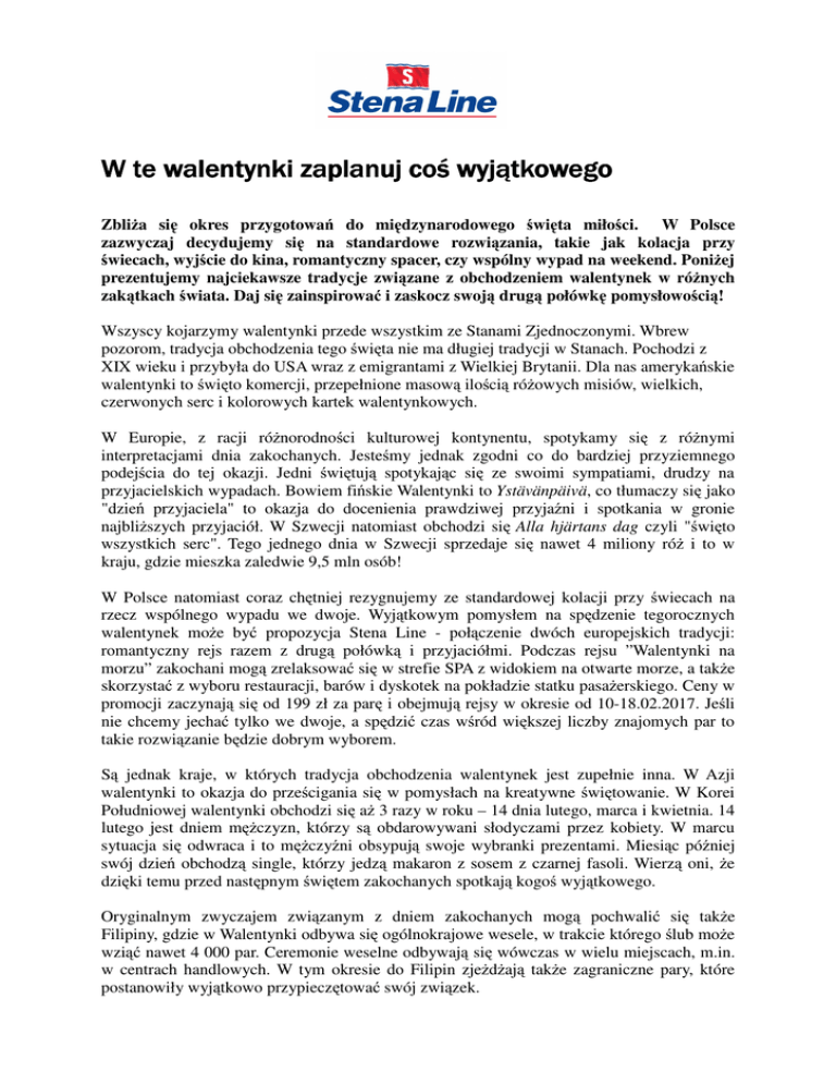 W te walentynki zaplanuj coś wyjątkowego Zbliża się okres przygotowań do międzynarodowego święta miłości. W Polsce zazwyczaj decydujemy się na standardowe rozwiązania, takie jak kolacja przy świecach, wyjście do kina, romantyczny spacer, czy wspólny wypad na weekend. Poniżej prezentujemy najciekawsze tradycje związane z obchodzeniem walentynek w różnych zakątkach świata. Daj się zainspirować i zaskocz swoją drugą połówkę pomysłowością! Wszyscy kojarzymy walentynki przede wszystkim ze Stanami Zjednoczonymi. Wbrew pozorom, tradycja obchodzenia tego święta nie ma długiej tradycji w Stanach. Pochodzi z XIX wieku i przybyła do USA wraz z emigrantami z Wielkiej Brytanii. Dla nas amerykańskie walentynki to święto komercji, przepełnione masową ilością różowych misiów, wielkich, czerwonych serc i kolorowych kartek walentynkowych. W Europie, z racji różnorodności kulturowej kontynentu, spotykamy się z różnymi interpretacjami dnia zakochanych. Jesteśmy jednak zgodni co do bardziej przyziemnego podejścia do tej okazji. Jedni świętują spotykając się ze swoimi sympatiami, drudzy na przyjacielskich wypadach. Bowiem fińskie Walentynki to Ystävänpäivä, co tłumaczy się jako "dzień przyjaciela" to okazja do docenienia prawdziwej przyjaźni i spotkania w gronie najbliższych przyjaciół. W Szwecji natomiast obchodzi się Alla hjärtans dag czyli "święto wszystkich serc". Tego jednego dnia w Szwecji sprzedaje się nawet 4 miliony róż i to w kraju, gdzie mieszka zaledwie 9,5 mln osób! W Polsce natomiast coraz chętniej rezygnujemy ze standardowej kolacji przy świecach na rzecz wspólnego wypadu we dwoje. Wyjątkowym pomysłem na spędzenie tegorocznych walentynek może być propozycja Stena Line - połączenie dwóch europejskich tradycji: romantyczny rejs razem z drugą połówką i przyjaciółmi. Podczas rejsu ”Walentynki na morzu” zakochani mogą zrelaksować się w strefie SPA z widokiem na otwarte morze, a także skorzystać z wyboru restauracji, barów i dyskotek na pokładzie statku pasażerskiego. Ceny w promocji zaczynają się od 199 zł za parę i obejmują rejsy w okresie od 10-18.02.2017. Jeśli nie chcemy jechać tylko we dwoje, a spędzić czas wśród większej liczby znajomych par to takie rozwiązanie będzie dobrym wyborem. Są jednak kraje, w których tradycja obchodzenia walentynek jest zupełnie inna. W Azji walentynki to okazja do prześcigania się w pomysłach na kreatywne świętowanie. W Korei Południowej walentynki obchodzi się aż 3 razy w roku – 14 dnia lutego, marca i kwietnia. 14 lutego jest dniem mężczyzn, którzy są obdarowywani słodyczami przez kobiety. W marcu sytuacja się odwraca i to mężczyźni obsypują swoje wybranki prezentami. Miesiąc później swój dzień obchodzą single, którzy jedzą makaron z sosem z czarnej fasoli. Wierzą oni, że dzięki temu przed następnym świętem zakochanych spotkają kogoś wyjątkowego. Oryginalnym zwyczajem związanym z dniem zakochanych mogą pochwalić się także Filipiny, gdzie w Walentynki odbywa się ogólnokrajowe wesele, w trakcie którego ślub może wziąć nawet 4 000 par. Ceremonie weselne odbywają się wówczas w wielu miejscach, m.in. w centrach handlowych. W tym okresie do Filipin zjeżdżają także zagraniczne pary, które postanowiły wyjątkowo przypieczętować swój związek. W Tajlandii natomiast każdego roku odbywa się konkurs na najdłuższy pocałunek, a wynik zwycięzców trafia do księgi rekordów Guinnessa. Aktualny rekord to 58 godzin, 35 minut i 58 sekund, który należy do pary z Bangkoku. Wypłyń w rejs walentynkowy ! REJS WALENTYNKI NA MORZU ze Stena Line Cena od 199 zł 99 zł na osobę zawiera: ● podróż promem do Szwecji i z powrotem; ● nocleg w kabinie 2-osobowej Comfort Class z łazienką; ● rozrywkę na statku (min. dyskoteka). Trochę więcej o Stena Line Stena Line jest szwedzkim koncernem promowym, z siedzibą w Göteborgu. Operuje na 20 trasach łączących 10 krajów, posiada 35 promów, zatrudnia ponad 5000 pracowników. Roczne obroty koncernu przekraczają 12 mld koron szwedzkich. Przewozy wynoszą rocznie: ponad 7 mln pasażerów, 1,5 mln samochodów osobowych oraz 2 mln jednostek frachtowych (ciężarówki, naczepy itp.). W Polsce Stena Line jest obecna od dwóch dekad. Promy z charakterystycznym czerwonym kominem łączą Gdynię z Karlskroną w południowej Szwecji. Co roku tę trasę przemierza około pół miliona pasażerów, korzystając z jednego z dwóch bliźniaczych statków: Stena Vision i Stena Spirit. Trzeci statek na linii, Stena Baltica, jest przeznaczony głównie do przewozu ładunków. Stena Line jest częścią grupy Stena Sphere należącej do rodziny Olsson. Poza przewozami promowymi, grupa zajmuje się m.in. żeglugą, wydobyciem ropy naftowej, recyklingiem, obrotem nieruchomościami. Obroty całej grupy Stena Sphere sięgają 58 mld koron szwedzkich rocznie. Stena Sphere zatrudnia 19 000 pracowników na całym świecie. 2