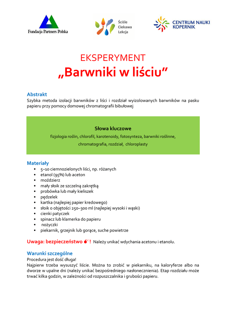 EKSPERYMENT „Barwniki w liściu” Abstrakt Szybka metoda izolacji barwników z liści i rozdział wyizolowanych barwników na pasku papieru przy pomocy domowej chromatografii bibułowej Słowa kluczowe fizjologia roślin, chlorofil, karotenoidy, fotosynteza, barwniki roślinne, chromatografia, rozdział, chloroplasty Materiały • • • • • • • • • • • • 5–10 ciemnozielonych liści, np. różanych etanol (95%) lub aceton moździerz mały słoik ze szczelną zakrętką probówka lub mały kieliszek pędzelek kartka (najlepiej papier kredowego) słoik o objętości 250–300 ml (najlepiej wysoki i wąski) cienki patyczek spinacz lub klamerka do papieru nożyczki piekarnik, grzejnik lub gorące, suche powietrze Uwaga: bezpieczeństwo ! Należy unikać wdychania acetonu i etanolu. Warunki szczególne Procedura jest dość długa! Najpierw trzeba wysuszyć liście. Można to zrobić w piekarniku, na kaloryferze albo na dworze w upalne dni (należy unikać bezpośredniego nasłonecznienia). Etap rozdziału może trwać kilka godzin, w zależności od rozpuszczalnika i grubości papieru. Wykonanie Z liści usuń ogonki i twarde włókna przewodzące z blaszki liściowej. Włóż liście do piekarnika i susz je w temperaturze ok. 110oC, aż staną się kruche (ok. 20 minut). Zmiażdż liście w moździerzu na drobny proszek. Wsyp proszek do małego słoiczka, zalej jak najmniejszą ilością etanolu lub acetonu, wystarczającą jednak, żeby w słoiku powstała zawiesina. Słoiczek zakręć i bardzo energicznie wstrząsaj nim przez kilka minut. Zlej zielony płyn znad większych resztek roślinnych do probówki i odstaw na ok. 20 minut. Gdy drobna zawiesina opadnie na dno, płyn znad osadu bardzo delikatnie zlej do innego naczynka. Z papieru wytnij pasek o szerokości ok. 2 cm i długości ok. 9 cm (długość papierka dostosuj do wysokości słoika przygotowanego do użycia w dalszych etapach doświadczenia). W odległości ok. 1–2 cm od dołu paska nanieś cienkim pędzelkiem niewielką ilość rozpuszczonego barwnika, rysując dość grubą, poprzeczną kreskę. Na dno słoika nalej etanolu lub acetonu na wysokość ok. 1 cm. Pasek papieru zamocuj na spinaczu (po przeciwnej stronie niż kreska) i zawieś na drewnianym patyczku. Patyczek połóż na brzegach słoika z etanolem, wprowadzając pasek do środka. Końcówka paska ma zanurzyć się w płynie, ale kreska barwnika nie może dotykać jego powierzchni. Odstaw słoik na kilka godzin i co pewien czas obserwuj, co się dzieje. Rozpuszczalnik wędruje w górę paska, „zabierając” ze sobą barwniki wyizolowane z liści. Po pewnym czasie barwniki rozdzielają się – pojawiają się charakterystyczne prążki, jeden z nich jest żółty. Wytłumaczenie W liściach występują różne barwniki. Przede wszystkim jest to chlorofil, który uczestniczy w procesie fotosyntezy. Chlorofil zgromadzony jest w chloroplastach, zagłębiony w błonach wewnętrznych tych organelli komórkowych. Chlorofil pochłania przede wszystkim światło o barwie czerwonej i niebieskiej, nie pochłania zaś światła o barwie zielonej, które jest odbijane – i dlatego widoczne. Oprócz zielonych chlorofili (których jest kilka rodzajów, u roślin wyższych – a i b) w liściach znajdują się inne barwniki, karotenoidy: pomarańczowe i czerwone karoteny oraz żółte i brązowe ksantofile. Karotenoidy pełnią funkcję wspomagającą w procesie fotosyntezy. Doświadczenie pozwala przekonać się, że zielony barwnik tylko „maskuje” obecność pozostałych barwników – na pasku papieru po pewnym czasie, obok zielonego, pojawia się żółty prążek. Obecność innych barwników w liściach w strefie klimatu umiarkowanego najlepiej widać jesienią, kiedy rośliny „wycofują” bardzo cenny chlorofil z przeznaczonych na straty liści do łodyg i korzeni. Wymienione barwniki roślinne są słabo rozpuszczalne w wodzie, dlatego do wydobycia ich z pofragmentowanych tkanek używa się alkoholu lub acetonu. Zastosowana metoda rozdziału jest odpowiednikiem klasycznej metody rozdziału substancji używanej w badaniach naukowych, zwanej chromatografią. W metodzie tej substancje rozdziela się dzięki działaniu dwóch faz rozdzielających, ruchomej i nieruchomej. Fazą ruchomą mogą być płyny o różnych cechach chemicznych (rozpuszczalnik zwany eluentem) lub gazy, fazą nieruchomą – np. papier lub cienka warstwa substancji o ziarnistej strukturze. Substancje przenoszone są przez rozpuszczalnik poruszający się w fazie nieruchomej, tak jak w opisanym wyżej doświadczeniu, gdzie etanol z rozpuszczonymi barwnikami „wędruje” w górę paska papieru. Cząsteczki rozdzielanych związków różnią się wielkością, przez co prędkość ich poruszania się w fazie nieruchomej jest inna – małe cząsteczki przesuwają się szybko, duże – powoli. Po pewnym czasie rozdzielają się i widać je jako prążki. Alternatywy Warto wypróbować różne rozpuszczalniki (np. dodać parę kropli płynu do mycia szyb) i różne rodzaje papieru. Rozwiązywanie problemów Powodzenie doświadczenia zależy przede wszystkim wszystkim od rodzaju papieru. Powinien on mieć jak najbardziej uporządkowaną strukturę i dość zwięzłą. W innym przypadku rozdział może się nie udać. Lepiej zastosować papier nieco grubszy niż zwykła kartka papieru. Czasami prążki są pofałdowane, czego przyczyną przyczyną może być niejednolita struktura papieru i krótki czas rozdziału. Jeżeli roztwór barwnika jest zbyt rozcieńczony, można go zagęścić, ogrzewając próbkę (parowanie etanolu spowoduje zagęszczanie próbki) lub po prostu trochę odczekać. Można też nanieść barwnik rwnik na pasek papieru kilka razy, za każdym razem czekając aż wyschnie. Naniesiony pędzelkiem prążek barwnika nie powinien być zbyt szeroki. Materiały wypracowane w ramach kolejnych edycji programu „Ściśle ciekawa lekcja” współfinansow