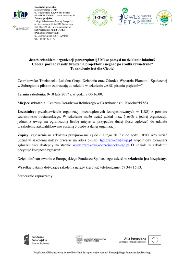 Realizator projektu: Stowarzyszenie ETAP ul. Wachowiaka 8A, 60-681 Poznań tel. +48 61 656 99 71, www.owesetap.pl Partner projektu: Usługi Szkoleniowe Maciej Perzyński ul. Kasztanowa 51, 64-930 Dolaszewo Tel. 606-374-261, www.owesetap.pl Subregionalny Punkt OWES (Punkt Informacyjny): ul. Dąbrowskiego 8, 64 - 920 Piła tel. +48 514 636 170 Jesteś członkiem organizacji pozarządowej? Masz pomysł na działanie lokalne? Chcesz poznać zasady tworzenia projektów i sięgnąć po środki zewnętrzne? To szkolenie jest dla Ciebie! Czarnkowsko-Trzcianecka Lokalna Grupa Działania oraz Ośrodek Wsparcia Ekonomii Społecznej w Subregionie pilskim zapraszają do udziału w szkoleniu „ABC pisania projektów”. Termin szkolenia: 9-10 luty 2017 r. w godz. 8:00-16:00. Miejsce szkolenia: Centrum Doradztwa Rolniczego w Czarnkowie (ul. Kościuszki 88). Uczestnicy: przedstawiciele organizacji pozarządowych (zarejestrowanych w KRS) z powiatu czarnkowsko-trzcianeckiego. W szkoleniu może wziąć udział max. 5 osób z jednej organizacji, jednak z uwagi na ograniczoną liczbę miejsc w przypadku dużej ilości zgłoszeń do udziału w szkoleniu zakwalifikowane zostaną 3 osoby z danej organizacji. Zapisy: zgłoszenia na szkolenia przyjmowane są do 6 lutego 2017 r. do godz. 10:00. Aby wziąć udział w szkoleniu należy przesłać na adres e-mail: [email protected] wypełniony formularz zgłoszeniowy dostępny na stronie www.czarnkowsko-trzcianecka-lgd.pl O udziale w szkoleniu decyduje kolejność zgłoszeń! Dzięki dofinansowaniu z Europejskiego Funduszu Społecznego udział w szkoleniu jest bezpłatny. Wszelkie pytania dotyczące szkolenia należy kierować telefonicznie: 67 344 16 53. Serdecznie zapraszamy! Projekt współfinansowany ze środków Unii Europejskiej w ramach Europejskiego Funduszu Społecznego