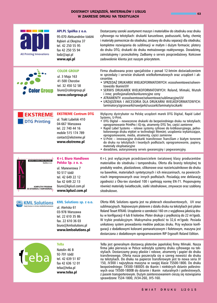 Dostawcy urządzeń, materiałów i usług w zakresie druku na tekstyliach API.PL Spółka z o.o. 95-070 Aleksandrów Łódzki Rąbień ul.Okrężna 37 tel. 42 250 55 95 fax 42 250 55 94 [email protected] www.api.pl COLOR GROUP ul. 3 Maja 163 41-500 Chorzów tel. 32 450 52 58 [email protected] www.colorgroup.pl EKSTREME Centrum DTG ul. Trakt Lubelski 410 04-667 Warszawa tel. 22 740 44 16 mobile 515 174 789 [email protected] www.ekstreme.pl K+L Biuro Handlowe Polska Sp. z o. o. ul. Manewrowa 7 92-517 Łódź tel. 42 649 22 12 fax 42 649 22 13 [email protected] www.kplusl.com.pl KML Solutions sp. z o.o. ul. Ateńska 61 03-978 Warszawa tel. 22 610 35 86 fax. 22 610 36 03 [email protected] www.kmlsolutions.pl TeBa Natolin 46 B 92-701 Łódź tel. 42 639 51 87 fax 42 636 12 01 [email protected] www.teba.pl 63 Dostarczamy szeroki asortyment maszyn i materiałów do sitodruku oraz druku cyfrowego na tekstyliach: drukarki karuzelowe, podsuszarki, farby, chemię i materiały pomocnicze do sitodruku; zestawy do druku separacji dla sitodruku; kompletne rozwiązania do sublimacji w małym i dużym formacie; plotery do druku DTG; drukarki do druku metrażowego reaktywnego. Doradzimy, zainstalujemy i przeszkolimy. Zadbamy o serwis posprzedażowy. Końcowe zadowolenie klienta jest naszym priorytetem. Firma zbudowana przez specjalistów z ponad 12-letnim doświadczeniem w sprzedaży i serwisie drukarek wielkoformatowych oraz urządzeń i akcesoriów. •SPRZEDAŻ DRUKAREK WIELKOFORMATOWYCH: ecosolwentowe/solwentowe/do tkanin/UV •SERWIS DRUKAREK WIELKOFORMATOWYCH: Roland, Mimaki, Mutoh i inne; profesjonalizm/konkurencyjne ceny •ATRAMENTY: ecosolwentowe/solwentowe/sublimacyjne/UV •URZĄDZENIA I AKCESORIA DLA DRUKARNI WIELKOFORMATOWYCH: laminatory/zgrzewarki/nawijarki/suszarki/laminaty/oczkarki Wyłączny dystrybutor na Polskę urządzeń marek DTG Digital, Rapid Label Systems, U-Print. • DTG Digital – nowoczesne drukarki do bezpośredniego druku na tekstyliach; oprogramowanie PrintPro i IQ-rip, atramenty DTG Tex, części zamienne • Rapid Label Systems – rolowe systemy cyfrowe do krótkoseryjnego, pełnokolorowego druku etykiet w technologii MemJet; urządzenia wykańczające, oprogramowanie, media, atramenty, części zamienne • U-Print – innowacyjne drukarki transferowe TransSlam z białym tonerem do druku na tekstyliach i twardych podłożach; oprogramowanie, papiery, materiały eksploatacyjne • doradztwo, autoryzowany serwis gwarancyjny i pogwarancyjny. K+L jest wyłącznym przedstawicielem światowej klasy producentów materiałów do sitodruku i tampondruku. Oferta dla branży tekstylnej to produkty wodne, plastizolowe, silikonowe oraz rozcieńczalnikowe do druku na bawełnie, materiałach syntetycznych i ich mieszaninach, na powierzchniach impregnowanych oraz innych podłożach. Posiadają one deklarację zgodności z Öko-tex standard 100 i spełniają normę EN-71. Proponujemy również materiały światłoczułe, siatki sitodrukowe, zmywacze oraz szablony sitodrukowe. Oferta KML Solutions oparta jest na ploterach ekosolwentowych, UV oraz sublimacyjnych. Najnowszym ploterem z działu druku na tekstyliach jest ploter Roland Texart RT640. Urządzenie o szerokości 160 cm z wyjątkowa jakością druku w konfiguracji 4 lub 8 kolorów. Ploter drukuje z prędkością do 22 m2/godz. W trybie produkcyjnym. Maksymalna prędkość to 32,6 m2/godz. Posiada unikatowy system prowadzenia mediów podczas druku. Przy wyborze konfiguracji z dodatkowymi kolorami pomarańczowym i fioletowym, maszyna jest dostarczana z dodatkowym oprogramowaniem RIP Ergosoft Roland Edition. TeBa jest generalnym dostawcą ploterów japońskiej firmy Mimaki. Nasza firma jako pierwsza w Polsce wdrożyła systemy druku cyfrowego na tekstyliach. Dostarczamy prasy płaskie i rolowe, atramenty i papier do druku transferowego. Oferta nasza poszerzyła się o szereg nowości do druku na tekstyliach. Do druku na papierze transferowym jest to nowa seria JV 150, JV300 i najszybsza maszyna w swojej klasie TS500-1800. Do druku bezpośredniego: TX500-1800DS do tkanin i niektórych dzianin poliestrowych oraz TX500-1800B do dzianin i tkanin naturalnych i poliestrowych, z pasem transporterowym. Dużym zainteresowaniem cieszą się rozwiązania sprawdzone TS34-1800, JV34-260, JV5-160. ś W I A T D R U K U 1/2 0 1 5