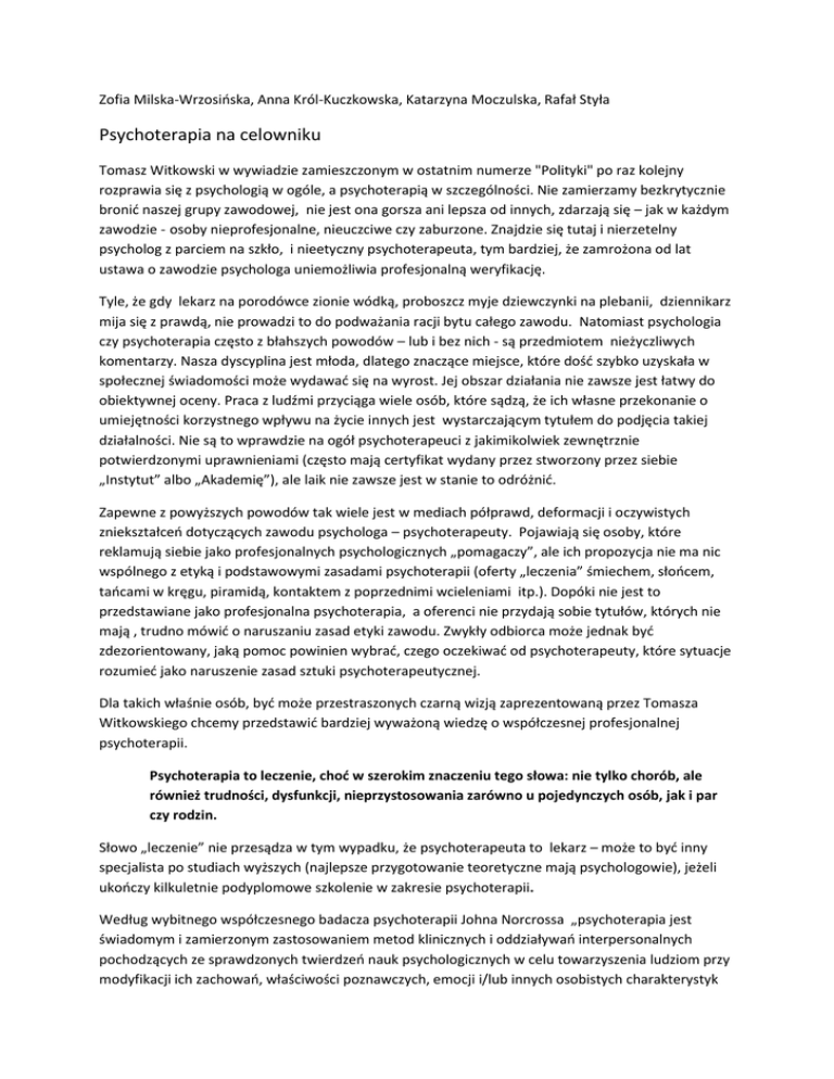 Zofia Milska-Wrzosińska, Anna Król-Kuczkowska, Katarzyna Moczulska, Rafał Styła Psychoterapia na celowniku Tomasz Witkowski w wywiadzie zamieszczonym w ostatnim numerze "Polityki" po raz kolejny rozprawia się z psychologią w ogóle, a psychoterapią w szczególności. Nie zamierzamy bezkrytycznie bronić naszej grupy zawodowej, nie jest ona gorsza ani lepsza od innych, zdarzają się – jak w każdym zawodzie - osoby nieprofesjonalne, nieuczciwe czy zaburzone. Znajdzie się tutaj i nierzetelny psycholog z parciem na szkło, i nieetyczny psychoterapeuta, tym bardziej, że zamrożona od lat ustawa o zawodzie psychologa uniemożliwia profesjonalną weryfikację. Tyle, że gdy lekarz na porodówce zionie wódką, proboszcz myje dziewczynki na plebanii, dziennikarz mija się z prawdą, nie prowadzi to do podważania racji bytu całego zawodu. Natomiast psychologia czy psychoterapia często z błahszych powodów – lub i bez nich - są przedmiotem nieżyczliwych komentarzy. Nasza dyscyplina jest młoda, dlatego znaczące miejsce, które dość szybko uzyskała w społecznej świadomości może wydawać się na wyrost. Jej obszar działania nie zawsze jest łatwy do obiektywnej oceny. Praca z ludźmi przyciąga wiele osób, które sądzą, że ich własne przekonanie o umiejętności korzystnego wpływu na życie innych jest wystarczającym tytułem do podjęcia takiej działalności. Nie są to wprawdzie na ogół psychoterapeuci z jakimikolwiek zewnętrznie potwierdzonymi uprawnieniami (często mają certyfikat wydany przez stworzony przez siebie „Instytut” albo „Akademię”), ale laik nie zawsze jest w stanie to odróżnić. Zapewne z powyższych powodów tak wiele jest w mediach półprawd, deformacji i oczywistych zniekształceń dotyczących zawodu psychologa – psychoterapeuty. Pojawiają się osoby, które reklamują siebie jako profesjonalnych psychologicznych „pomagaczy”, ale ich propozycja nie ma nic wspólnego z etyką i podstawowymi zasadami psychoterapii (oferty „leczenia” śmiechem, słońcem, tańcami w kręgu, piramidą, kontaktem z poprzednimi wcieleniami itp.). Dopóki nie jest to przedstawiane jako profesjonalna psychoterapia, a oferenci nie przydają sobie tytułów, których nie mają , trudno mówić o naruszaniu zasad etyki zawodu. Zwykły odbiorca może jednak być zdezorientowany, jaką pomoc powinien wybrać, czego oczekiwać od psychoterapeuty, które sytuacje rozumieć jako naruszenie zasad sztuki psychoterapeutycznej. Dla takich właśnie osób, być może przestraszonych czarną wizją zaprezentowaną przez Tomasza Witkowskiego chcemy przedstawić bardziej wyważoną wiedzę o współczesnej profesjonalnej psychoterapii. Psychoterapia to leczenie, choć w szerokim znaczeniu tego słowa: nie tylko chorób, ale również trudności, dysfunkcji, nieprzystosowania zarówno u pojedynczych osób, jak i par czy rodzin. Słowo „leczenie” nie przesądza w tym wypadku, że psychoterapeuta to lekarz – może to być inny specjalista po studiach wyższych (najlepsze przygotowanie teoretyczne mają psychologowie), jeżeli ukończy kilkuletnie podyplomowe szkolenie w zakresie psychoterapii. Według wybitnego współczesnego badacza psychoterapii Johna Norcrossa „psychoterapia jest świadomym i zamierzonym zastosowaniem metod klinicznych i oddziaływań interpersonalnych pochodzących ze sprawdzonych twierdzeń nauk psychologicznych w celu towarzyszenia ludziom przy modyfikacji ich zachowań, właściwości poznawczych, emocji i/lub innych osobistych charakterystyk na takie, które wydają się uczestnikom tego procesu pożądane”. Jej uprawianie wymaga wieloletniego szkolenia W publicznym przekazie funkcjonuje jednak odmienne rozumienie, co ilustrują cytaty z ostatniego roku (podkreślenia nasze) „Już po zaadoptowaniu Kingi Marta dowiedziała się, że znany psychoterapeuta Bert Hellinger jest przeciwny adopcji. Poszła na tak zwane ustawienia czyli terapię jego metodą i co się okazało? Że dla Kingi adopcja nie jest problemem, tylko dobrodziejstwem. Wygląda na to, ze jej biologiczni rodzice „wyrzucili ją z systemu”, wiec żadna energia z tamtej strony już jej nie ciągnie.” („Zwierciadło”) „ Zatem Polaku, zanim pójdziesz do gabinetu terapeuty, w którym ustawią ci figurki, albo przestawią duchy, zastanów się dwa razy. Ludzie, do których drzwi zapukasz, mogą zrobić ci wodę z mózgu, bo używanie rozumu, ale najpewniej i serca, przestało być dla nich wartością.” (Anna Szulc, Przekrój). „Biorą udział w ustawieniach Berta Hellingera (rodzaj terapii rodzinnej), by odkryć swoje miejsce w społeczeństwie i łańcuchu odpowiedzialności.” (Gazeta Wyborcza, wywiad ze znanym reżyserem teatralnym). Nie tak dawno „Wysokie obcasy” poświęciły sporo miejsca działaniom, które - za ich propagatorem Frankiem Farrellym -nazywały bezkrytycznie „terapią prowokatywną”. Jeżeli już, to w zgodzie z językiem polskim prowokacyjna, ale z pewnością nie terapia. Gdy w mediach pada słowo „psychoterapia”, często jest mowa o takich czy innych pomysłach na zarabianie pieniędzy poprzez oddziaływanie jednych ludzi na innych, a rzadko o tym, co jest psychoterapią w sensie naukowym i klinicznym. Przypomnijmy więc: nie dowiodły przydatności ani „ustawienia” Hellingera, ani szkolenia z uwodzenia czy manipulacji wg NLP, ani „terapia prowokatywna”, ani „radykalne wybaczanie”, ani regressing czy progressing, ani rebirthing, ani „psychologia zorientowana na proces”, ani „pozytywne myślenie”, ani tzw. primal scream, ani setki podobnych „wynalazków”. Dlaczego? Bo nie są stosowane w warunkach klinicznych i nie były tam przebadane pod kątem ich skuteczności (i ryzyka) dla ludzi cierpiących. Przyjmowane przez nie założenia dotyczące natury ludzkiej i przyczyn psychicznego cierpienia są co najmniej dyskusyjne, wzbudzają zasadnicze wątpliwości natury poznawczej i/lub moralnej
