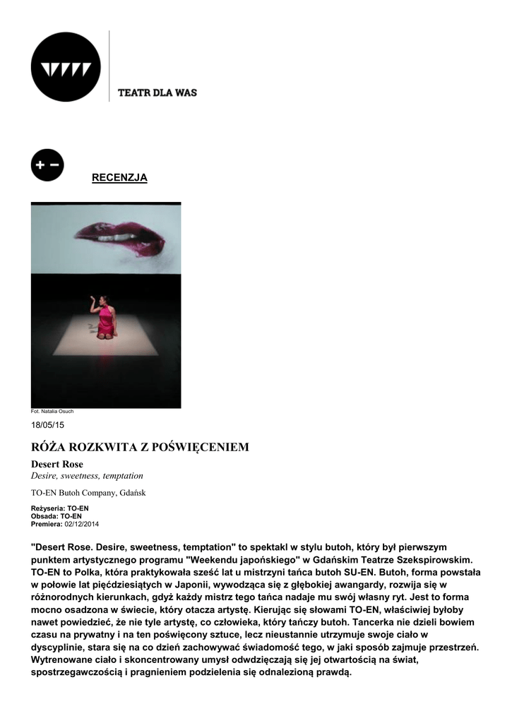 RECENZJA Fot. Natalia Osuch 18/05/15 RÓŻA ROZKWITA Z POŚWIĘCENIEM Desert Rose Desire, sweetness, temptation TO-EN Butoh Company, Gdańsk Reżyseria: TO-EN Obsada: TO-EN Premiera: 02/12/2014 "Desert Rose. Desire, sweetness, temptation" to spektakl w stylu butoh, który był pierwszym punktem artystycznego programu "Weekendu japońskiego" w Gdańskim Teatrze Szekspirowskim. TO-EN to Polka, która praktykowała sześć lat u mistrzyni tańca butoh SU-EN. Butoh, forma powstała w połowie lat pięćdziesiątych w Japonii, wywodząca się z głębokiej awangardy, rozwija się w różnorodnych kierunkach, gdyż każdy mistrz tego tańca nadaje mu swój własny ryt. Jest to forma mocno osadzona w świecie, który otacza artystę. Kierując się słowami TO-EN, właściwiej byłoby nawet powiedzieć, że nie tyle artystę, co człowieka, który tańczy butoh. Tancerka nie dzieli bowiem czasu na prywatny i na ten poświęcony sztuce, lecz nieustannie utrzymuje swoje ciało w dyscyplinie, stara się na co dzień zachowywać świadomość tego, w jaki sposób zajmuje przestrzeń. Wytrenowane ciało i skoncentrowany umysł odwdzięczają się jej otwartością na świat, spostrzegawczością i pragnieniem podzielenia się odnalezioną prawdą. Spektakl "Desert Rose" jest twórczą medytacją nad fenomenem pustynnej róży, kwiatu, który rozkwita nikomu niepotrzebnym – bo niedocenionym przez ludzkie oko – pięknem, po czym szybko ginie w ekstremalnie trudnych dla siebie warunkach. Tancerka wychodzi od tego egzotycznego motywu, jednak będąc osobą żyjącą uważnie tu i teraz, osadza ten obraz w świecie popkultury. Impulsem do stworzenia "Desert Rose" było zetknięcie z dziełami fotografika Davida LaChapelle'a, bacznego obserwatora świata popkultury. Sztuka TO-EN jest bardzo trudna w odbiorze, gdyż artystka wystawia widza na kontakt z przytłaczającą rzeczywistością. Wszechobecny obraz ciała, stylistyka glamour, kultura billboardu to nasza codzienność, która ukazana na scenie, przygniata. Kiedy zmuszeni jesteśmy skupić się na tym, co zwykle stanowi jedynie tło – obserwowane kątem oka reklamy, okładki czasopism, stylizacje mijanych na ulicy osób – nagle zaczynamy odbierać tę rzeczywistość jako warunki ekstremalne, jako naszą pustynię. Na całkiem pustej scenie TO-EN wystawia publiczność na działanie rażących świateł, głośnej muzyki w industrialnym stylu, tła i kostiumu w odcieniu agresywnego różu, ocierającego się o wulgarność video, czyli tego, co przywykliśmy omiatać wzrokiem. W tej wizji świata nie brakuje nawet gratisu dla każdego, słodkiej, ślicznej cukrowej różyczki w szeleszczącym celofanie, z kuszącą etykietką. Śmiało, spróbuj, jaka dobra. Nie widzisz, że jest doskonała? W tańcu TO-EN widać połączenie przeciwieństw. Każdy mikroruch ma znaczenie, a jednocześnie ciało działa w pewnym stopniu automatycznie, przedstawiając swoją własną prawdę. Nie chodzi ani o samo piękno, ani o popisy sprawności fizycznej. Obrazy nie są jednoznaczne, można je odczytać w różny sposób. Mnie umysł nie pozwolił oderwać się od doszukiwania się fabuły – w samym tańcu ujrzałam kolejno: zapuszczanie korzeni, grozę bliskiej śmierci i rozchylanie się kwiatu. Wyraźnych nawiązań do zachowań zwierząt i człowieka na poziomie racjonalnym nie udało mi się uporządkować, nie przeszkadzało to jednak, by te obrazy zadziałały równie mocno. Drgania powiek, ruch gałek ocznych, języka, dłoni, ułożenie stóp – całe ciało artystki to ciało z poświęceniem przekazujące treści, lecz równocześnie ciało z poświęceniem odbierające bodźce. Spektakl został dobrze rozplanowany w przestrzeni i w czasie. Silna ekspresja przeplatała się z momentami wyciemnienia i bierności, dzięki czemu emocje w widzach narastały stopniowo, w rzeczywiście imponującej skali, aż po chwile fizycznego strachu i chęci ucieczki. Potrzeba prawdziwego kunsztu, by z obserwacji mogącej się wydawać banalną, oraz z egzotycznego (kiczowatego?) obrazu pustynnej róży stworzyć tak mocną formę. I to formę, która ofiarowuje oczyszczającą treść. Recenzja spektaklu TO-EN Butoh Company pokazanego w Gdańskim Teatrze Szekspirowskim podczas "Weekendu japońskiego". http://www.gazetaswietojanska.org/index.php?id=2&t=1&page=50858 autor tekstu: Małgorzata Bierejszyk