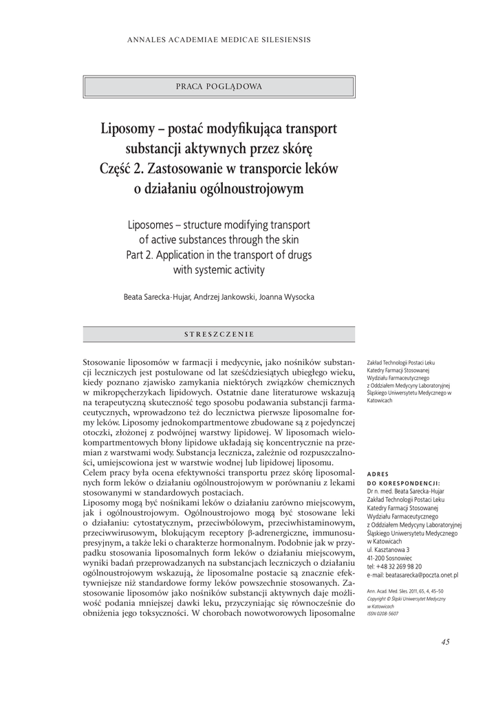 ANNALES ACADEMIAE MEDICAE SILESIENSIS PRACA POGLĄDOWA Liposomy – postać modyfikująca transport substancji aktywnych przez skórę Część 2. Zastosowanie w transporcie leków o działaniu ogólnoustrojowym Liposomes – structure modifying transport of active substances through the skin Part 2. Application in the transport of drugs with systemic activity Beata Sarecka-Hujar, Andrzej Jankowski, Joanna Wysocka STRESZCZENIE Stosowanie liposomów w farmacji i medycynie, jako nośników substancji leczniczych jest postulowane od lat sześćdziesiątych ubiegłego wieku, kiedy poznano zjawisko zamykania niektórych związków chemicznych w mikropęcherzykach lipidowych. Ostatnie dane literaturowe wskazują na terapeutyczną skuteczność tego sposobu podawania substancji farmaceutycznych, wprowadzono też do lecznictwa pierwsze liposomalne formy leków. Liposomy jednokompartmentowe zbudowane są z pojedynczej otoczki, złożonej z podwójnej warstwy lipidowej. W liposomach wielokompartmentowych błony lipidowe układają się koncentrycznie na przemian z warstwami wody. Substancja lecznicza, zależnie od rozpuszczalności, umiejscowiona jest w warstwie wodnej lub lipidowej liposomu. Celem pracy była ocena efektywności transportu przez skórę liposomalnych form leków o działaniu ogólnoustrojowym w porównaniu z lekami stosowanymi w standardowych postaciach. Liposomy mogą być nośnikami leków o działaniu zarówno miejscowym, jak i ogólnoustrojowym. Ogólnoustrojowo mogą być stosowane leki o działaniu: cytostatycznym, przeciwbólowym, przeciwhistaminowym, przeciwwirusowym, blokującym receptory ȕ-adrenergiczne, immunosupresyjnym, a także leki o charakterze hormonalnym. Podobnie jak w przypadku stosowania liposomalnych form leków o działaniu miejscowym, wyniki badań przeprowadzanych na substancjach leczniczych o działaniu ogólnoustrojowym wskazują, że liposomalne postacie są znacznie efektywniejsze niż standardowe formy leków powszechnie stosowanych. Zastosowanie liposomów jako nośników substancji aktywnych daje możliwość podania mniejszej dawki leku, przyczyniając się równocześnie do obniżenia jego toksyczności. W chorobach nowotworowych liposomalne Zakład Technologii Postaci Leku Katedry Farmacji Stosowanej Wydziału Farmaceutycznego z Oddziałem Medycyny Laboratoryjnej Śląskiego Uniwersytetu Medycznego w Katowicach ADRES D O KO R E S P O N D E N C J I : Dr n. med. Beata Sarecka-Hujar Zakład Technologii Postaci Leku Katedry Farmacji Stosowanej Wydziału Farmaceutycznego z Oddziałem Medycyny Laboratoryjnej Śląskiego Uniwersytetu Medycznego w Katowicach ul. Kasztanowa 3 41-200 Sosnowiec tel: +48 32 269 98 20 e-mail: [email protected] Ann. Acad. Med. Siles. 2011, 65, 4, 45–50 Copyright © Śląski Uniwersytet Medyczny w Katowicach ISSN 0208-5607 45 ANNALES ACADEMIAE MEDICAE SILESIENSIS formy cytostatyków minimalizują powstałe podczas chemioterapii uszkodzenia niezmienionych komórek i tkanek. S Ł O WA K L U C Z O W E liposomy, transport przez skórę, leki o działaniu ogólnoustrojowym A B S T R AC T The use of liposomes in pharmacy and medicine, as carriers of therapeutic substances, was postulated since the 60’s last century, when phenomenon of the closing of certain chemical compounds in lipid microvessicle was found. Recent literature data indicated that the therapeutic effectiveness of this method of administration of pharmaceutical substances is suitable. First liposomal forms of drugs were introduced already to the treatment. Liposomes with single compartment are composed of a single envelope, consisting of a lipid bilayer. In the liposomes with multi-compartments lipid membranes are arranged concentrically with alternating layers of water. Drug substance, depending on the solubility, is located in the water layer or the lipid layer of the liposome. The aim of this study was to assess the efficiency of transport through the skin the liposomal forms of drugs with systemic activity compared to drugs used in standard forms. Liposomes can be used as carriers of drugs with systemic activity e.g.: cytostatics, analgetics, antihistamines, antiviral, substances of hormonal nature, ȕ-blockers and immunosuppressive drugs. As in the case of application liposomal forms of drugs with local activity, literature data conducted on substances with systemic activity indicated that the liposomal forms are much more efficient than standard forms of commonly used drugs. Application of liposomes as carriers of drugs allows using the lower dose of the drug, and leads to a reduction of its toxicity. The damages incurred in the unchanged cells and tissues were significantly minimized when the liposomal form of cancer cytostatics was used. KEY WORDS liposomes, transport through the skin, drugs with systemic activity LIPOSOMY – WŁAŚCIWOŚCI I M E T O D Y O T R Z Y M Y WA N I A Liposomy to sferyczne lub owalne struktury wodno-lipidowe, stanowiące mikrorezerwuar substancji leczniczej o wymiarach od 0,01 do 1,0 μm. Z uwagi na wielkość pęcherzyków oraz liczbę warstw otoczki, dzieli się je na jednoi wielowarstwowe. Liposomy jednowarstwowe: małe (SUV 20–50 nm) i duże (LUV > 100 nm), stosowane jako nośniki substancji aktywnych, zawierają pojedynczą otoczkę złożoną z podwójnej warstwy lipidowej, określane są skrótem ULV i obejmują szeroki zakres wielkości od 20 do 1000 nm. W trakcie wytwarzania liposomów pojawiają się również liposomy wielokompartmentowe, zawierające kilkuwarstwowe pęcherzyki o wymiarach 0,1–10 μm. Błony lipidowe układają 46 się koncentrycznie na przemian z warstwami wody, a substancja lecznicza, zależnie od rozpuszczalności, umiejscowiona jest w warstwie wodnej lub lipidowej liposomu. Najważniejszymi komponentami lipidowymi do otrzymywania liposomów są lecytyny, sfingolipidy oraz lipidy obojętne. Od momentu odkrycia liposomów opracowano wiele metod ich otrzymywania. Najprostszy sposób, przedstawion
